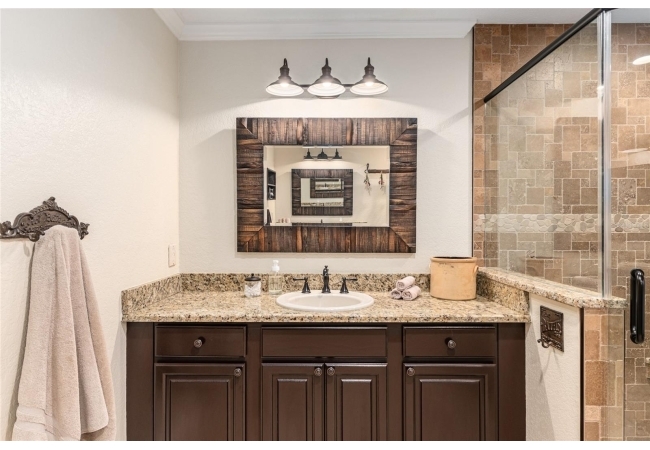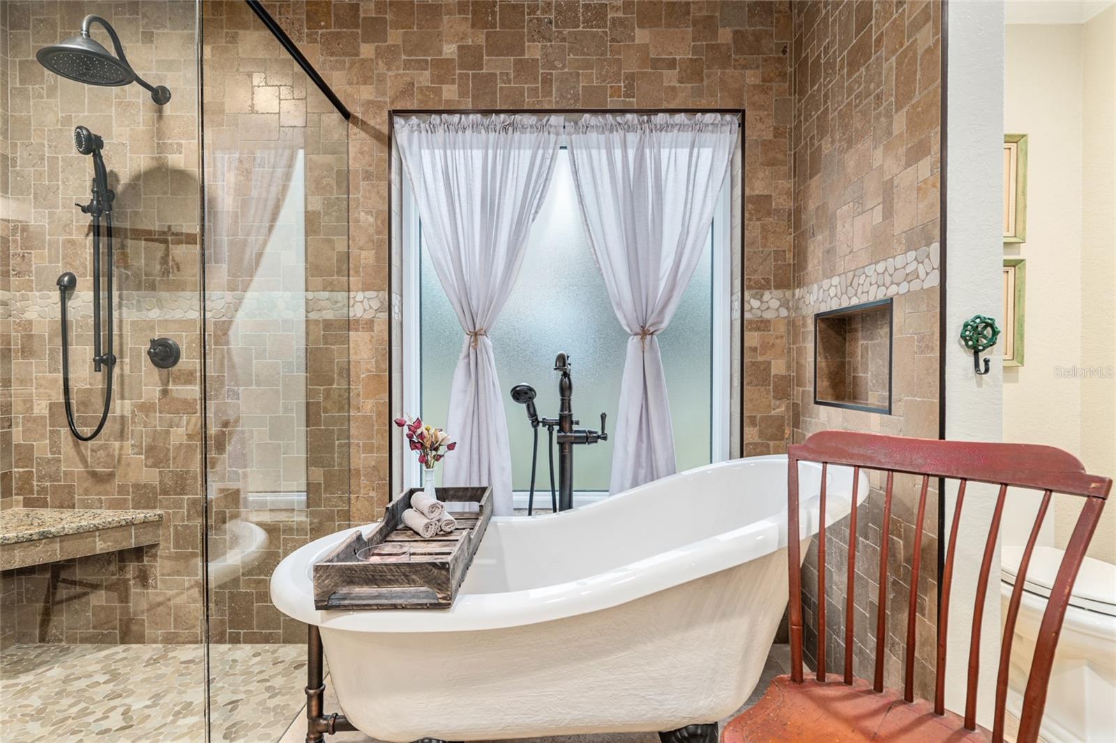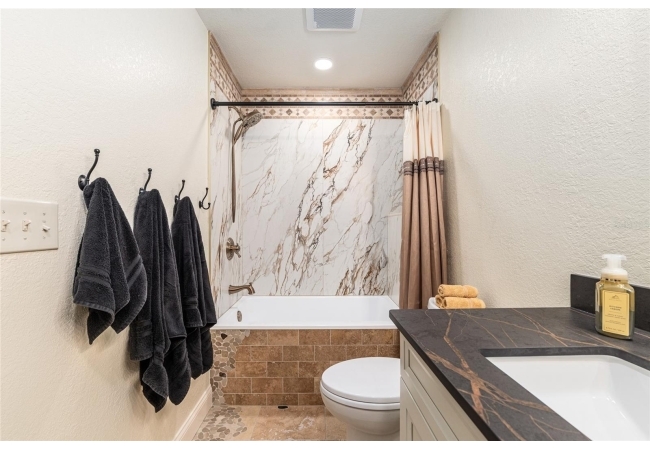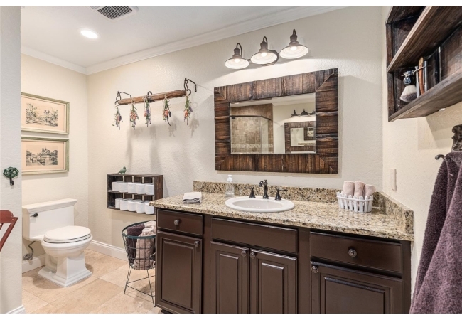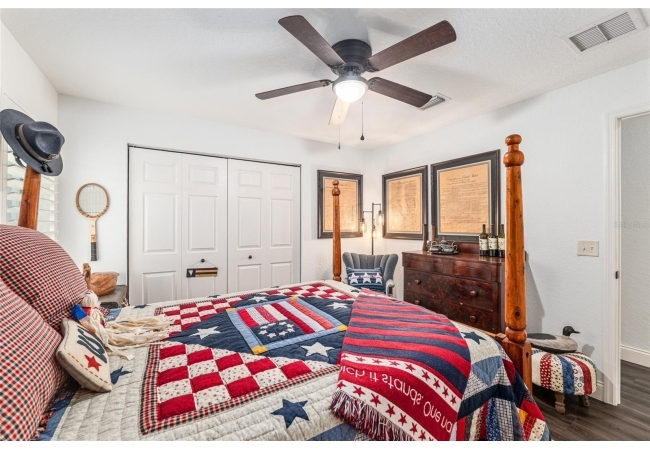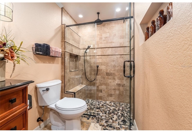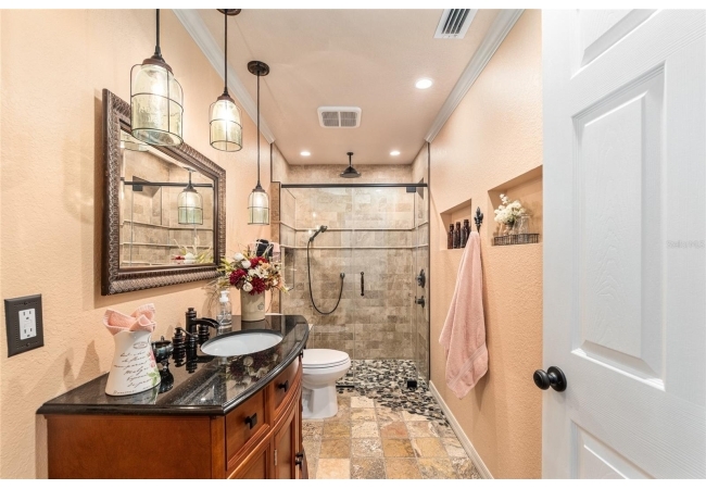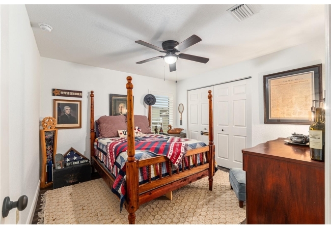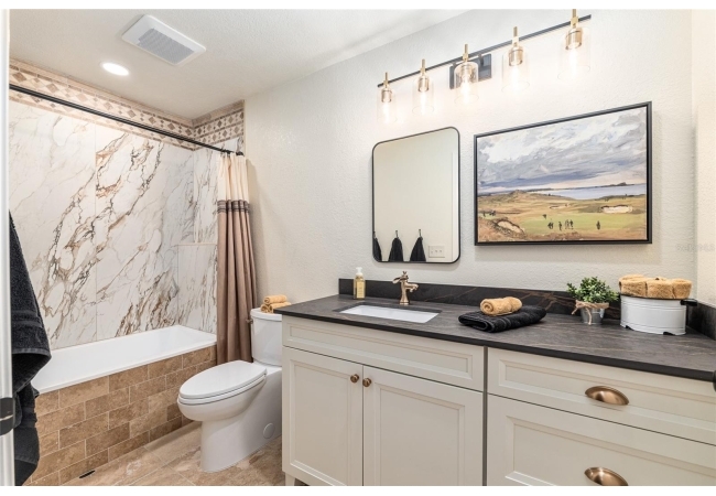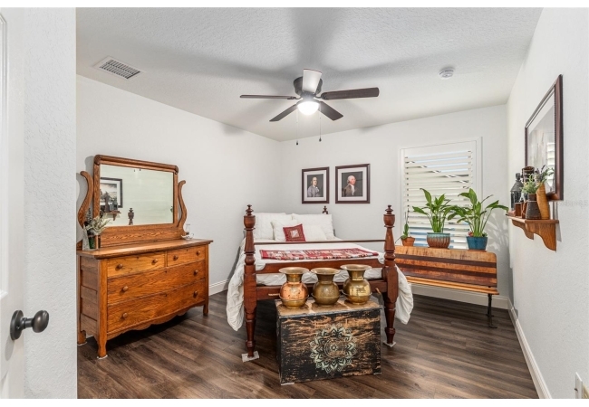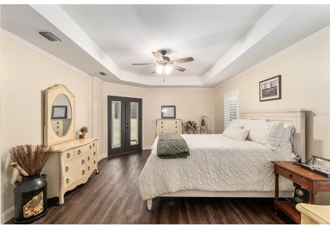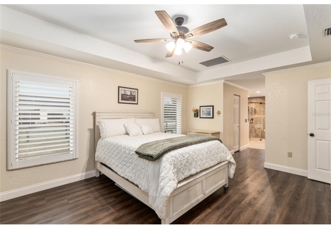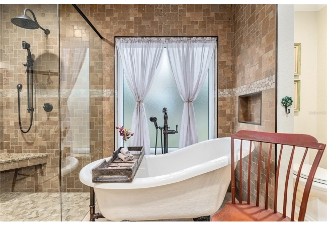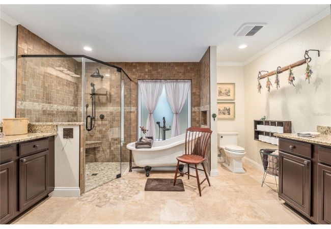 The primary suite continues the theme of understated luxury, featuring a coffered tray ceiling, private patio access, and dual walk-in closets. The spa-inspired ensuite bath offers a five-piece layout with granite counters, dual vanities, a soaking clawfoot tub, and a walk-in shower—designed for comfort and retreat. Secondary bedrooms are equally intentional, while a beautifully appointed third bath provides a serene oasis for guests or family. AAdditional highlights include a versatile bonus room that can serve as a fourth bedroom or home office, updated lighting and ceiling fans, new interior plantation shutters, a convenient indoor laundry room, and an exceptional garage with epoxy-coated floors—ideal for storage, hobbies, or a functional workspace. Outside, a covered back porch invites relaxation and effortless entertaining. With multiple living spaces, a flexible split floor plan, and an impressive list of high-quality updates, this home offers a refined yet practical lifestyle—thoughtfully designed for everyday ease and long-term value. Schedule your private showing today and experience the best of Florida living.