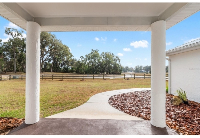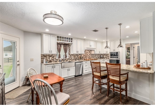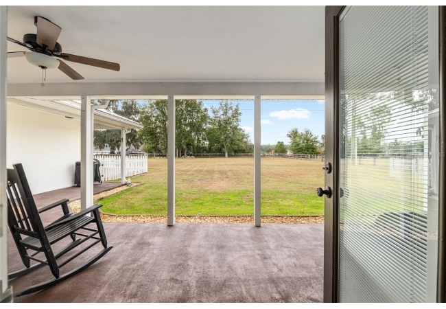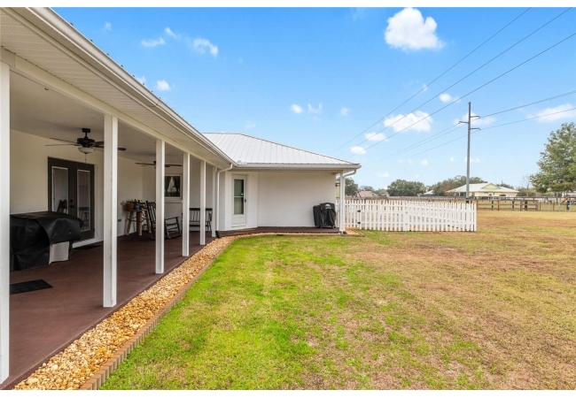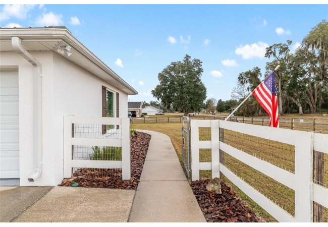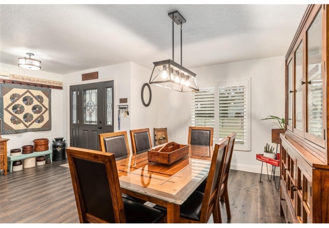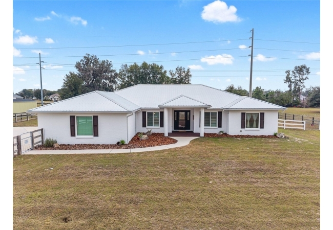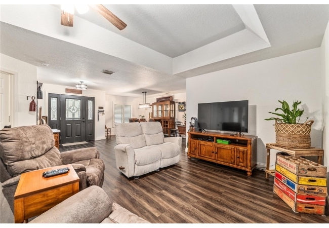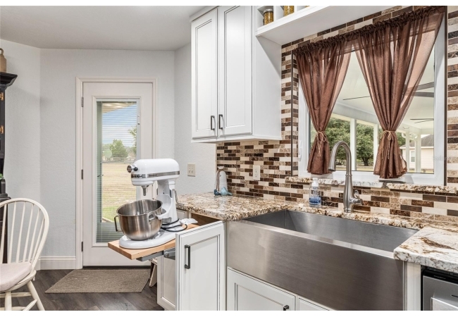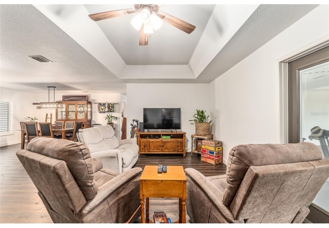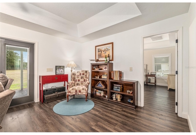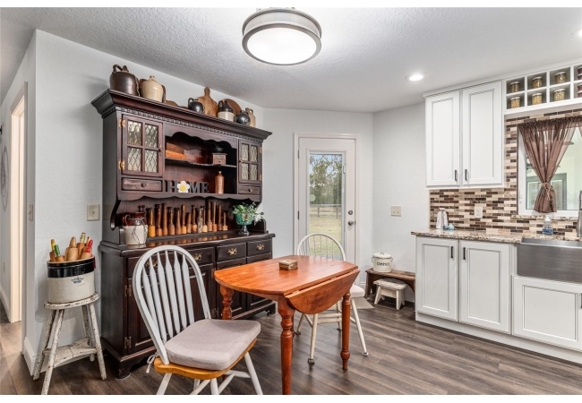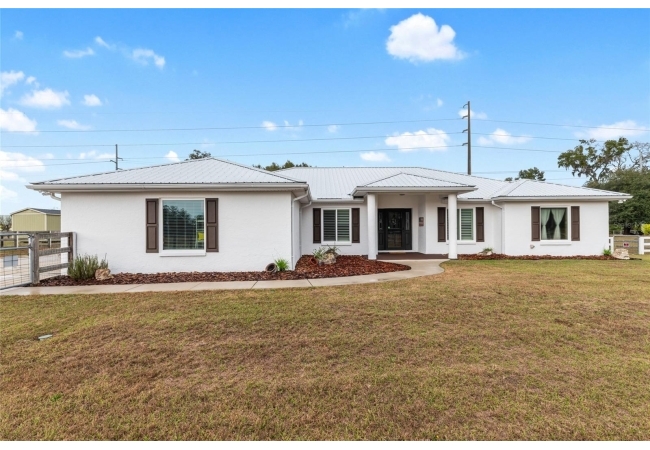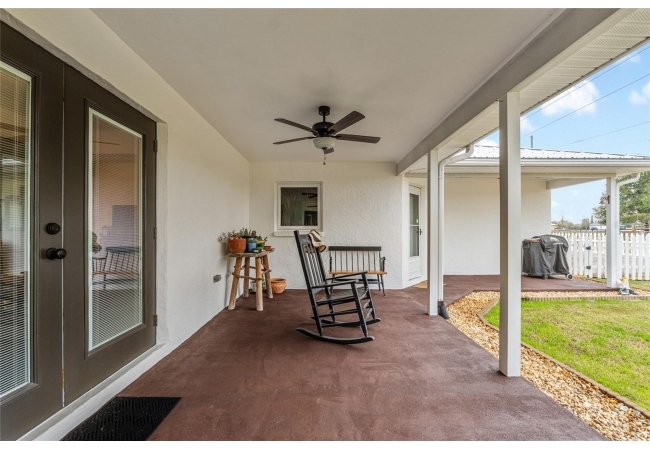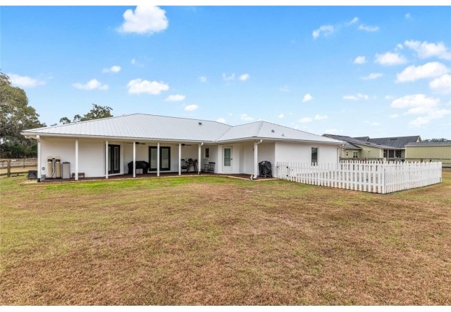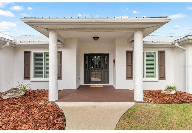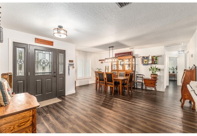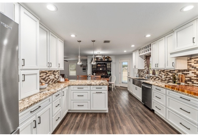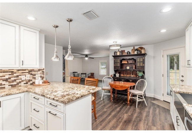 A crisp white single-story profile rests quietly against a backdrop of lush greenery and mature trees, offering a sense of privacy and calm while remaining just minutes from the Springs. Set on a generous, fully fenced lot, this move-in-ready single-family home balances serenity with thoughtful modern upgrades designed for lasting comfort and peace of mind. Recent improvements include a brand-new metal roof (2022) and all-new energy-efficient windows and exterior doors, creating a solid foundation for low-maintenance Florida living. Additional enhancements such as a newer electric water heater (2024), water softener, GenerLink generator hookup, rain gutters, and fresh interior and exterior paint underscore the home’s exceptional level of care and preparedness. Inside, rich deep-tone plank flooring anchors the home with warmth and elegance, creating effortless flow from room to room. The entry opens into a refined dining space where tailored plantation shutters filter natural light and a modern chandelier sets a confident, design-forward tone. Nearby, the main living room unfolds beneath a coffered tray ceiling, bathed in light and framed by glass doors that lead to the backyard—open and expansive, yet inviting moments of connection and pause. A second living area adjoins the kitchen, offering flexibility for entertaining, media use, or a quiet retreat. The custom chef-inspired kitchen is both stylish and enduring, featuring granite countertops, clean white cabinetry, a vented cooktop, convection oven, brand-new dishwasher, stainless steel appliances, and a farmhouse-style sink. Thoughtful details include concealed appliance storage, generous prep space, and a breakfast bar peninsula that naturally encourages gathering. A petite eat-in nook with direct yard access enhances everyday living and indoor-outdoor flow.