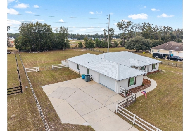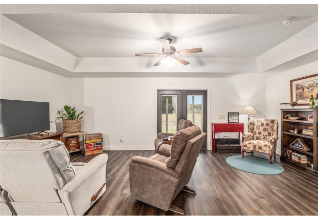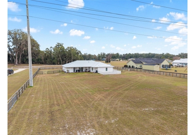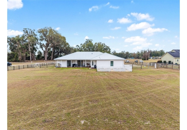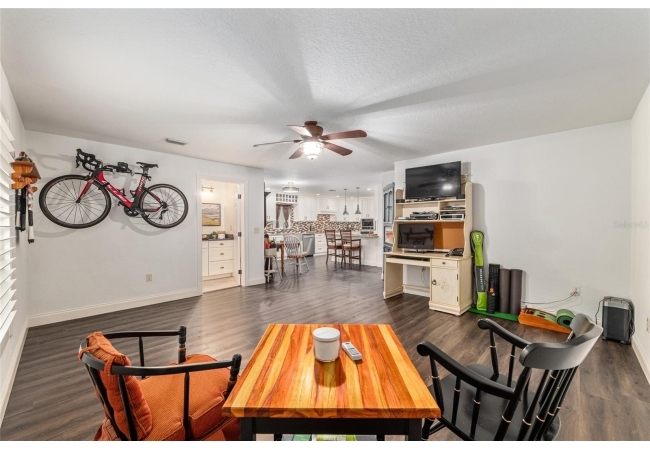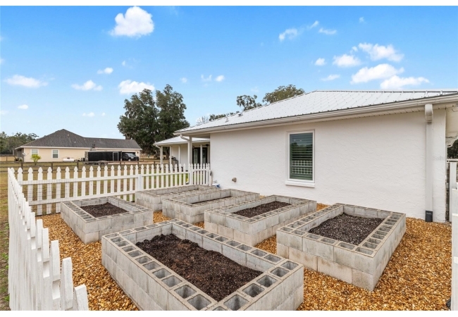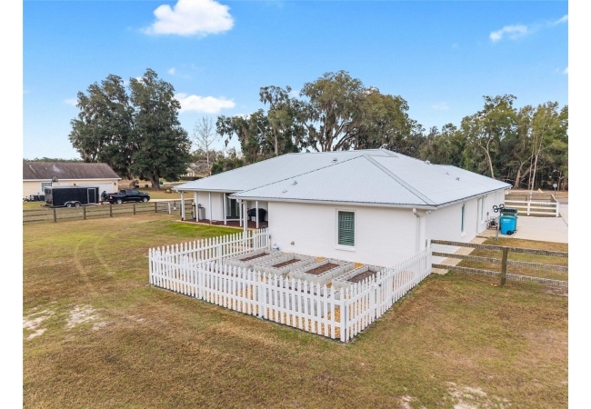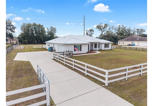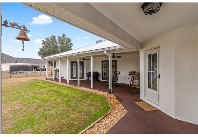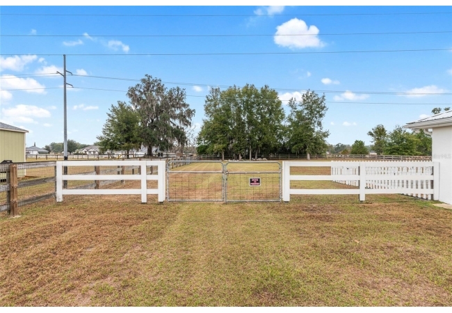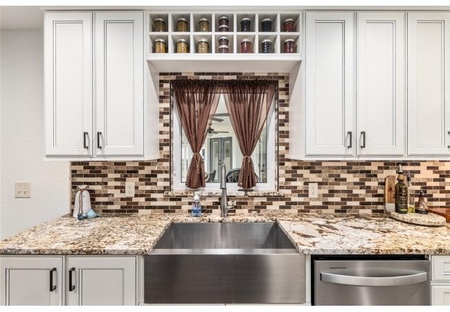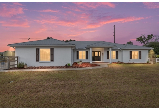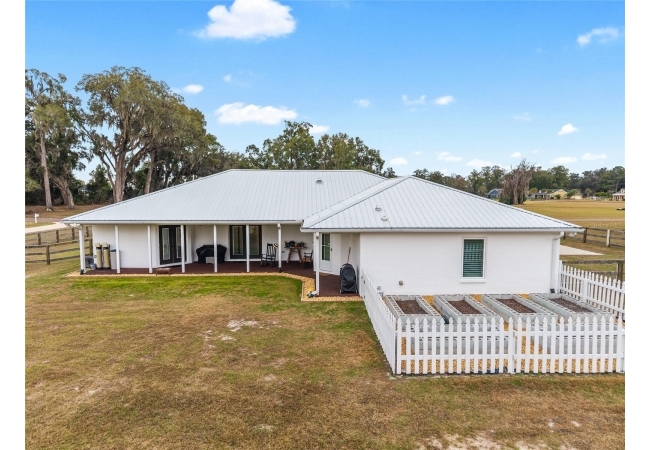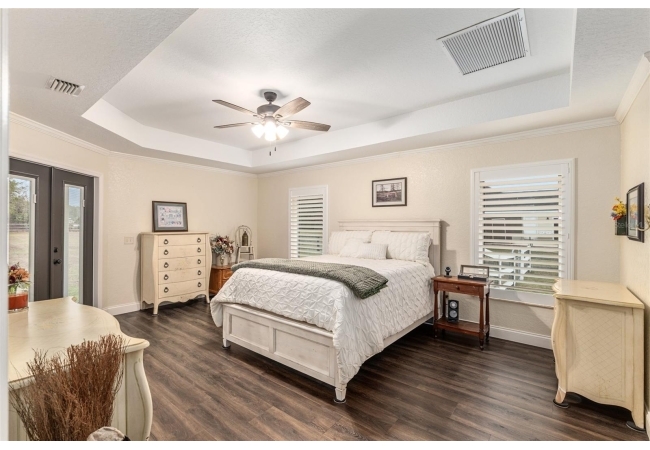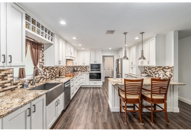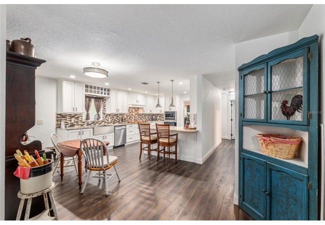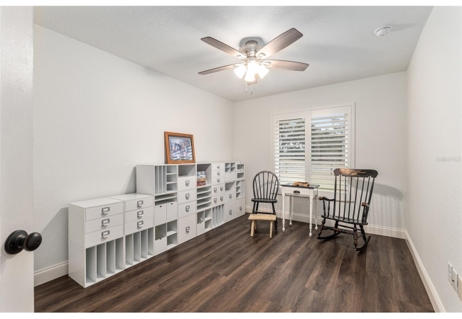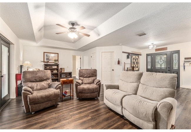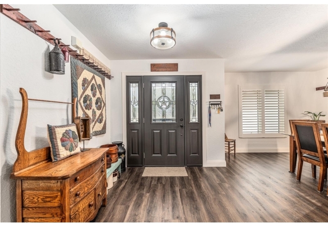 A crisp white single-story profile rests quietly against a backdrop of lush greenery and mature trees, offering a sense of privacy and calm while remaining just minutes from the Springs. Set on a generous, fully fenced lot, this move-in-ready single-family home balances serenity with thoughtful modern upgrades designed for lasting comfort and peace of mind. Recent improvements include a brand-new metal roof (2022) and all-new energy-efficient windows and exterior doors, creating a solid foundation for low-maintenance Florida living. Additional enhancements such as a newer electric water heater (2024), water softener, GenerLink generator hookup, rain gutters, and fresh interior and exterior paint underscore the home’s exceptional level of care and preparedness. Inside, rich deep-tone plank flooring anchors the home with warmth and elegance, creating effortless flow from room to room. The entry opens into a refined dining space where tailored plantation shutters filter natural light and a modern chandelier sets a confident, design-forward tone. Nearby, the main living room unfolds beneath a coffered tray ceiling, bathed in light and framed by glass doors that lead to the backyard—open and expansive, yet inviting moments of connection and pause. A second living area adjoins the kitchen, offering flexibility for entertaining, media use, or a quiet retreat. The custom chef-inspired kitchen is both stylish and enduring, featuring granite countertops, clean white cabinetry, a vented cooktop, convection oven, brand-new dishwasher, stainless steel appliances, and a farmhouse-style sink. Thoughtful details include concealed appliance storage, generous prep space, and a breakfast bar peninsula that naturally encourages gathering. A petite eat-in nook with direct yard access enhances everyday living and indoor-outdoor flow.