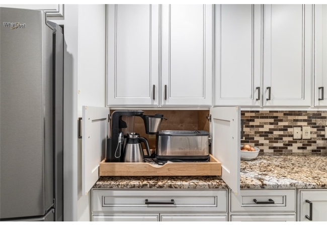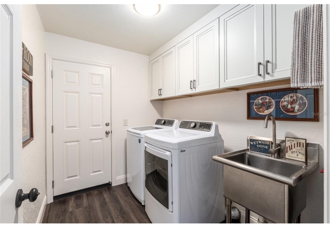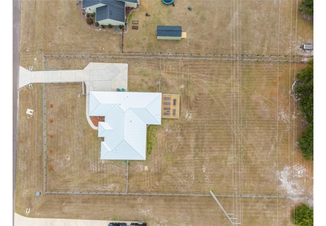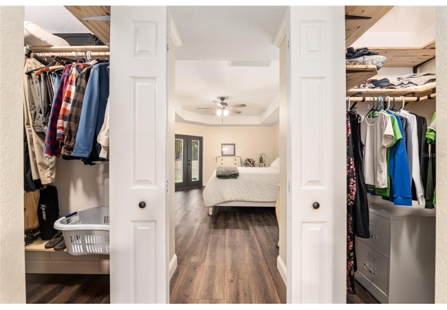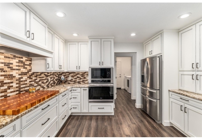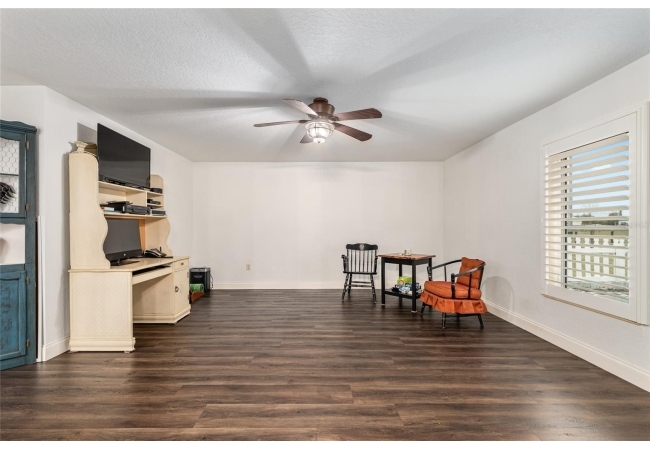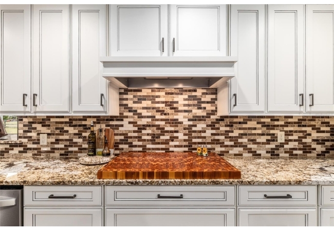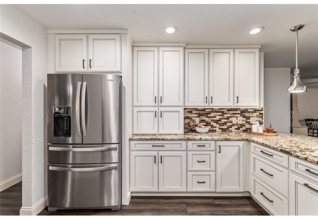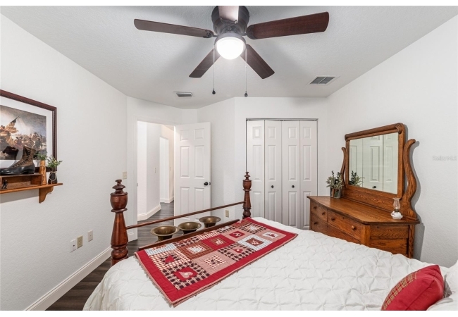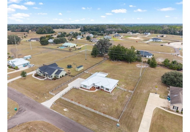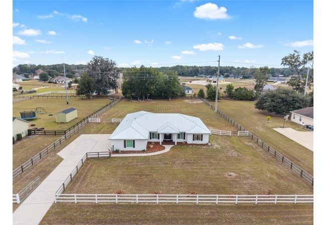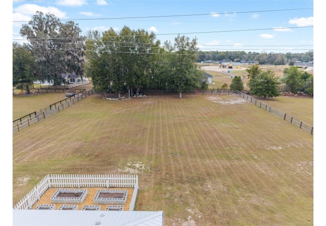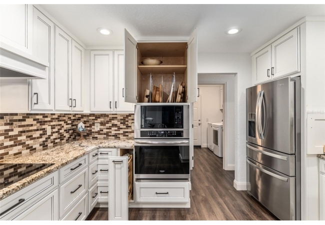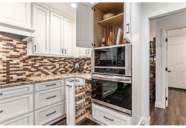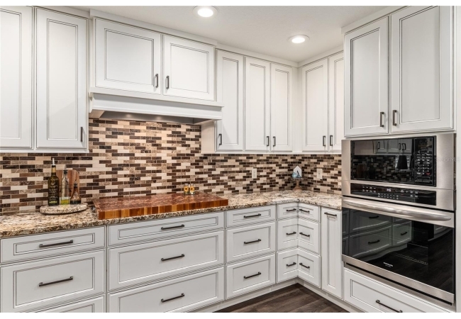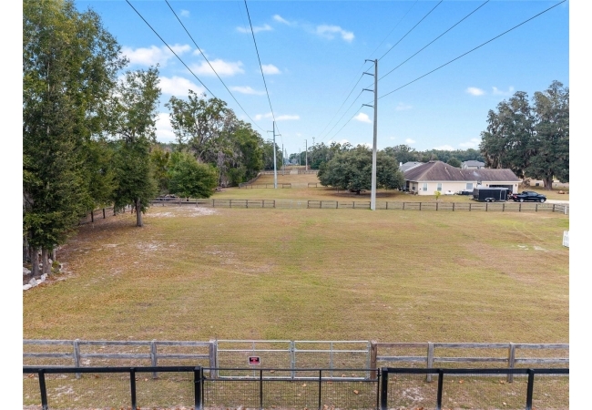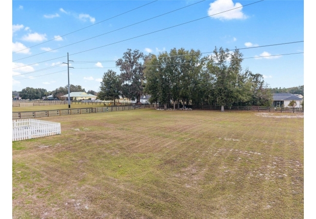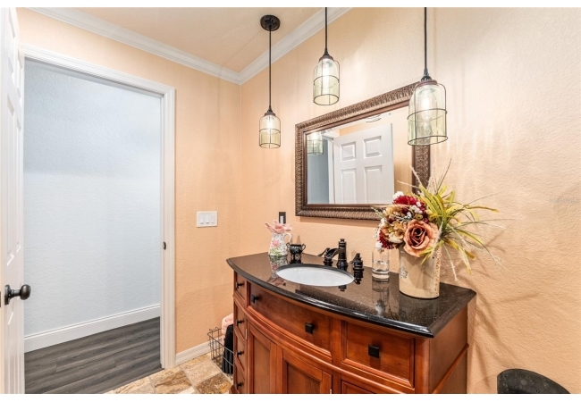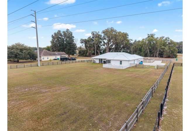A crisp white single-story profile rests quietly against a backdrop of lush greenery and mature trees, offering a sense of privacy and calm while remaining just minutes from the Springs. Set on a generous, fully fenced lot, this move-in-ready single-family home balances serenity with thoughtful modern upgrades designed for lasting comfort and peace of mind. Recent improvements include a brand-new metal roof (2022) and all-new energy-efficient windows and exterior doors, creating a solid foundation for low-maintenance Florida living. Additional enhancements such as a newer electric water heater (2024), water softener, GenerLink generator hookup, rain gutters, and fresh interior and exterior paint underscore the home’s exceptional level of care and preparedness. Inside, rich deep-tone plank flooring anchors the home with warmth and elegance, creating effortless flow from room to room. The entry opens into a refined dining space where tailored plantation shutters filter natural light and a modern chandelier sets a confident, design-forward tone. Nearby, the main living room unfolds beneath a coffered tray ceiling, bathed in light and framed by glass doors that lead to the backyard—open and expansive, yet inviting moments of connection and pause. A second living area adjoins the kitchen, offering flexibility for entertaining, media use, or a quiet retreat. The custom chef-inspired kitchen is both stylish and enduring, featuring granite countertops, clean white cabinetry, a vented cooktop, convection oven, brand-new dishwasher, stainless steel appliances, and a farmhouse-style sink. Thoughtful details include concealed appliance storage, generous prep space, and a breakfast bar peninsula that naturally encourages gathering. A petite eat-in nook with direct yard access enhances everyday living and indoor-outdoor flow.