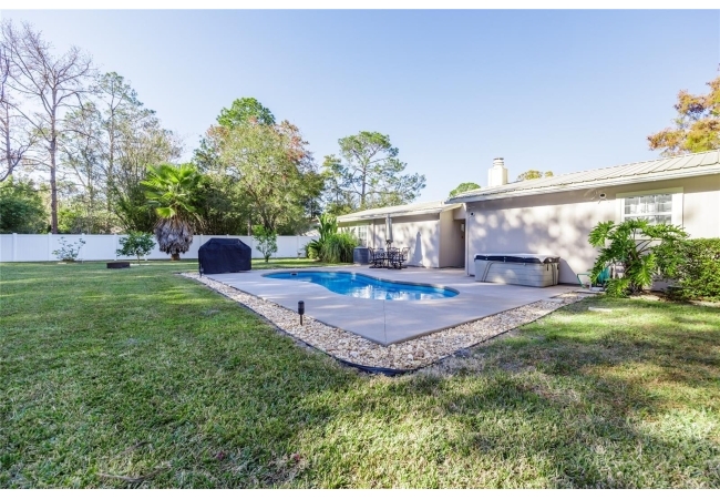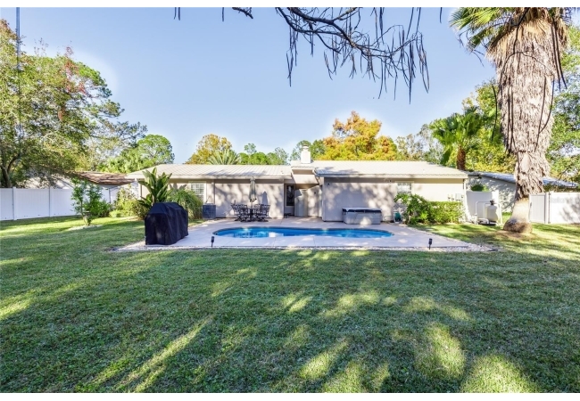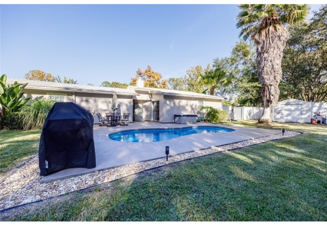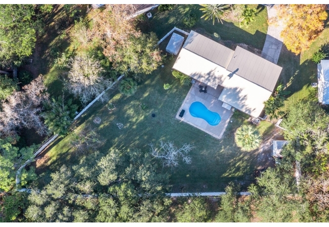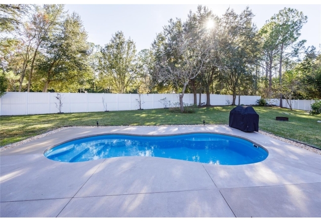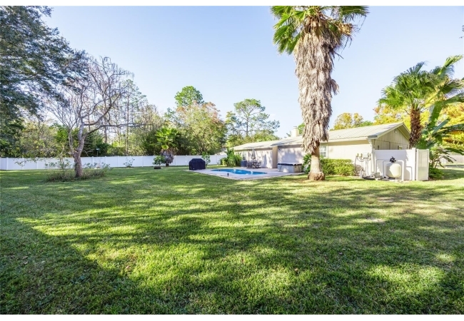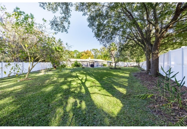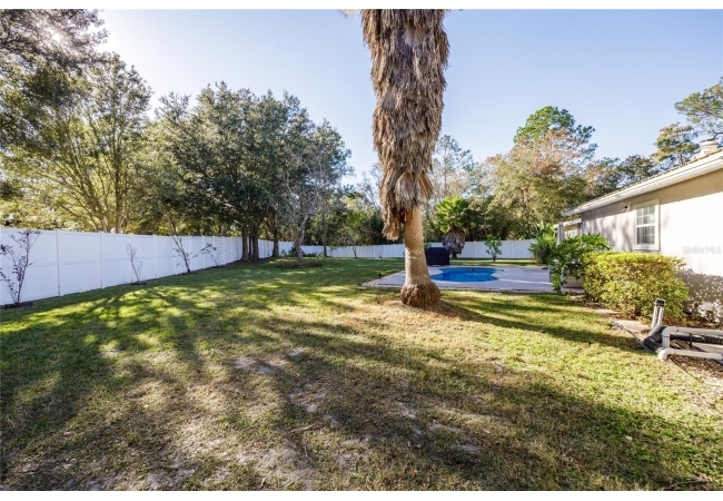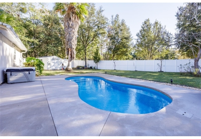 Step out back, and you’re transported to a private oasis that feels like a luxurious retreat right in your own yard. This expansive space boasts a stunning in-ground fiberglass saltwater pool with sleek concrete decking, perfect for lazy summer laps or lively gatherings, surrounded by lush, mature fruit trees including mulberry, grapefruit, orange, fig, peach, and lemon producing harvests and shaded serenity. A large shed offers ample storage for tools, pool gear, etc., while the crisp white vinyl privacy fencing encloses the area in peaceful seclusion. The yard also backs up to a community park, blending your personal paradise with easy access to nature and recreation. With room to dream big, whether it’s a fire pit, outdoor kitchen, or playground, this backyard isn’t just an amenity; it’s an invitation to create lasting memories under the Florida sun.