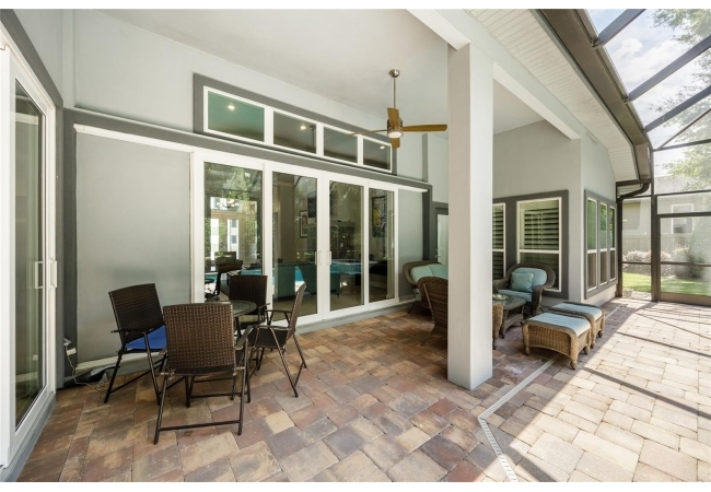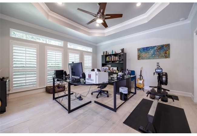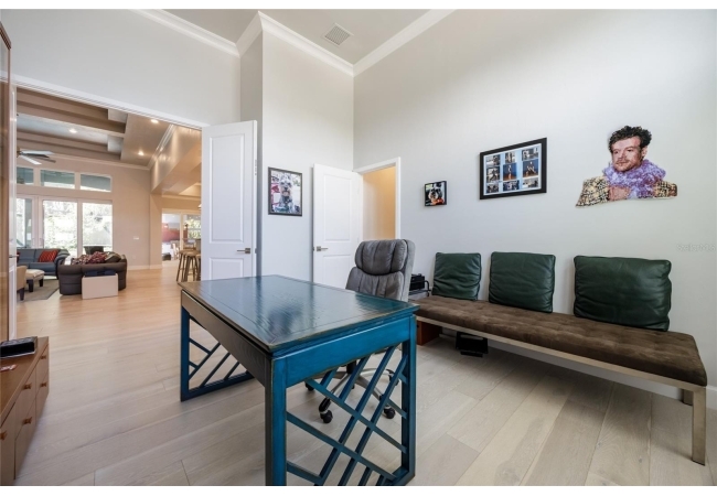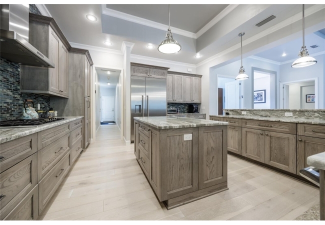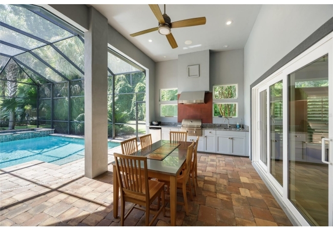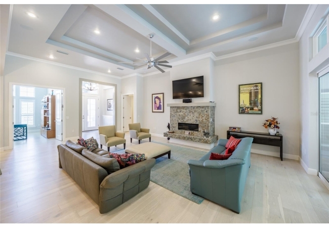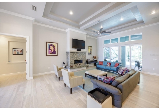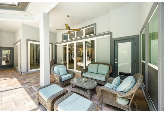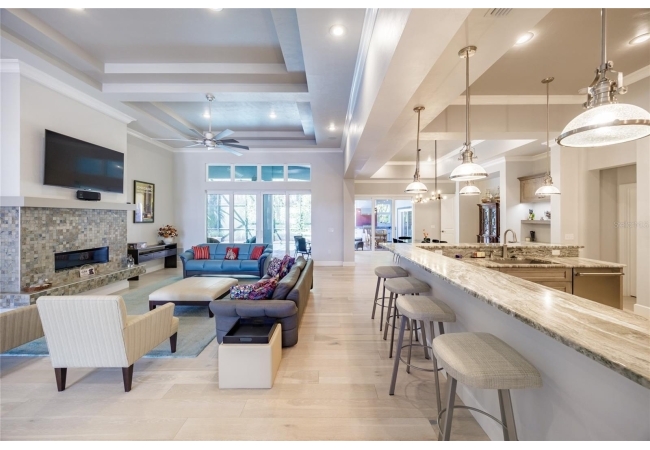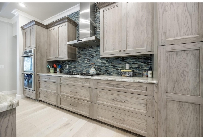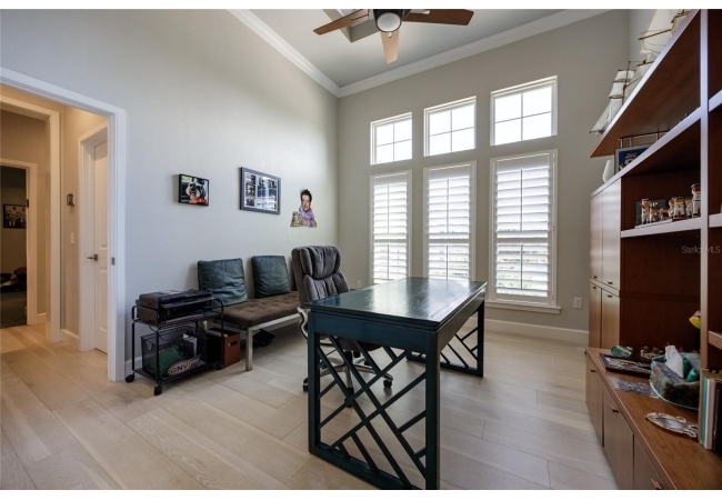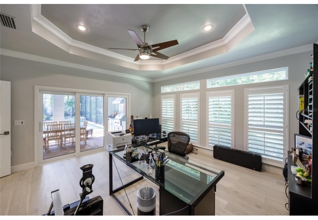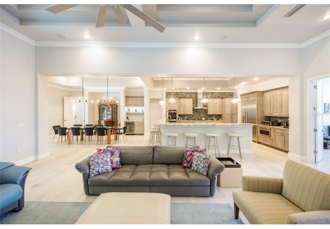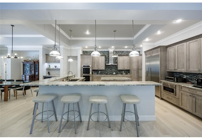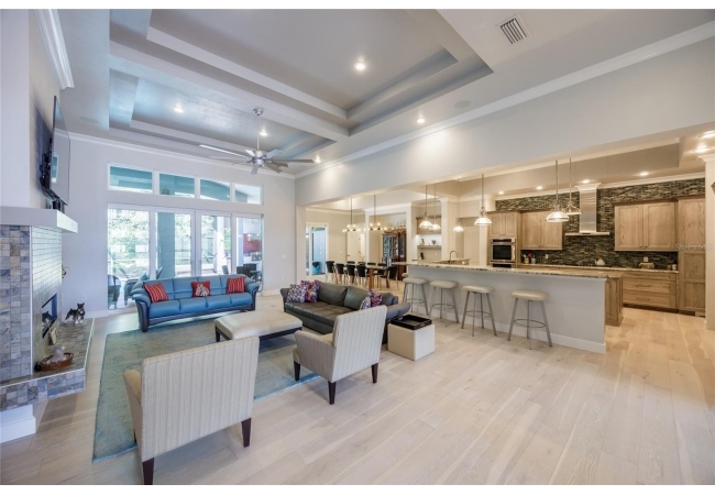 Elegance abounds in this custom-built 5-bedroom 4-bath executive pool home in the Estates of Wilds Plantation. A broad walkway of pavers leads to the oversized double glass entry doors that open onto the foyer. The great room has trey ceilings, crown moldings, recessed can lighting, a large tiled fireplace and sliding glass doors that allow full access to the screened pool area. The large open kitchen is a chef's delight, with wood cabinets and granite counter tops. A large central island and a wrap-around breakfast bar that seats eight, provide abundant space for meal preparation and casual dining. Deep drawers and pull-out shelves provide ample storage for dishes, utensils, pots and pans. The stainless-steel refrigerator/freezer, double wall ovens, 5 burner gas cooktop, dishwasher and microwave are all Thermador appliances. An alcove, adjacent to the dining area, has a wine refrigerator and storage for bar supplies. The house has a three-way split plan, providing maximum privacy for family members and overnight guests. The owner’s suite boasts two over-sized walk-in closets, with built-in shelves and drawers. There is also an alcove with space for a love seat, a writing desk or exercise equipment. The luxurious bathroom has dual vanities, a large walk-in shower with multiple shower heads, and an inviting soaking tub. The second and third bedrooms share a bathroom, as do the fourth and fifth bedrooms. The fifth bedroom could also be a game room or a large home office. A private study is accessed through French doors near the front of the house and is adjacent to a guest bathroom. The utility room has an entire wall of counters and cabinets, a laundry sink, built-in ironing board and a Whirlpool washer and dryer. There's a "drop area" for jackets, backpacks, and sports equipment as you approach the 3-car garage. A quiet luxury abounds in the screened pool area, with an outdoor kitchen, complete with refrigerator sink and gas grill, and a covered space for lounging and dining. Patio pavers surround the hot tub and pool, which has a "current generator" that allows you to swim in place. The house is surrounded by lush landscaping, with many flowering trees and shrubs, and a dense screen of vegetation along the rear of the property. The Estates of Wilds Plantation is just a few minutes away from shopping and Lawton Chiles Elementary school, and conveniently located to North Florida Regional Medical Center, the University of Florida and the UF Medical Center.