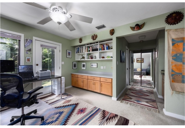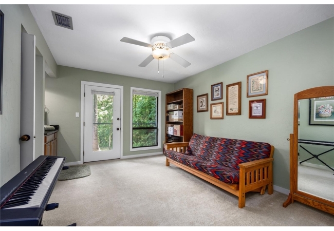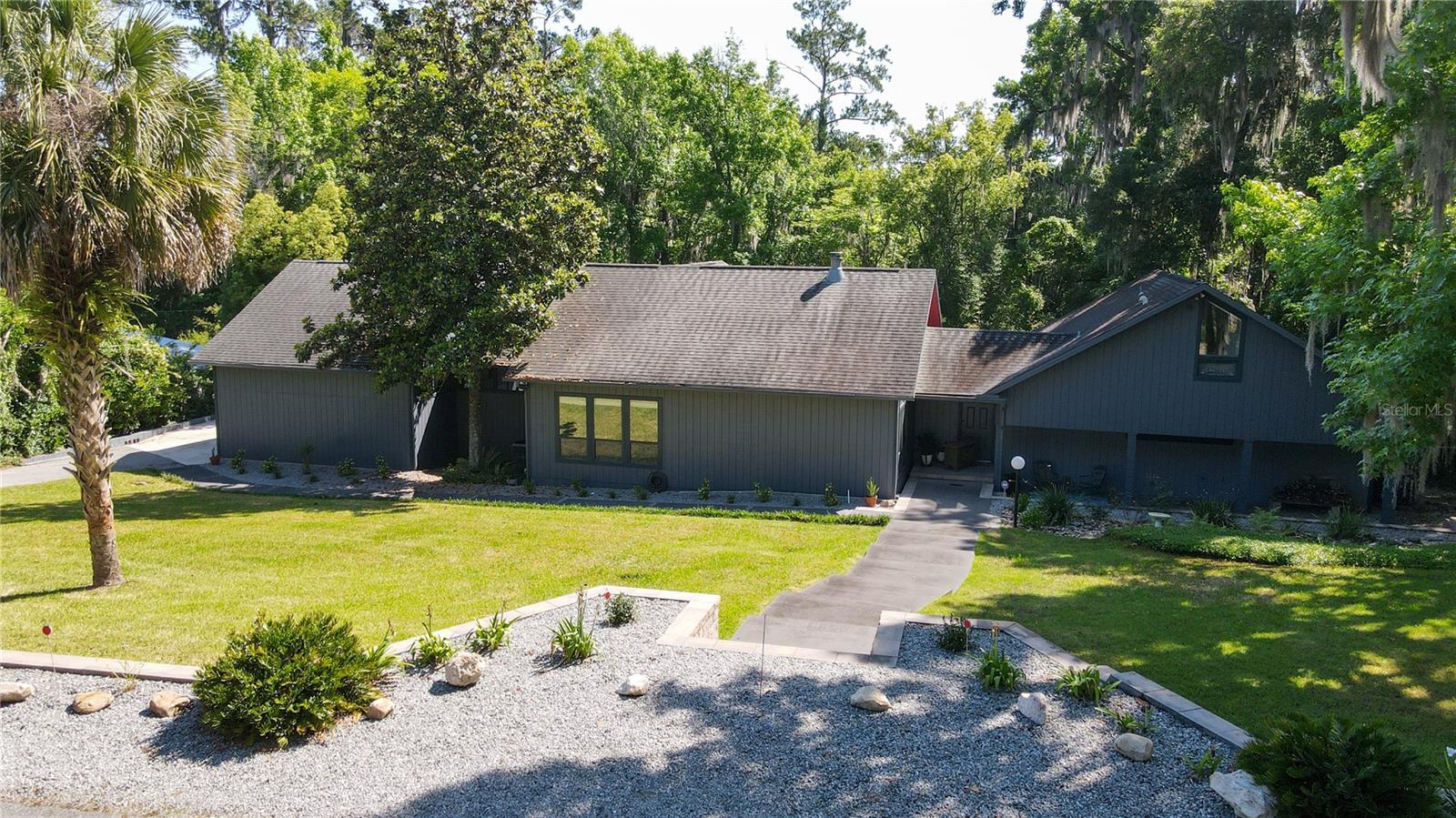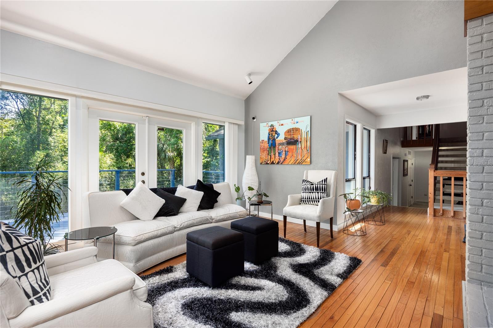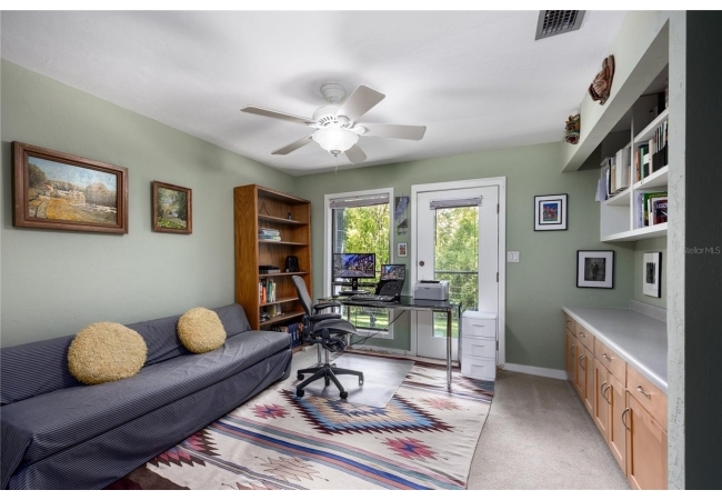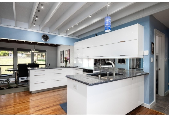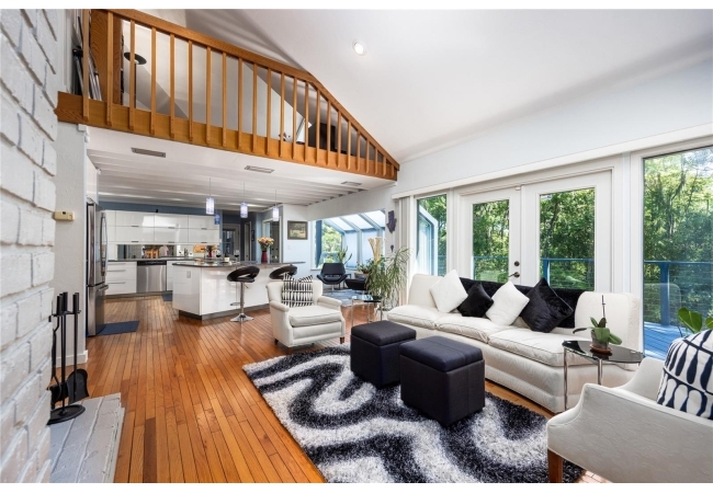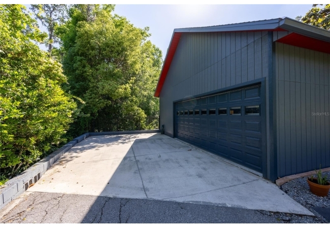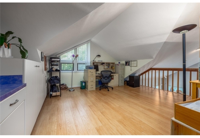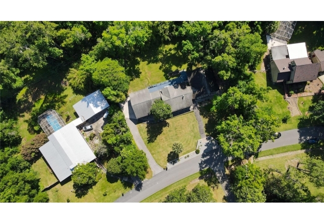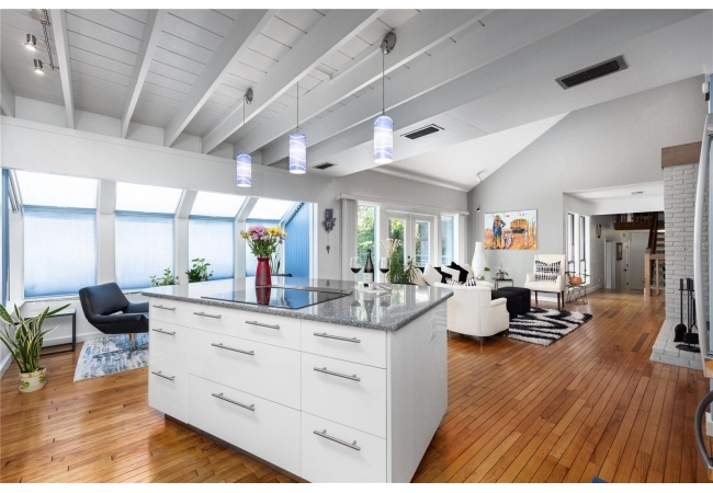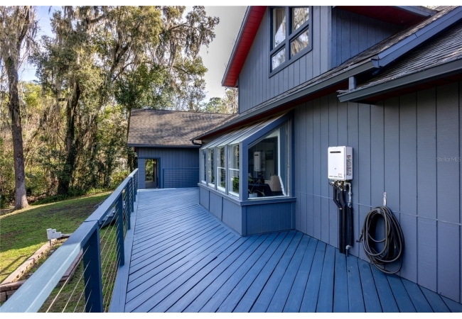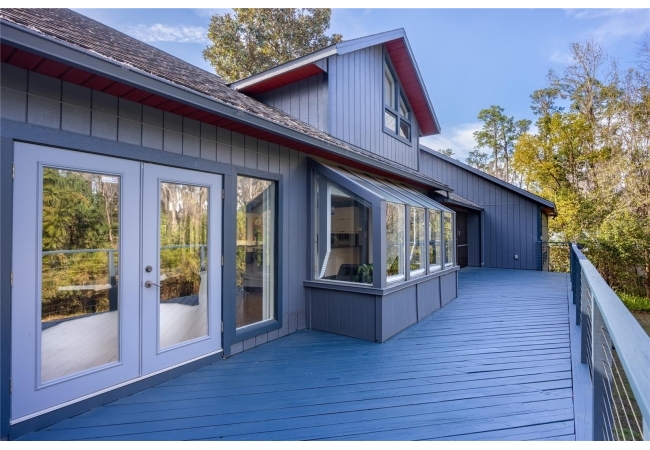 Amazing Scandinavian Modern home that combines minimalist design, sleek lines and yet remains warm and inviting. This 3 bedroom plus loft, 2.5 bathroom home, built in 1981, has only had 3 owners. Impeccably maintained, you will love the close proximity to the University of Florida, Shands/UF Health, PK Younge and downtown Gainesville. Yet its' location in the neighborhood makes this home a quiet and peaceful retreat on a cul-de-sac street. Walk to nearby Sweetwater Wetlands Park and Bivens Arm Nature Park. From the covered front entry, you step into the foyer. The home is divided into living and sleeping wings with an amazing Chef's Kitchen playing center stage. To your left is the Family Room with dramatic high ceilings, beautiful heart pine wood floors, soaring wood burning stove and banks of windows for a ton of natural light. The Family Room is open to the modern Kitchen with breakfast bar, breakfast nook, quartz counter tops, stainless steel appliances, induction cooktop and ample storage space. The breakfast nook is perfect for your morning coffee with a wall of floor to ceiling windows overlooking the deck and beautiful backyard. Just off the Kitchen is a half bathroom and a laundry room with washer and dryer, laundry tub and cabinets for extra storage. Also off the Kitchen is a screened breezeway that leads to the deck and the oversized two car, side entry garage. There is a large workshop and a darkroom, plenty of space if you needed an ADU or attached in-law suite The home has central vacuum. Roof is 2009. Two HVAC systems. Two septic systems. Tankless water heater for living spaces and separate water heater for the bedrooms. Step through the Kitchen to a Dining Area. This space is open to the Living Room with high ceilings and built-in bookshelves. There is a circular staircase that leads to a loft space full of natural light with built-in storage, sink and is perfect for an artist or home office. Back at the Foyer, if you turn right and go upstairs you arrive at the Primary Suite. This very large space with high ceilings has an ensuite bathroom that has been updated with wood cabinetry, double sink vanity and granite countertops. There is a separate shower and water closet. This home is absolutely full of storage space and the primary suite has a wall of closets with room for dressers and custom shelving. Downstairs has a flex space with transom windows that is currently used for workout equipment, but could easily be a homework station of in-law suite living area. The first bedroom has a built-in bookshelf, updated lighting and separate entrance to the rear wood deck. There is a Jack and Jill Bathroom that the guest rooms share with a tub/shower and water closet, but each room has its own vanity and sink. No more fighting over mirror time! The second guest bedroom has its own access to the rear deck as well. The large rear deck spans the back of the home and has updated railings and was expanded by the current owners. The home sits on an oversized lot of .75 acres and is fenced. There are vegetable beds and a low maintenance garden. No HOA.