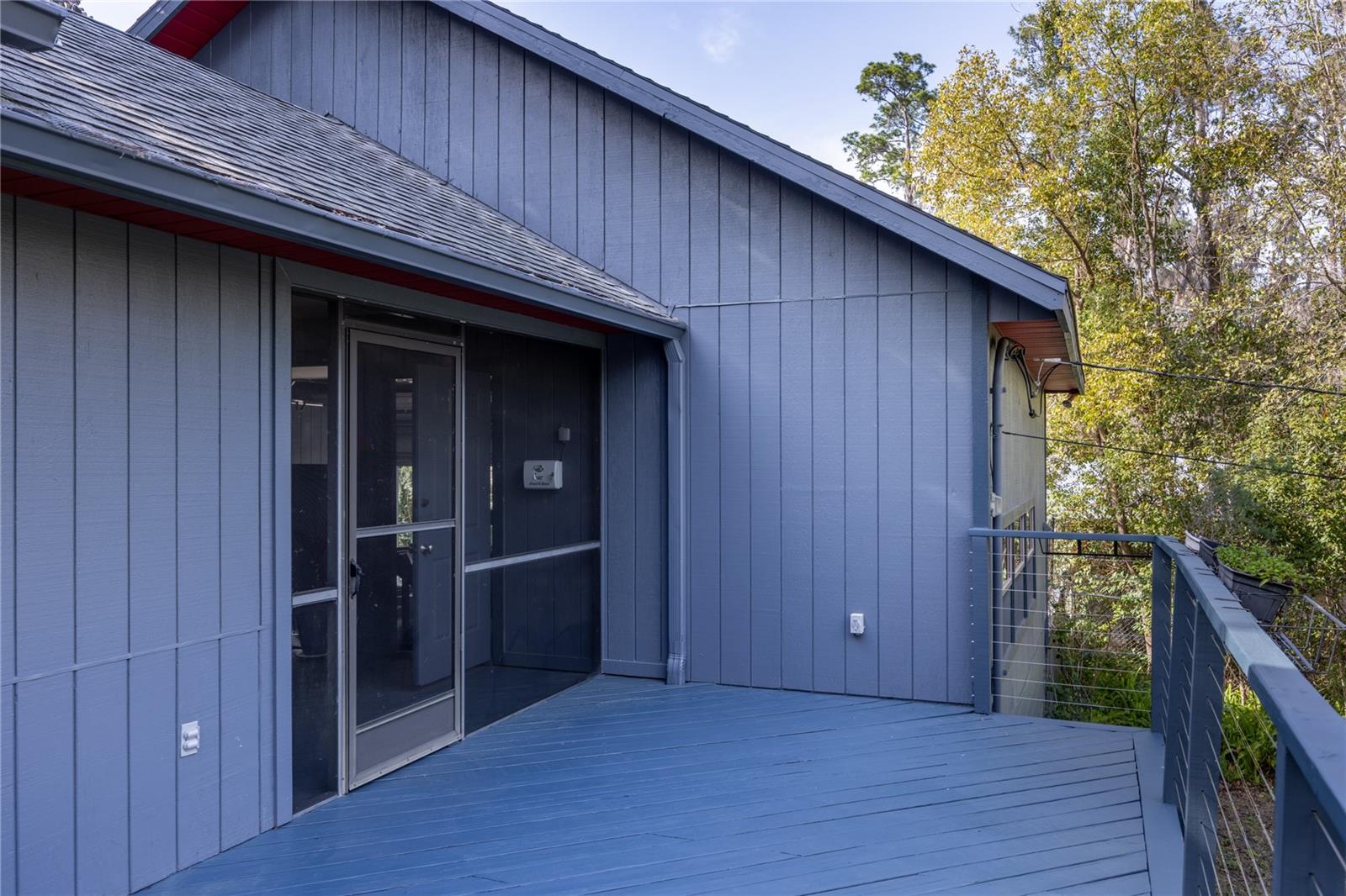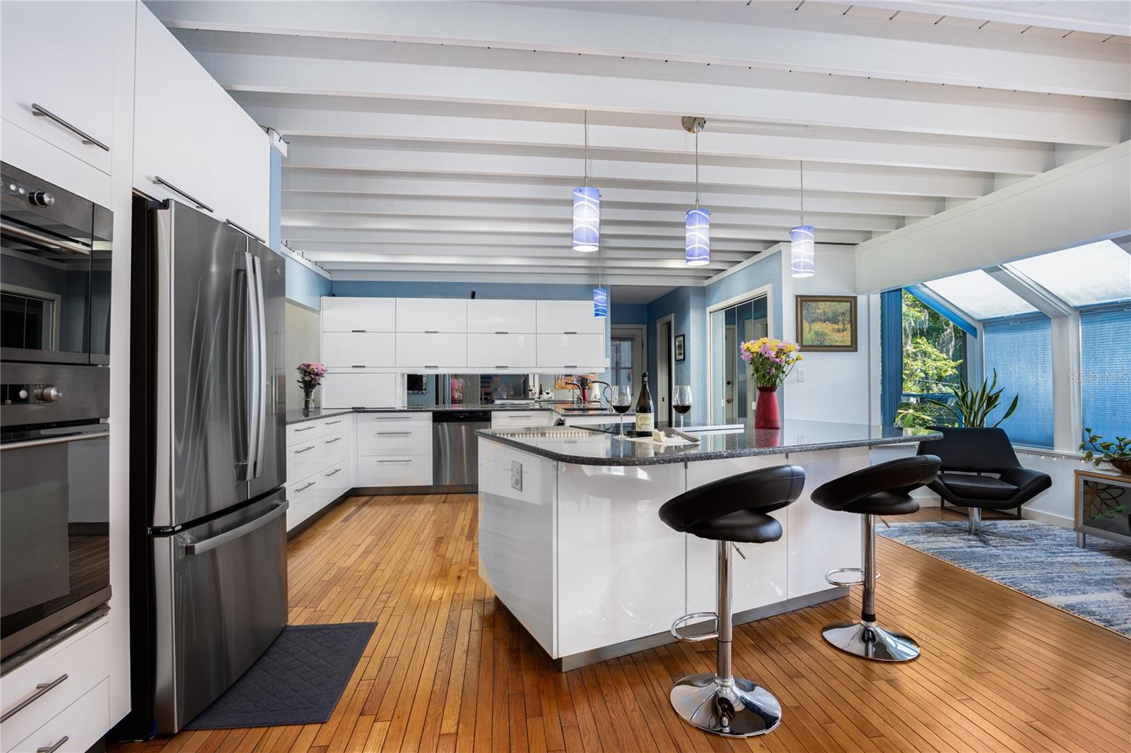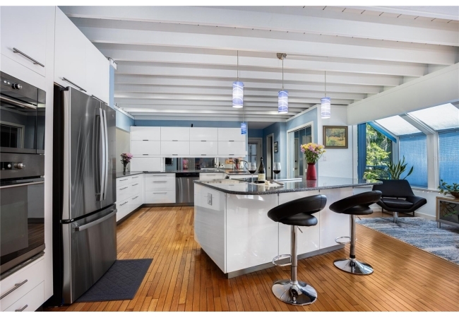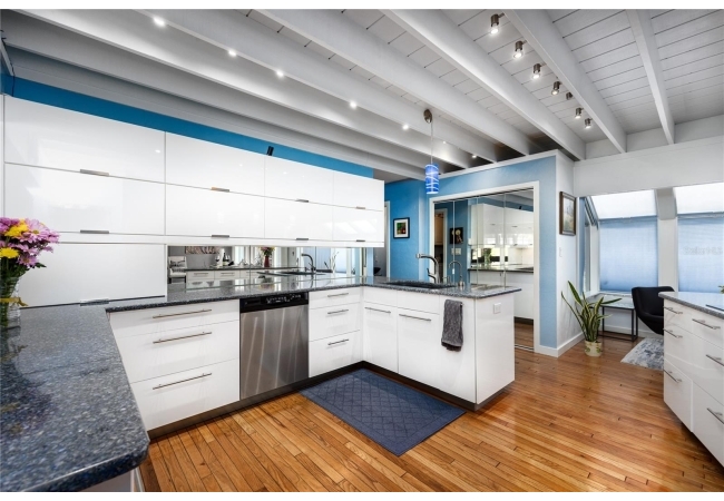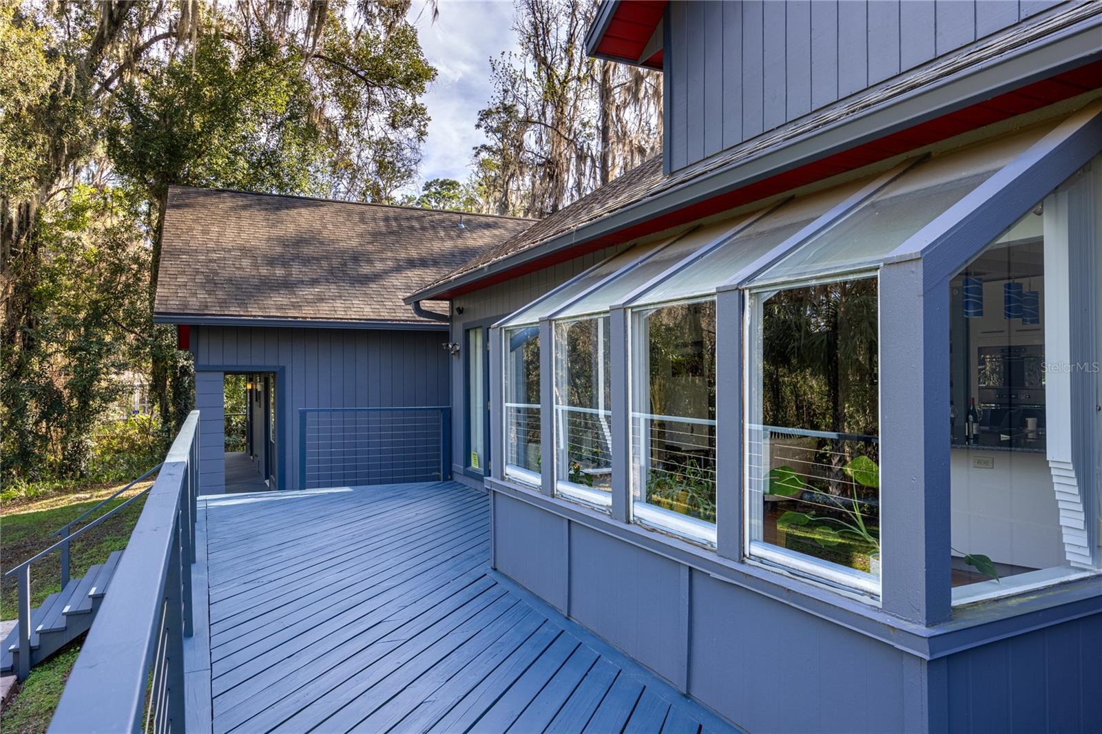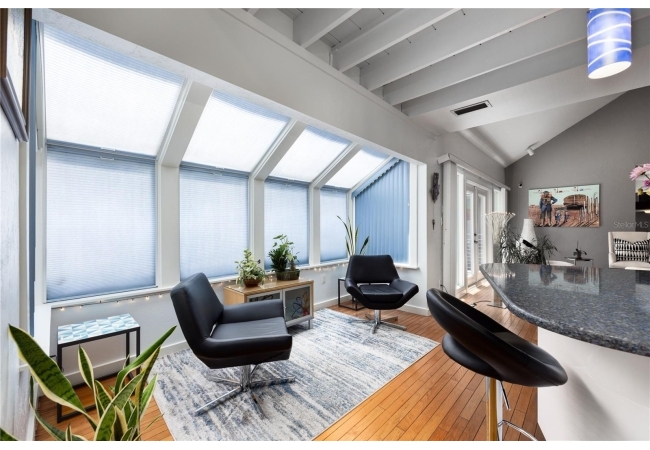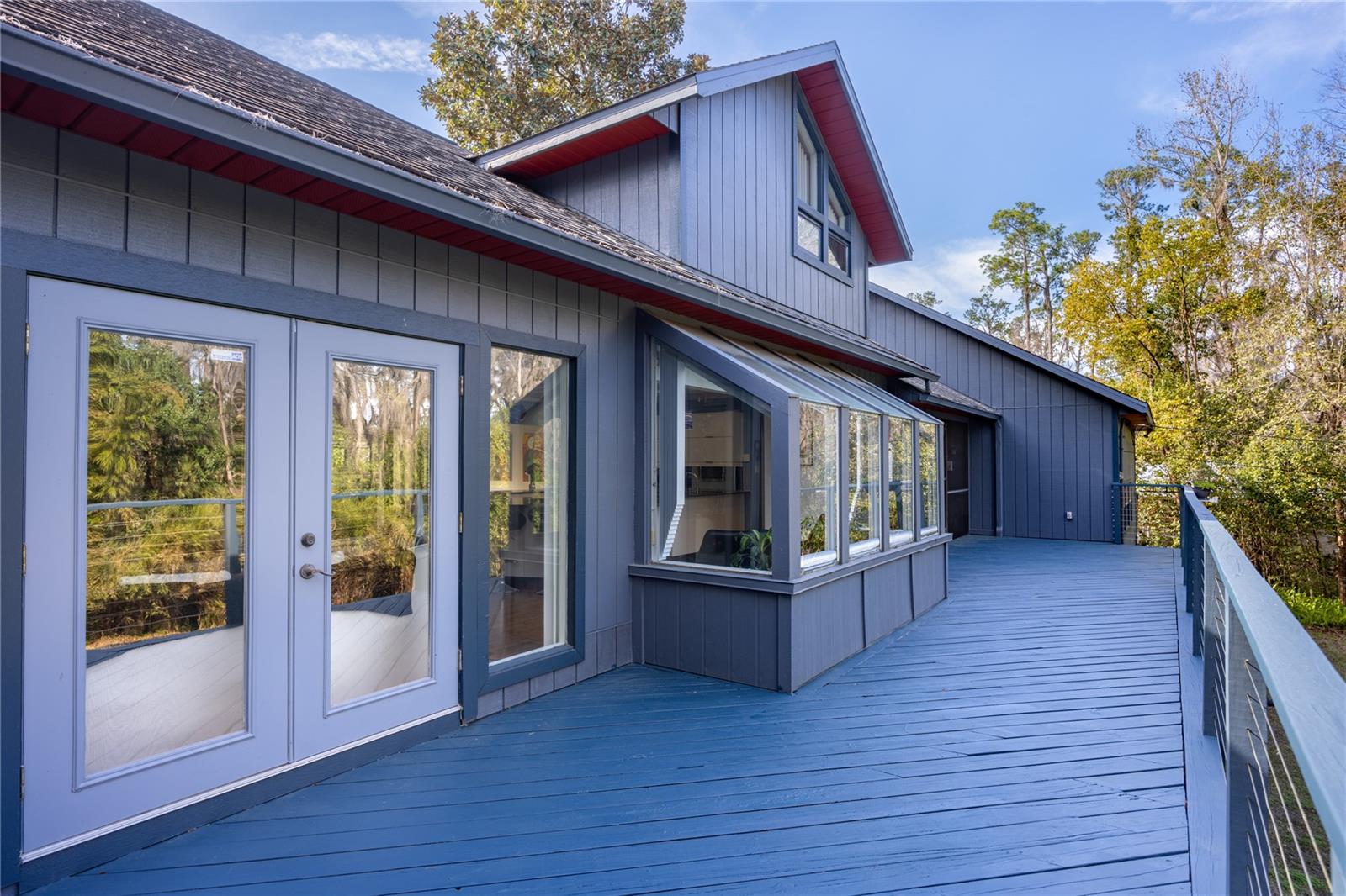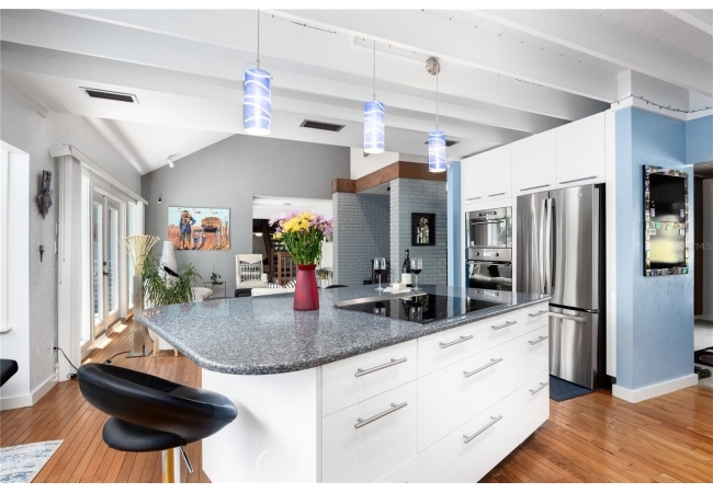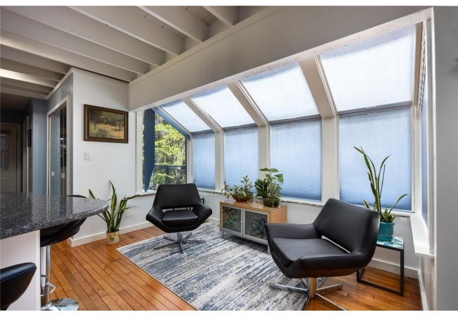 Amazing Scandinavian Modern home that combines minimalist design, sleek lines and yet remains warm and inviting. This 3 bedroom plus loft, 2.5 bathroom home, built in 1981, has only had 3 owners. Impeccably maintained, you will love the close proximity to the University of Florida, Shands/UF Health, PK Younge and downtown Gainesville. Yet its' location in the neighborhood makes this home a quiet and peaceful retreat on a cul-de-sac street. Walk to nearby Sweetwater Wetlands Park and Bivens Arm Nature Park. From the covered front entry, you step into the foyer. The home is divided into living and sleeping wings with an amazing Chef's Kitchen playing center stage. To your left is the Family Room with dramatic high ceilings, beautiful heart pine wood floors, soaring wood burning stove and banks of windows for a ton of natural light. The Family Room is open to the modern Kitchen with breakfast bar, breakfast nook, quartz counter tops, stainless steel appliances, induction cooktop and ample storage space. The breakfast nook is perfect for your morning coffee with a wall of floor to ceiling windows overlooking the deck and beautiful backyard. Just off the Kitchen is a half bathroom and a laundry room with washer and dryer, laundry tub and cabinets for extra storage. Also off the Kitchen is a screened breezeway that leads to the deck and the oversized two car, side entry garage. There is a large workshop and a darkroom, plenty of space if you needed an ADU or attached in-law suite The home has central vacuum. Roof is 2009. Two HVAC systems. Two septic systems. Tankless water heater for living spaces and separate water heater for the bedrooms. Step through the Kitchen to a Dining Area. This space is open to the Living Room with high ceilings and built-in bookshelves. There is a circular staircase that leads to a loft space full of natural light with built-in storage, sink and is perfect for an artist or home office. Back at the Foyer, if you turn right and go upstairs you arrive at the Primary Suite. This very large space with high ceilings has an ensuite bathroom that has been updated with wood cabinetry, double sink vanity and granite countertops. There is a separate shower and water closet. This home is absolutely full of storage space and the primary suite has a wall of closets with room for dressers and custom shelving. Downstairs has a flex space with transom windows that is currently used for workout equipment, but could easily be a homework station of in-law suite living area. The first bedroom has a built-in bookshelf, updated lighting and separate entrance to the rear wood deck. There is a Jack and Jill Bathroom that the guest rooms share with a tub/shower and water closet, but each room has its own vanity and sink. No more fighting over mirror time! The second guest bedroom has its own access to the rear deck as well. The large rear deck spans the back of the home and has updated railings and was expanded by the current owners. The home sits on an oversized lot of .75 acres and is fenced. There are vegetable beds and a low maintenance garden. No HOA.