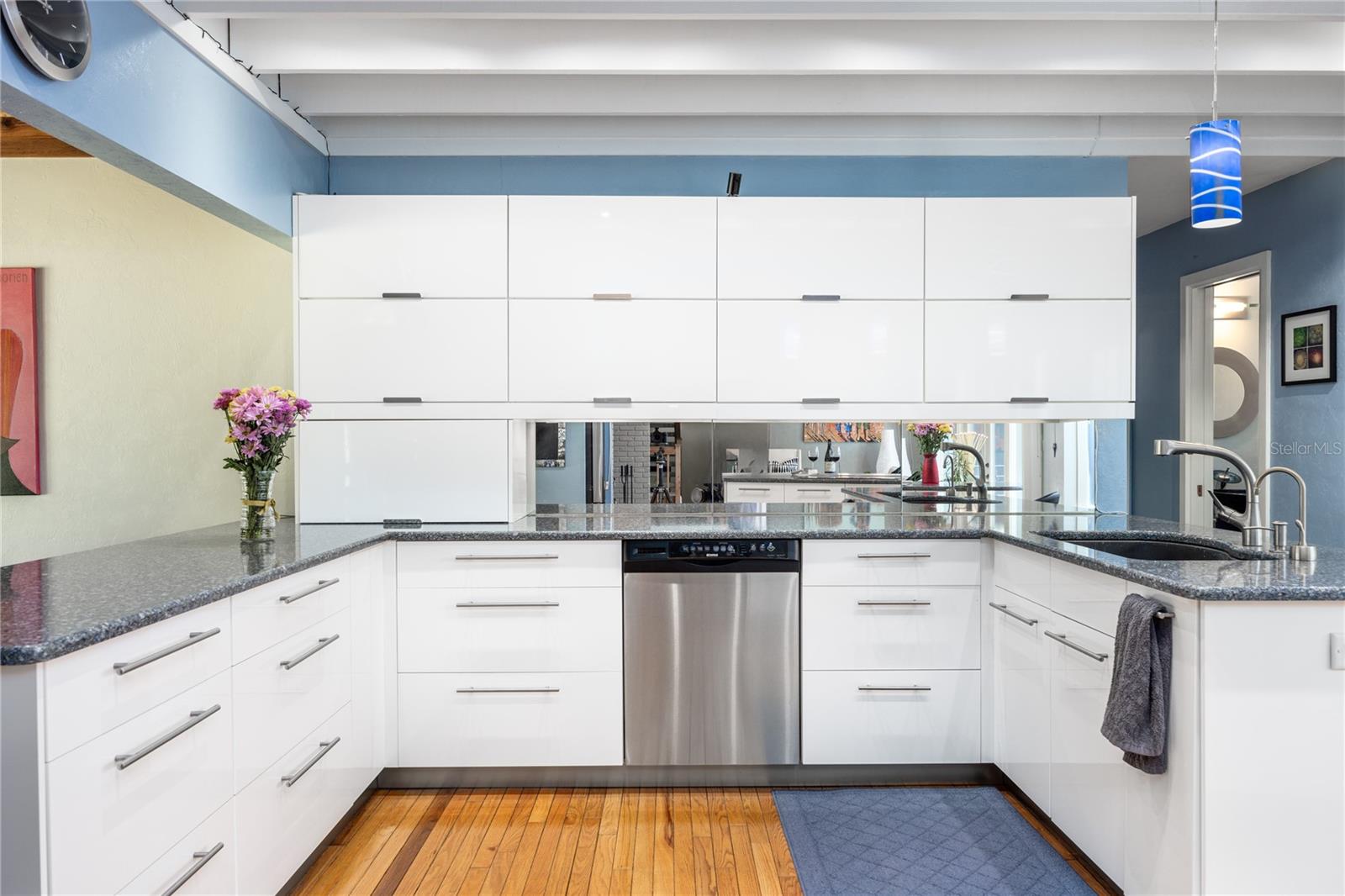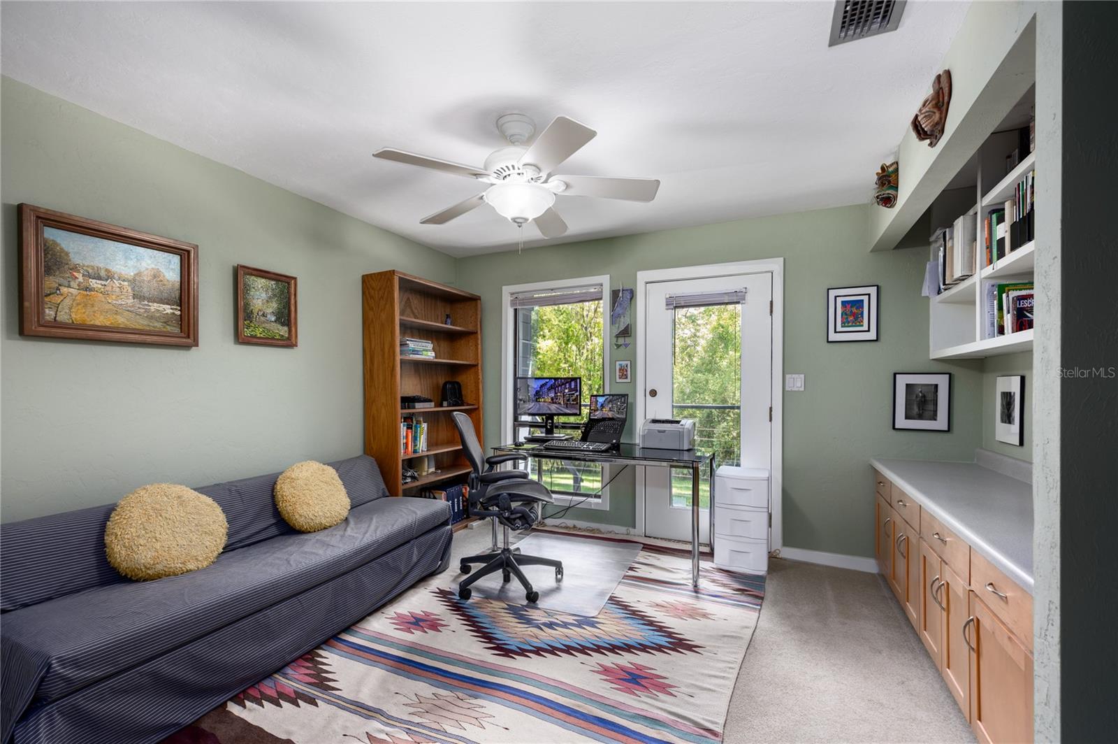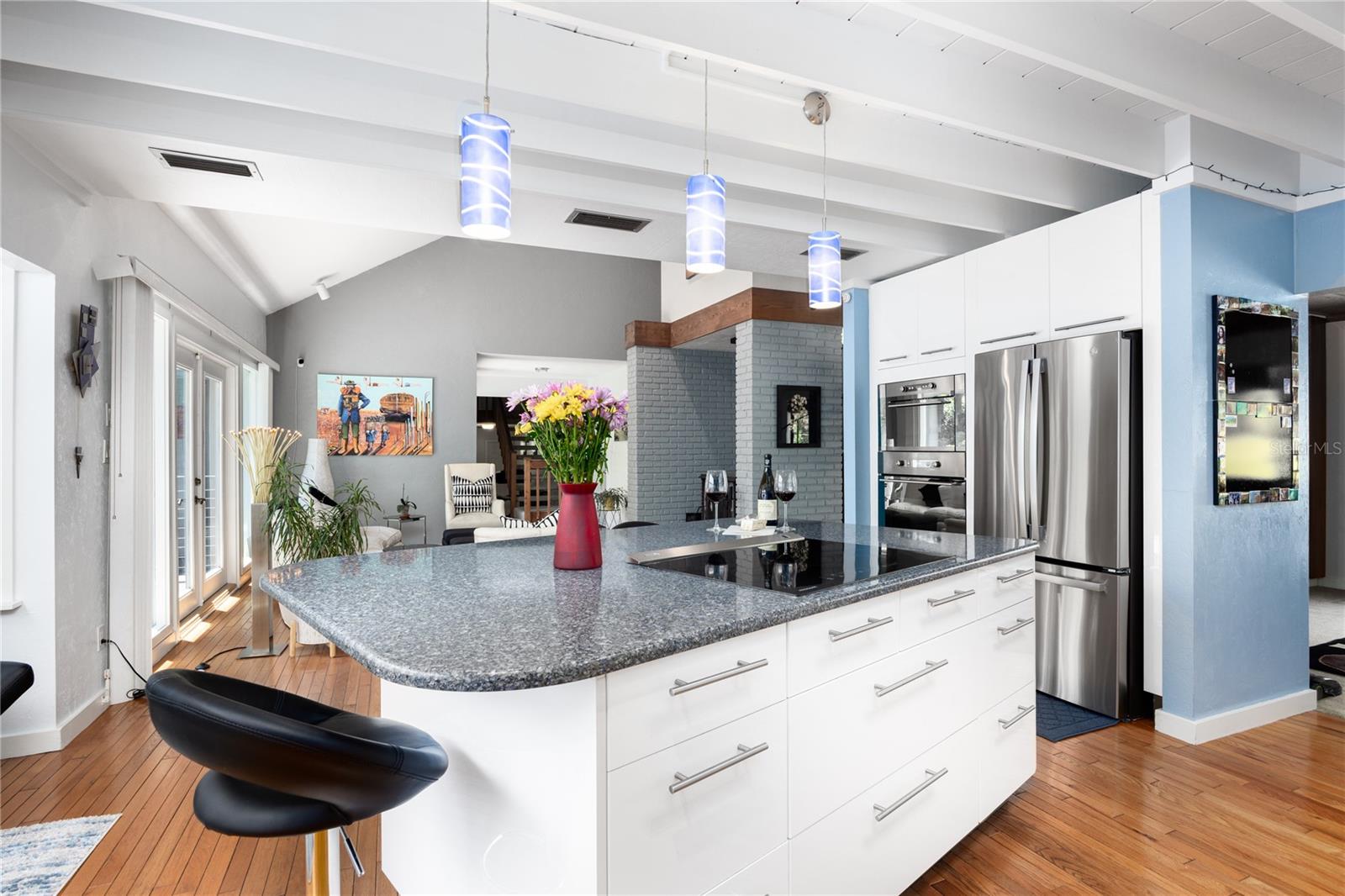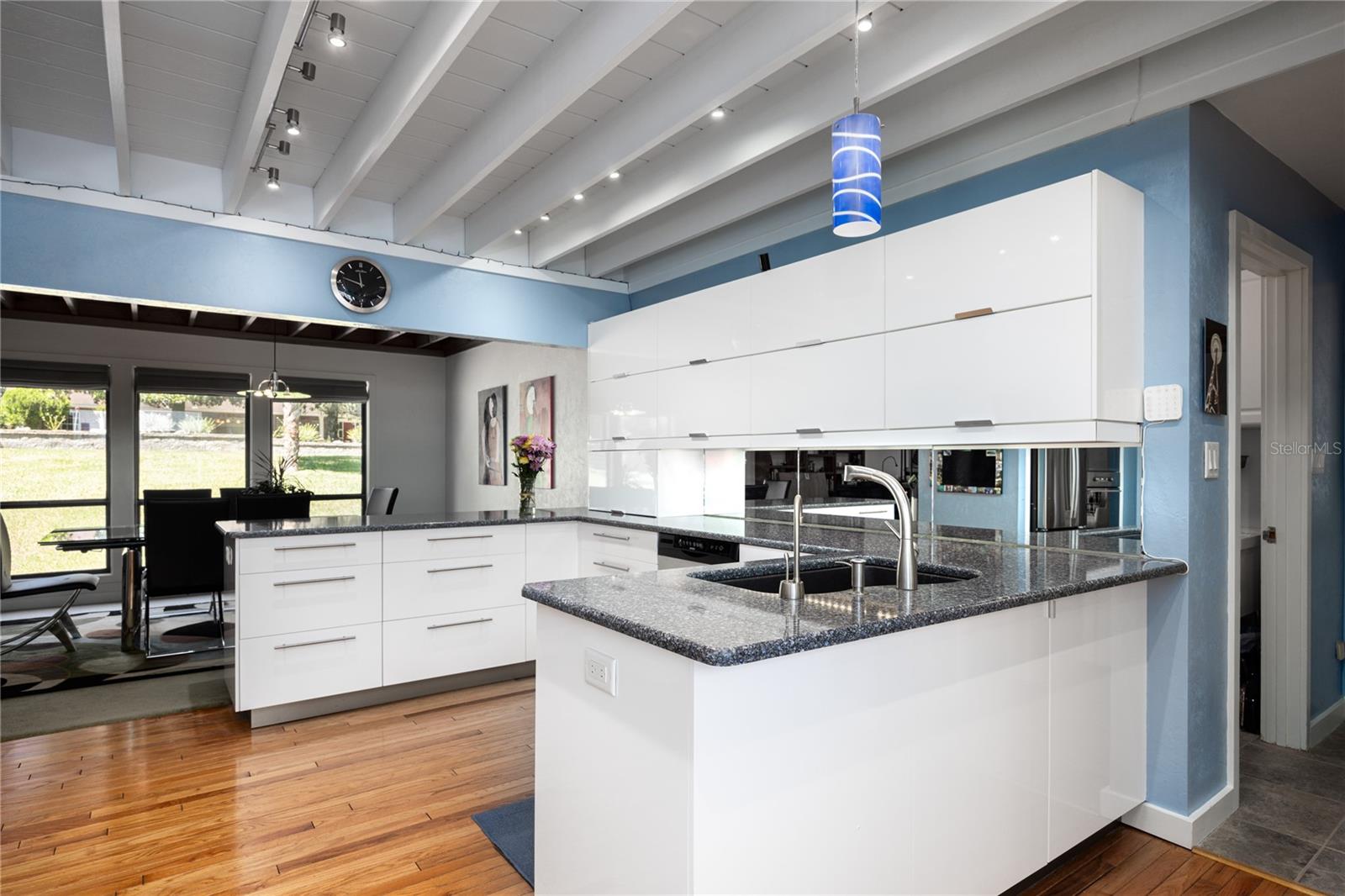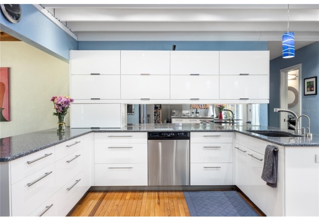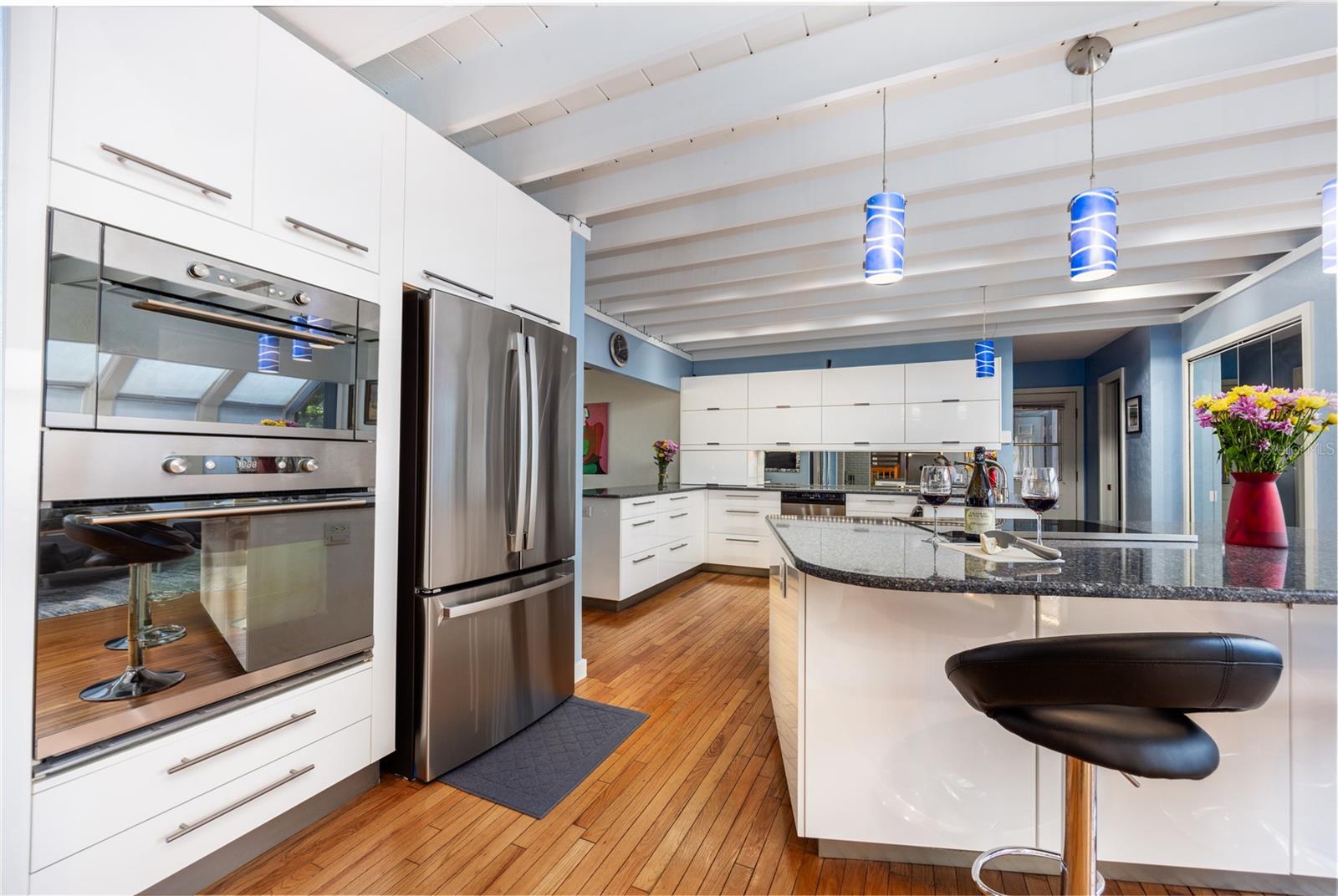 Amazing Scandinavian Modern home that combines minimalist design, sleek lines and yet remains warm and inviting. This 3 bedroom plus loft, 2.5 bathroom home, built in 1981, has only had 3 owners. Impeccably maintained, you will love the close proximity to the University of Florida, Shands/UF Health, PK Younge and downtown Gainesville. Yet its' location in the neighborhood makes this home a quiet and peaceful retreat on a cul-de-sac street. Walk to nearby Sweetwater Wetlands Park and Bivens Arm Nature Park. From the covered front entry, you step into the foyer. The home is divided into living and sleeping wings with an amazing Chef's Kitchen playing center stage. To your left is the Family Room with dramatic high ceilings, beautiful heart pine wood floors, soaring wood burning stove and banks of windows for a ton of natural light. The Family Room is open to the modern Kitchen with breakfast bar, breakfast nook, quartz counter tops, stainless steel appliances, induction cooktop and ample storage space. The breakfast nook is perfect for your morning coffee with a wall of floor to ceiling windows overlooking the deck and beautiful backyard. Just off the Kitchen is a half bathroom and a laundry room with washer and dryer, laundry tub and cabinets for extra storage. Also off the Kitchen is a screened breezeway that leads to the deck and the oversized two car, side entry garage. There is a large workshop and a darkroom, plenty of space if you needed an ADU or attached in-law suite The home has central vacuum. Roof is 2009. Two HVAC systems. Two septic systems. Tankless water heater for living spaces and separate water heater for the bedrooms. Step through the Kitchen to a Dining Area. This space is open to the Living Room with high ceilings and built-in bookshelves. There is a circular staircase that leads to a loft space full of natural light with built-in storage, sink and is perfect for an artist or home office. Back at the Foyer, if you turn right and go upstairs you arrive at the Primary Suite. This very large space with high ceilings has an ensuite bathroom that has been updated with wood cabinetry, double sink vanity and granite countertops. There is a separate shower and water closet. This home is absolutely full of storage space and the primary suite has a wall of closets with room for dressers and custom shelving. Downstairs has a flex space with transom windows that is currently used for workout equipment, but could easily be a homework station of in-law suite living area. The first bedroom has a built-in bookshelf, updated lighting and separate entrance to the rear wood deck. There is a Jack and Jill Bathroom that the guest rooms share with a tub/shower and water closet, but each room has its own vanity and sink. No more fighting over mirror time! The second guest bedroom has its own access to the rear deck as well. The large rear deck spans the back of the home and has updated railings and was expanded by the current owners. The home sits on an oversized lot of .75 acres and is fenced. There are vegetable beds and a low maintenance garden. No HOA.