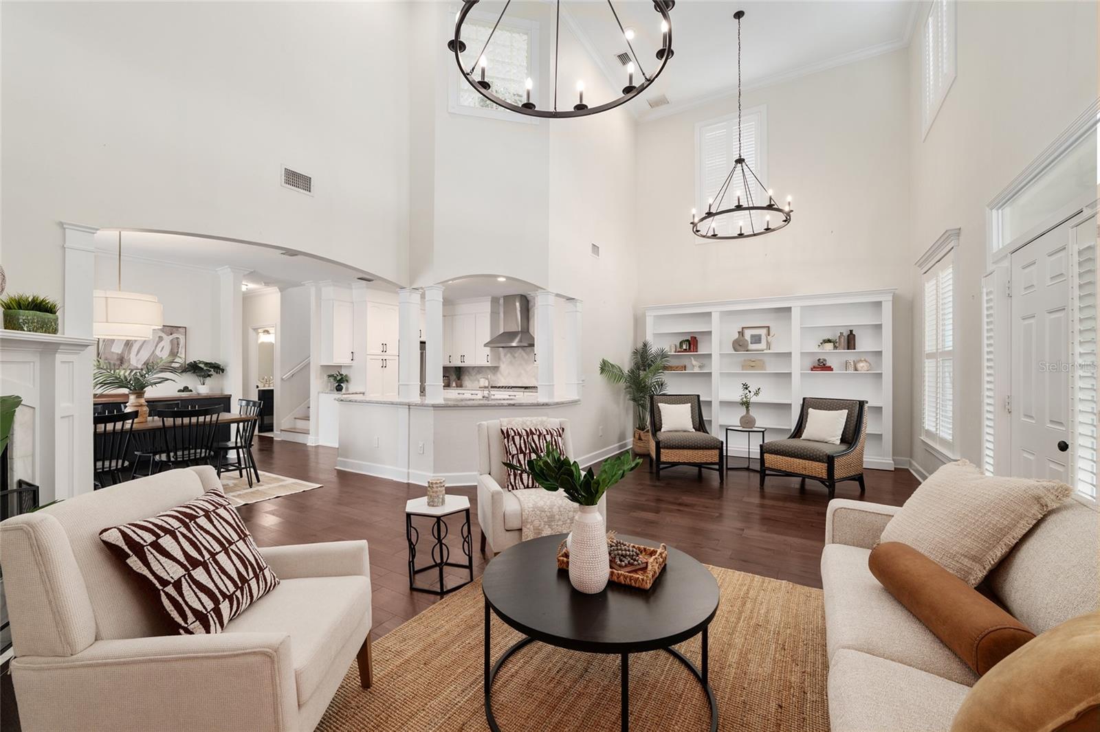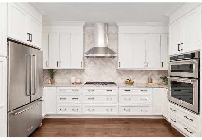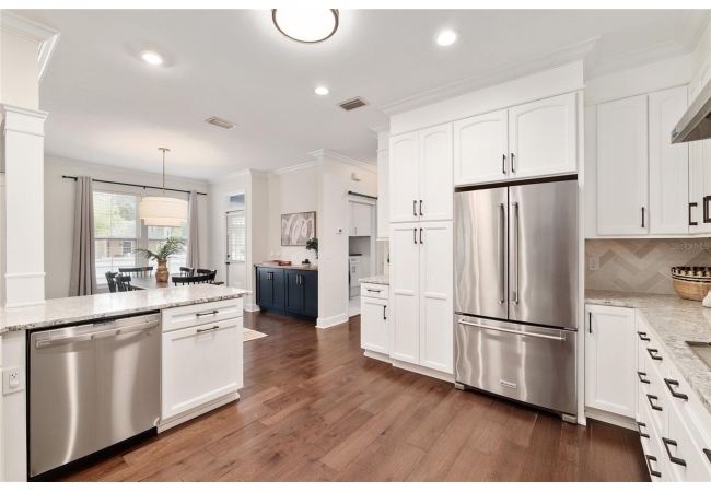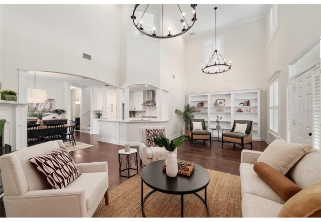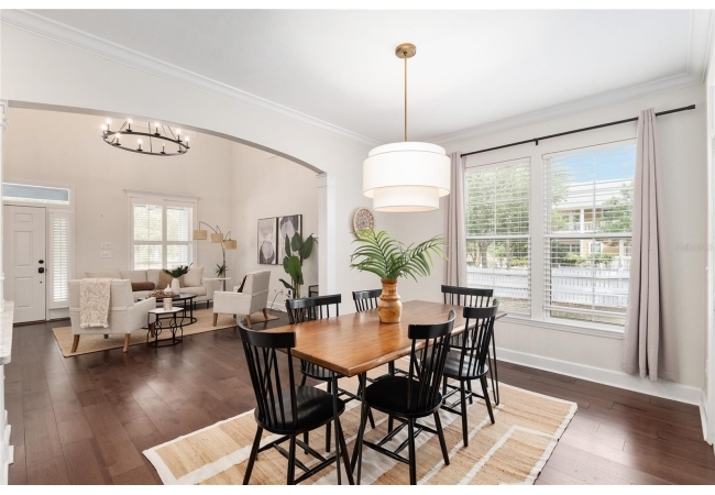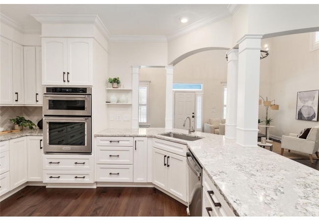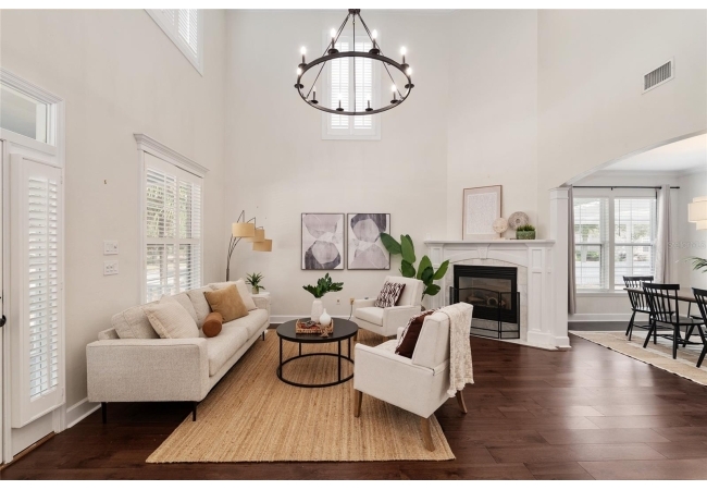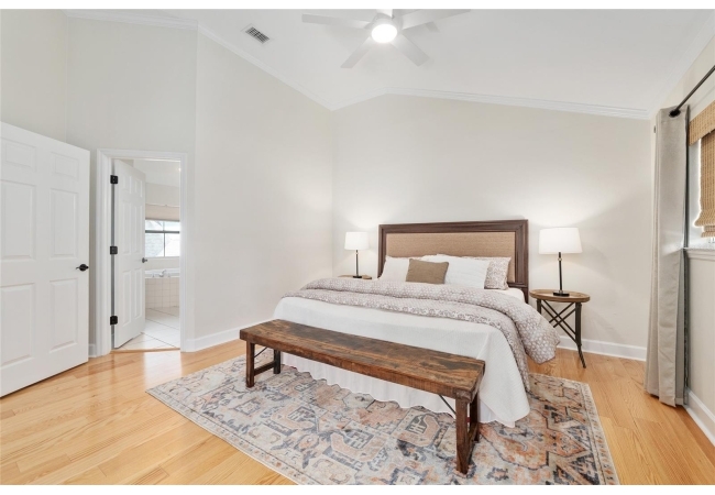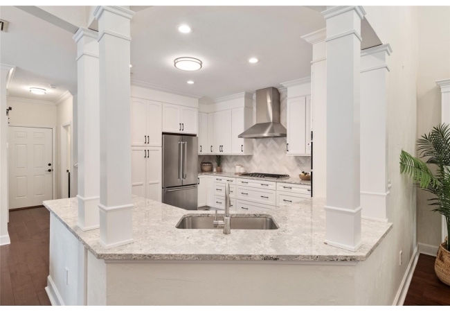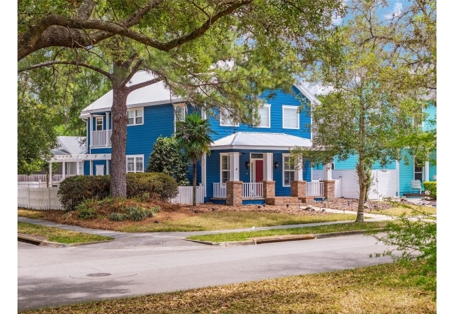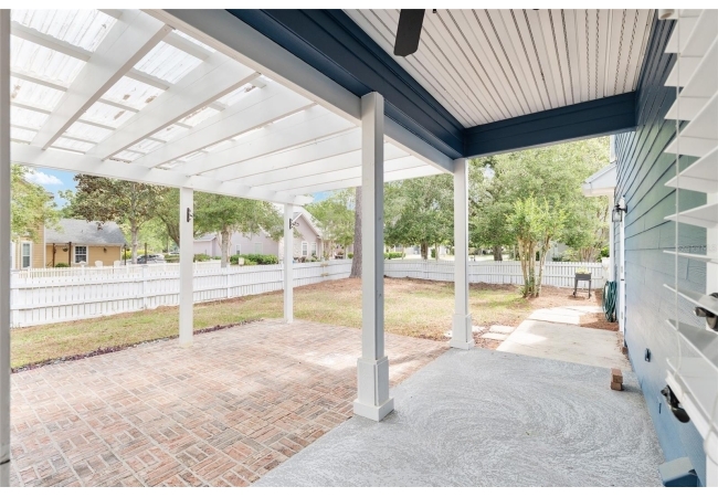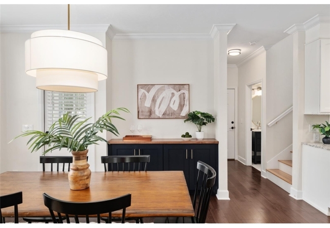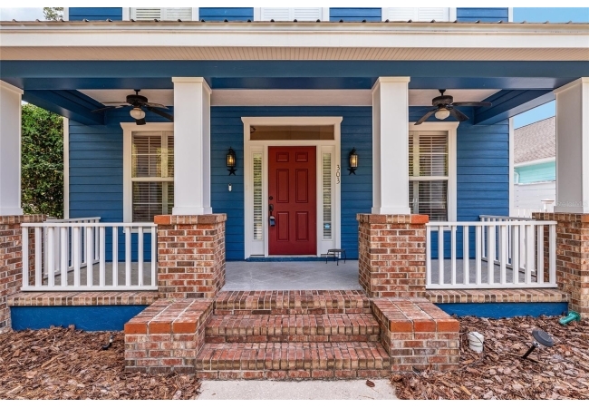 Positioned on a corner lot, this thoughtfully updated Town of Tioga home presents a striking first impression, where a charming blue exterior is framed by crisp white trim, and a classic white picket fence. A vibrant red door introduces a sense of character, while a covered front porch overlooks peaceful green parkland, creating a setting that feels both welcoming and quietly connected. Inside, the home opens with a sense of space and light. Vaulted ceilings rise above the main living area, where dark plank flooring grounds the space and clerestory windows draw in natural light from above. Set beneath a dramatic chandelier, a wall of built in shelving balances form and function while the corner fireplace anchors adds a sense of elegant comfort. The layout unfolds with intention, guiding the flow to a dedicated dining space defined by an oversized picture window and its own refined lighting. A built-in sideboard adds both utility and elegance, creating an ideal setting for entertaining. Beyond, the kitchen is composed with clarity and purpose. Full height cabinetry offers abundant storage, while a chef’s range with a Viking hood vent and carefully selected finishes create a space that is both functional and elevated. Upstairs, the primary suite offers a retreat shaped by vaulted ceilings and rich flooring underfoot. A private balcony extends the space, overlooking the yard and inviting quiet moments. The suite is complemented by a generous walk-in closet with built-in organization and a 5-piece bath featuring a deep soaking tub. Two additional upstairs bedrooms are equally well considered, each filled with natural light and offering flexibility for a range of uses. A well appointed ground level laundry room adds ease to daily routines with thoughtful storage. Outdoor living continues in the backyard, where a level private setting is framed by fencing and softened by intentional design. A brick patio sits beneath a pergola extension from the upper balcony, creating a layered outdoor environment suited for both gathering and quiet enjoyment. A rear-entry two car garage completes the home’s functionality, offering convenience while preserving the integrity of the front elevation. Located just moments from Tioga Town Center restaurants, fitness center and MORE, this home pairs timeless design with a highly connected setting, offering both comfort and access within one cohesive and compelling experience.