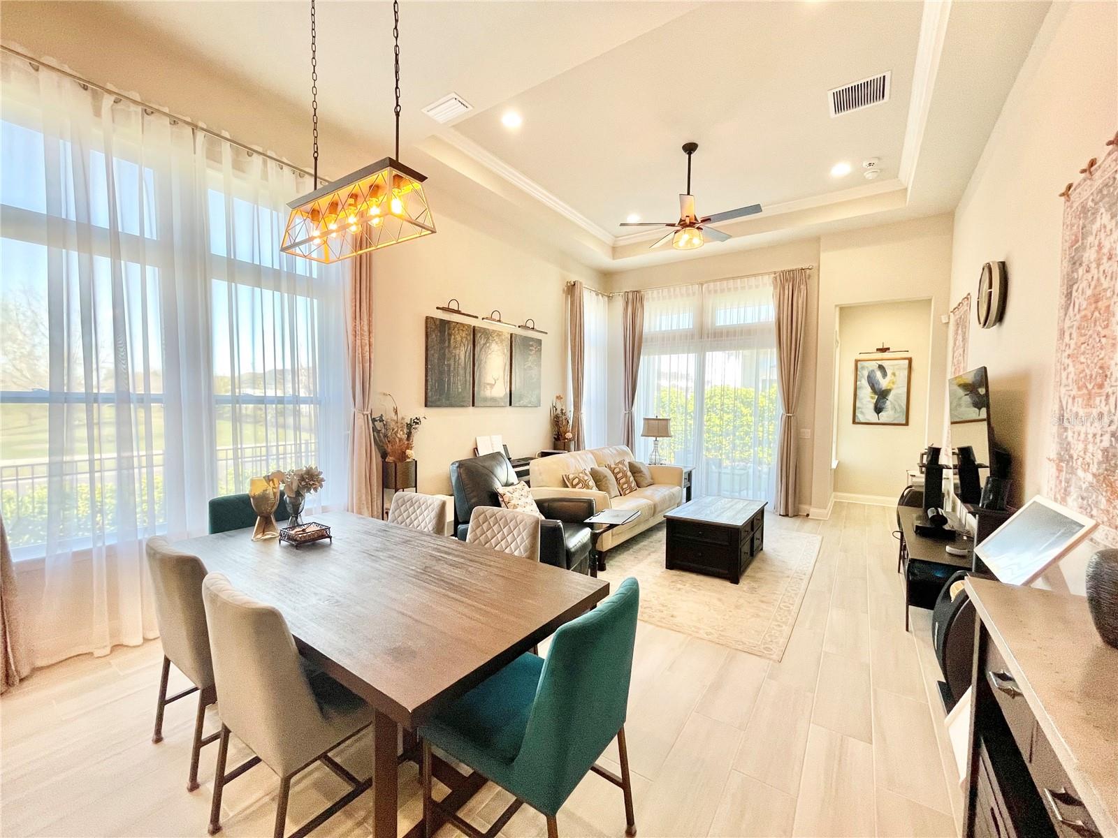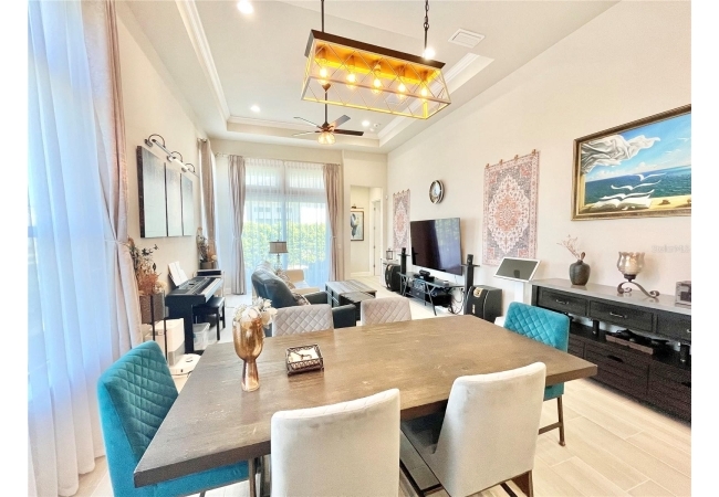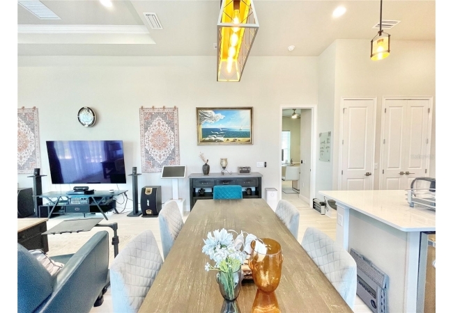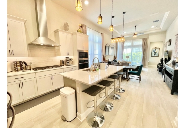 This immaculate 4-bedroom, 2-bath home in Oakmont offers a premium corner lot and stunning features throughout. Built in 2023, it boasts upgraded details like soaring 10-12 foot ceilings, 8-foot doors, crown molding, and trim. The living areas feature elegant wood-look tile, while the bedrooms are carpeted for comfort. The gourmet kitchen is designed for both function and style, with an open layout, large island seating for four, and high-end finishes such as quartz countertops, a 5-burner gas cooktop, oven/microwave tower, stainless steel vent hood, tile backsplash, pantry, and abundant white shaker cabinets with crown molding. Additional perks include a rear covered lanai, front porch, an inside laundry room, and a tankless water heater for ultimate convenience. The 2-car garage provides extra storage space. Situated on a fenced corner lot, this home offers privacy and ample outdoor space. Designed with the Capri-Coastal modern plan from ICI Homes, this home is part of a community with state of art amenities, including a pool, clubhouse with gathering room and kitchen, fitness center, tennis, pickleball, beach volleyball and basketball courts, as well as miles walking trails, nature trails and a 46 acre Gopher Tortoise Reserve. A truly exceptional place to call home! Home faces west.