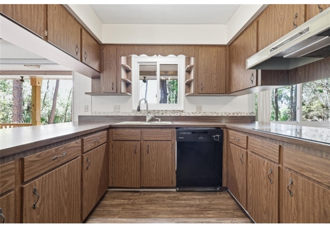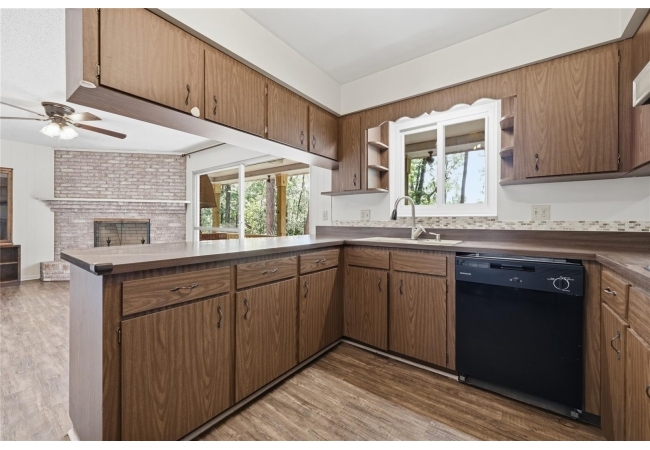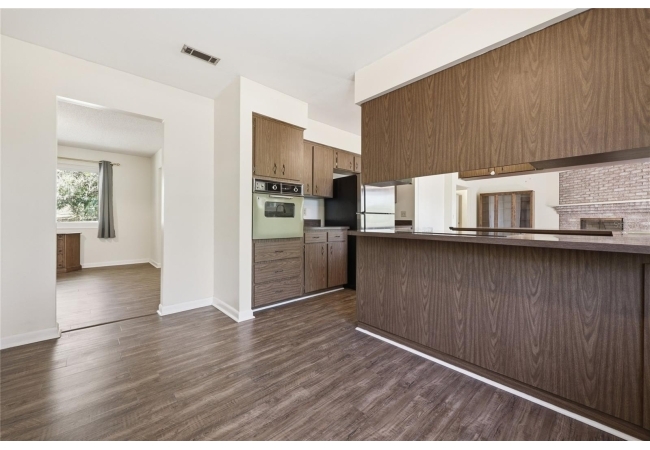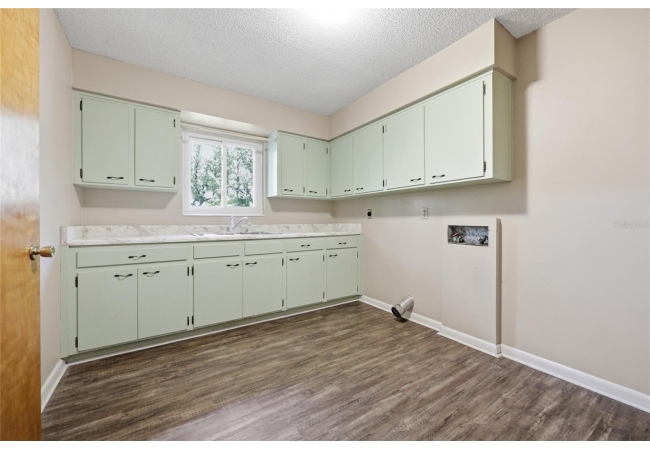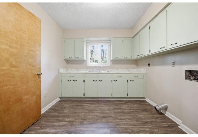 The fully fenced backyard is filled with mature trees and flowering shrubs, creating a peaceful outdoor retreat. The primary suite also offers direct backyard access. The kitchen, breakfast area, and oversized laundry room—with ample cabinetry and a deep stainless steel sink—overlook the backyard as well.