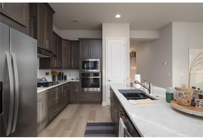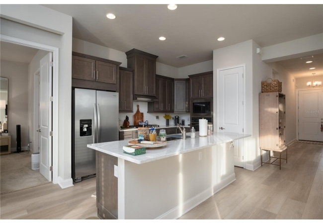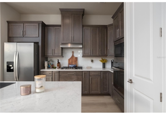 into the main living space. The well-appointed kitchen comes with all appliances, including a refrigerator, built-in dishwasher, Gas cooktop,