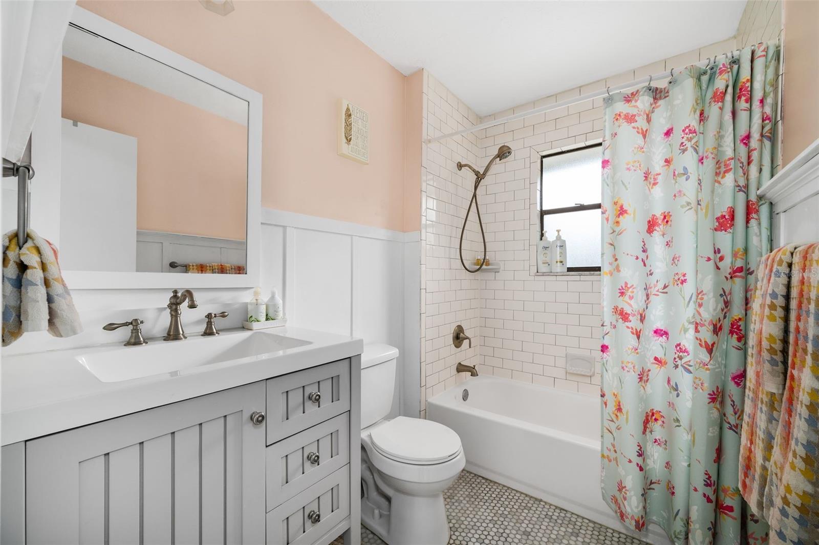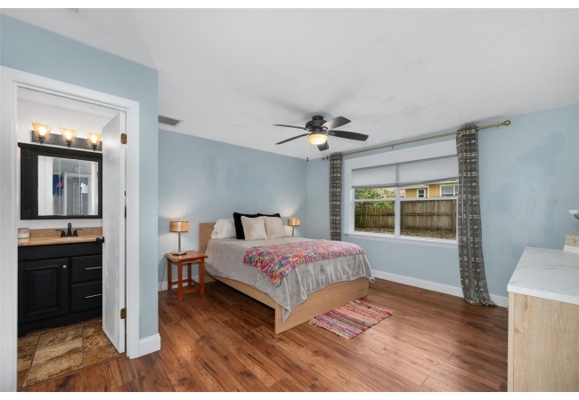 Walking though your dining space, you find the kitchen that is both stylish and practical, featuring ample counter space and generous pantry storage. Just off the kitchen is an oversized laundry room for added convenience and offering additional shelf storage. Moving to the primary suite you'll enjoy a peaceful retreat with abundant space, a walk-in closet, and a beautifully updated en-suite bathroom.
