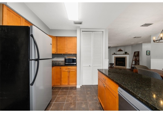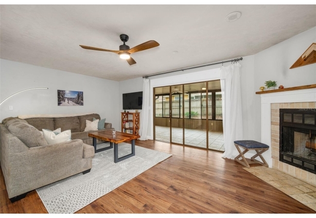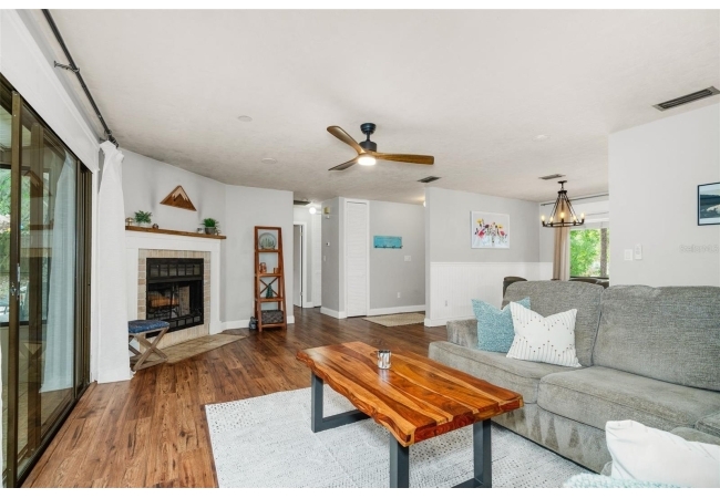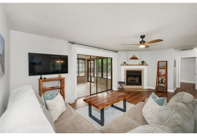 Stepping inside you'll find the spacious living area, where a charming wood-burning fireplace creates a warm focal point for cozy evenings. Sliding glass doors extend the living area seamlessly into an oversized, air-conditioned lanai—an inviting setting for year-round entertaining or relaxing in comfort.