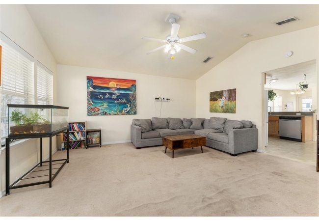 Located in the desirable Walnut Creek neighborhood, this 3-bedroom, 2-bath home offers 1,409 square feet of comfortable living space in a convenient setting. The welcoming front porch is a perfect spot for a morning cup of coffee. Inside, the home opens to a spacious living room with vaulted ceilings, creating an open feel. Two guest bedrooms are located to the right and share a hall bath with a tub/shower and linen closet. The kitchen and dining area feature a wall of windows, allowing plenty of natural light, along with a closet pantry for storage. The primary bedroom is privately situated off the kitchen and includes a large walk-in closet and a bath with a tub/shower and linen closet.