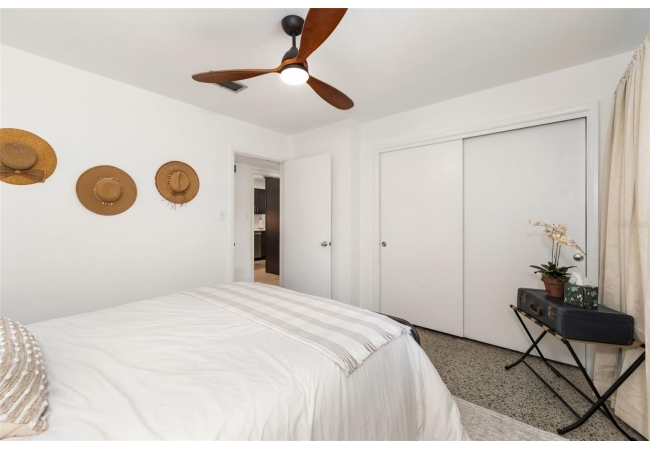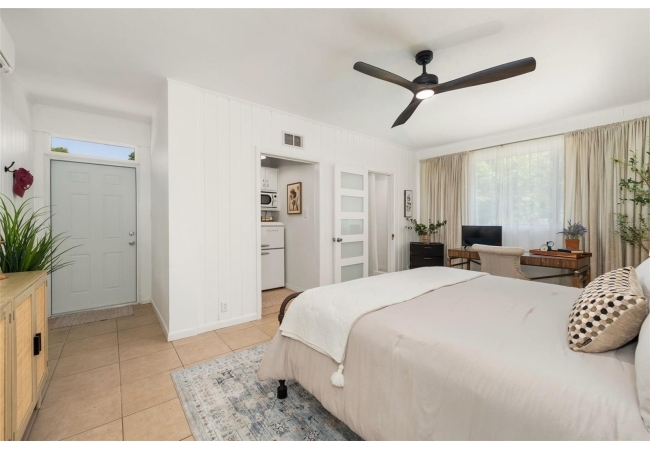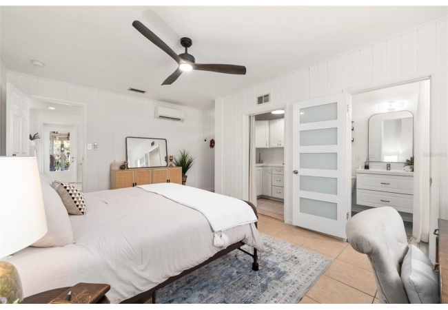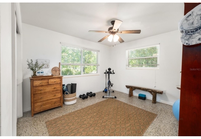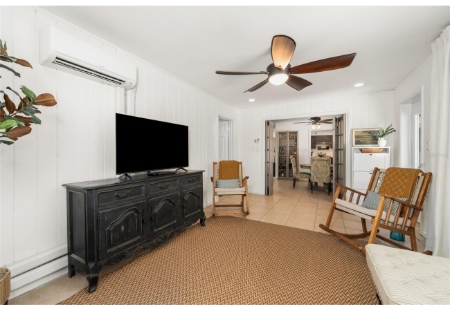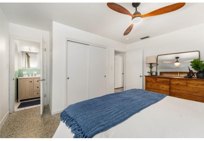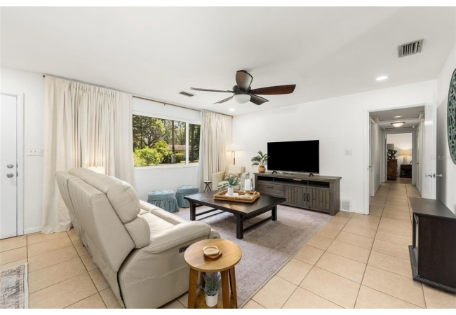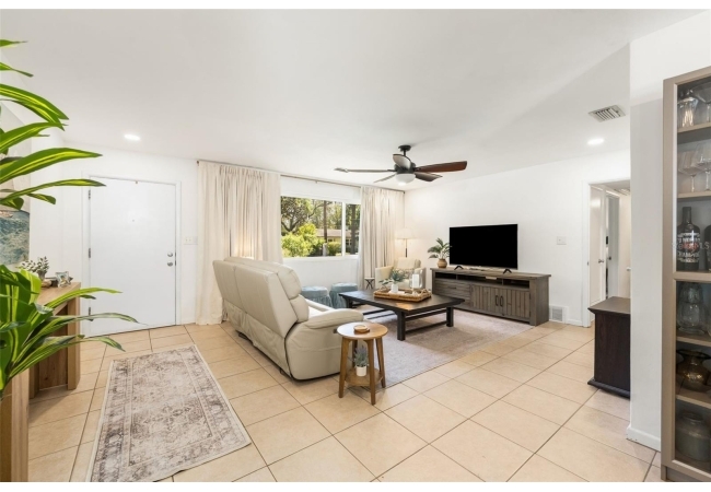 All bathrooms have been tastefully updated, including a guest bath that preserves its original tile, blending vintage character with modern finishes. Terrazzo floors in immaculate condition extend through three bedrooms, while tile flooring runs throughout the main living areas. Additional upgrades include newer windows (approximately 5 years old), an updated AC system (6 years old), upgraded electrical wiring, and enhanced lighting throughout.