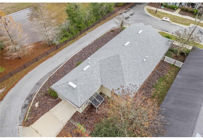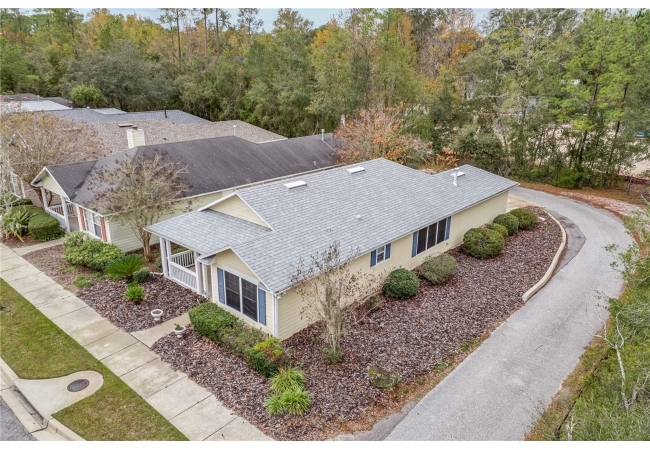 One or more photo(s) has been virtually staged. Well-maintained 2 bedroom, 2 bathroom patio home on a corner lot in the Walnut Creek community of NW Gainesville, featuring a one-car garage, 2023 roof, and a thoughtfully laid-out floor plan. The corner setting provides added privacy, extra natural light, and a more open feel compared to interior lots, with mature trees and a quiet, curved street backdrop.