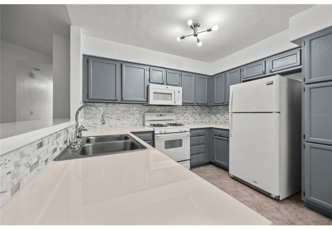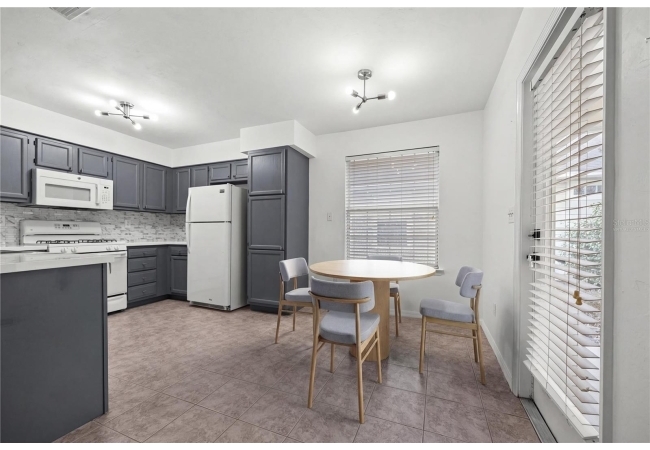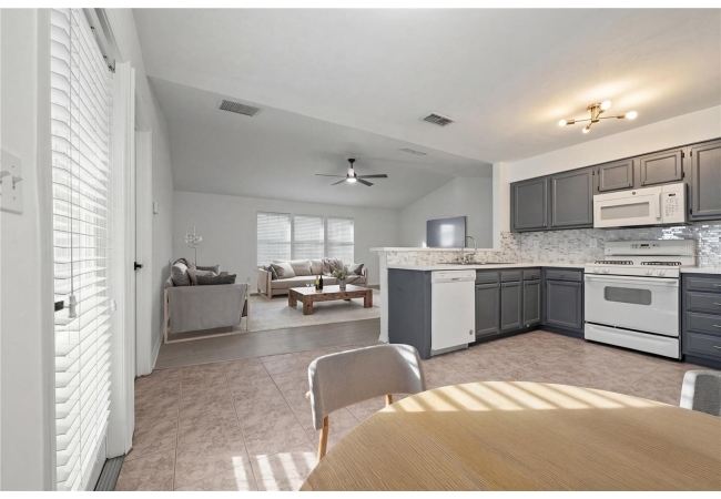 The kitchen features gray cabinetry, a tiled backsplash, breakfast bar seating, and white appliances, with a dedicated dining area just off the kitchen offering natural light and easy connection to the living area.