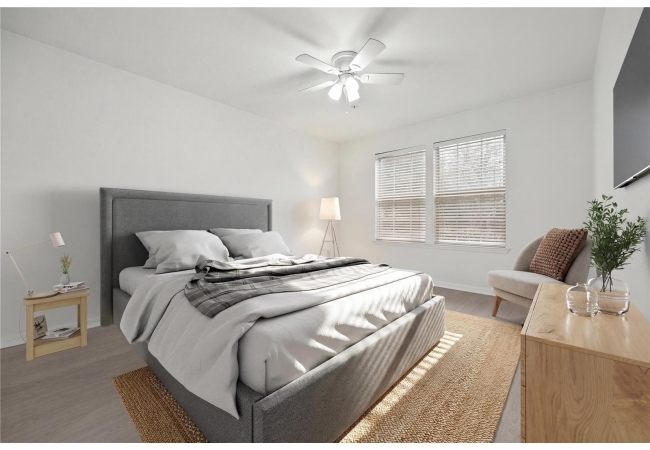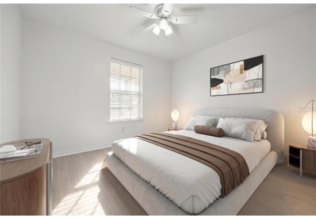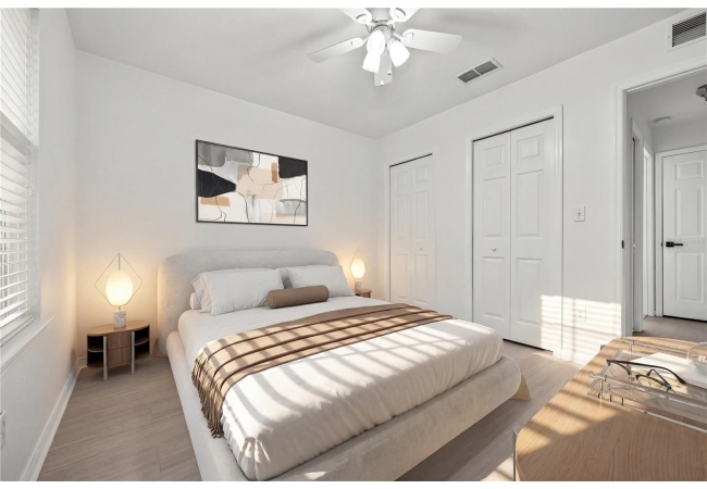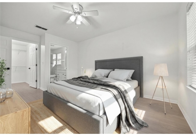 The primary bedroom includes a huge walk-in closet and an en-suite bathroom with a walk-in shower, updated vanity, and modern fixtures. The second bedroom and full guest bathroom are conveniently located nearby, offering flexibility for guests, a home office, or additional living needs.