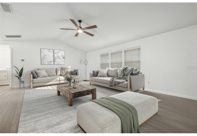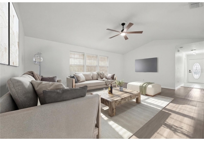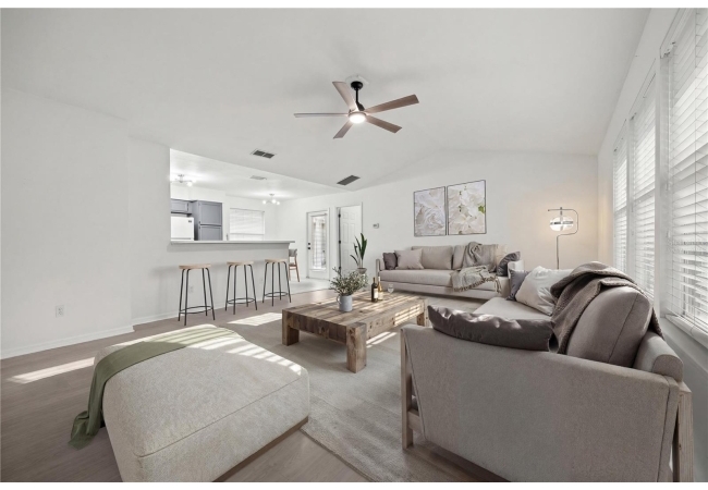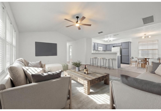 Inside, the vaulted living area is bright and welcoming, with updated wood-look flooring, neutral paint, and modern ceiling fans throughout. The living room flows naturally into the kitchen and dining area, creating a comfortable and functional main living space.