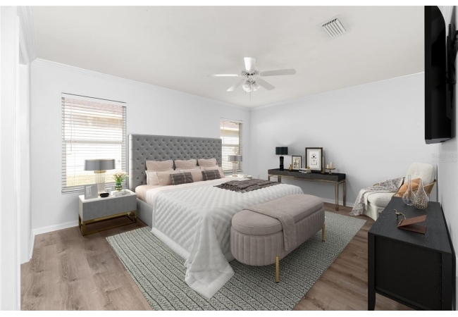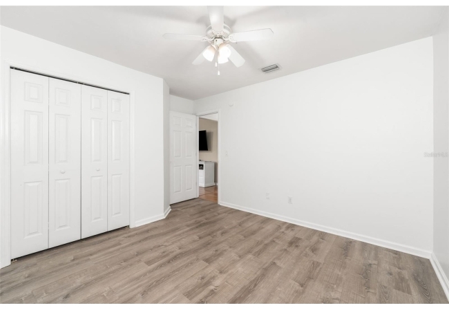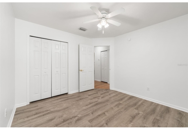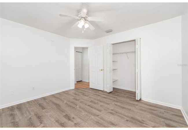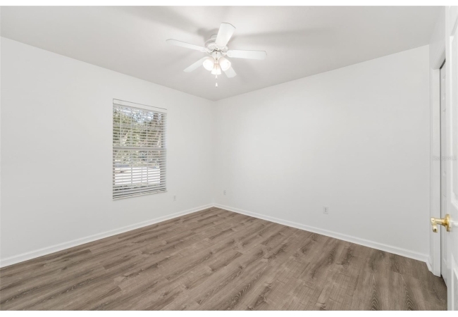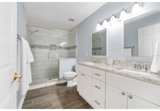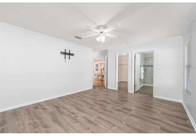 Retreat to the serene primary suite, complete with a large walk-in closet and an updated en-suite bathroom featuring double vanities and a spacious walk-in shower. On the opposite side of the home, the three additional bedrooms in this split floor plan have been freshly painted and the entire home features easy-to-maintain flooring throughout—no carpet.