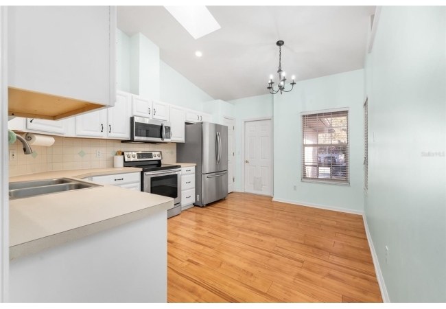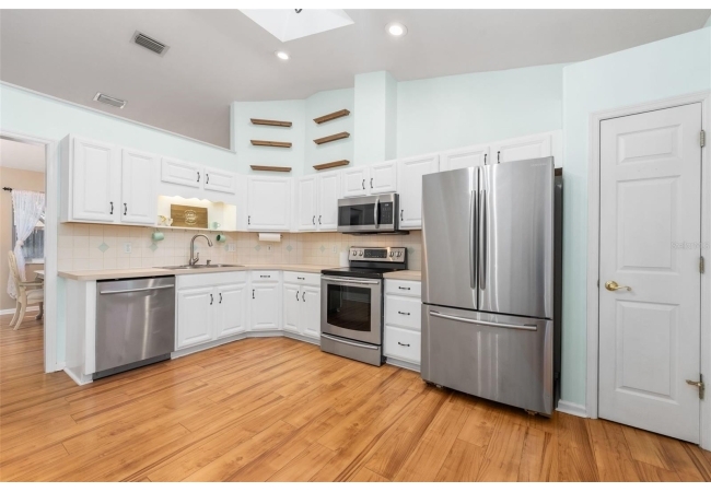 The expansive kitchen offers ample cabinetry for storage and stainless steel appliances. Whether you're hosting or enjoying a quiet morning, the layout provides the space and comfort you need.