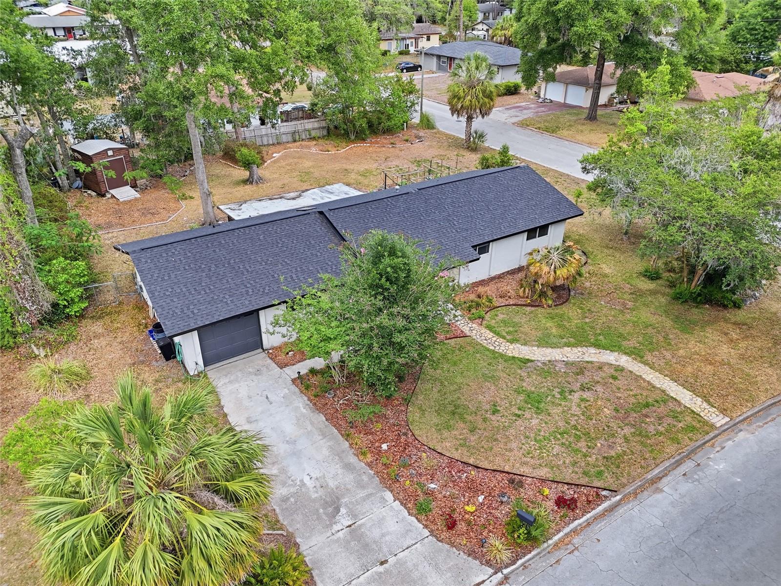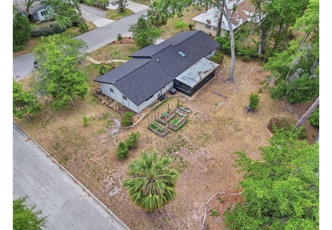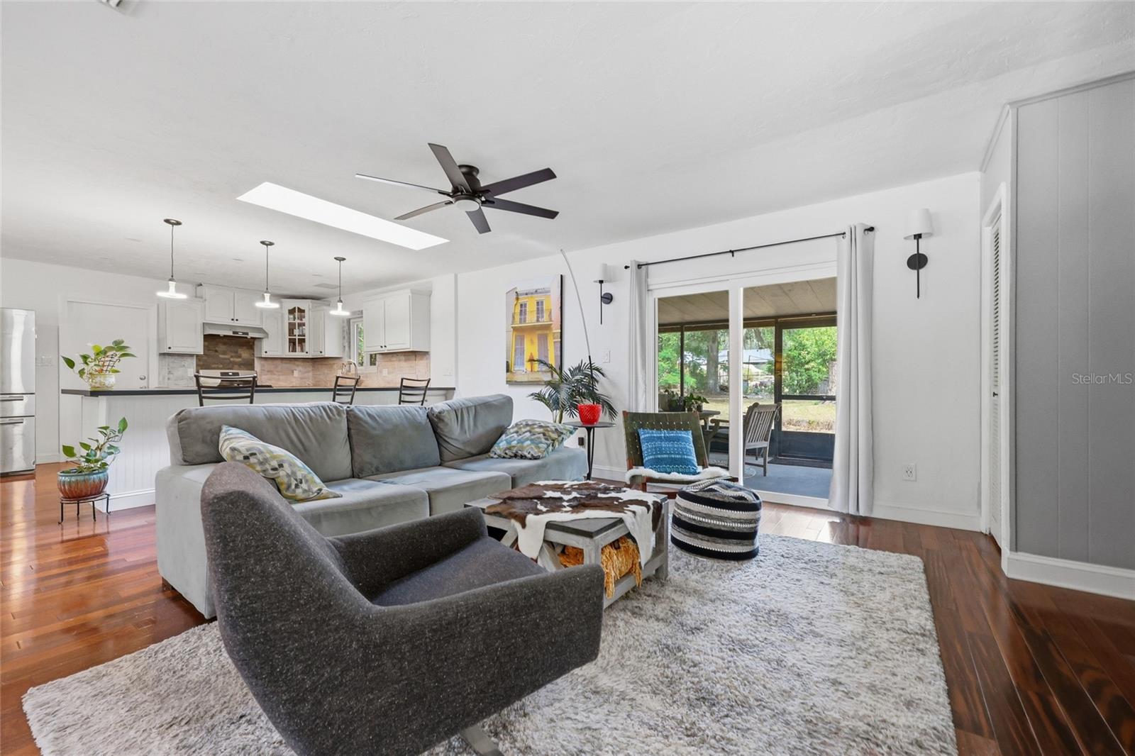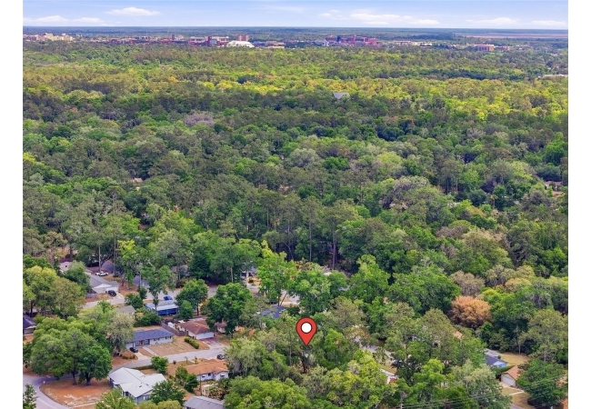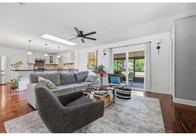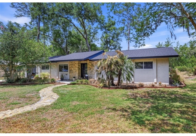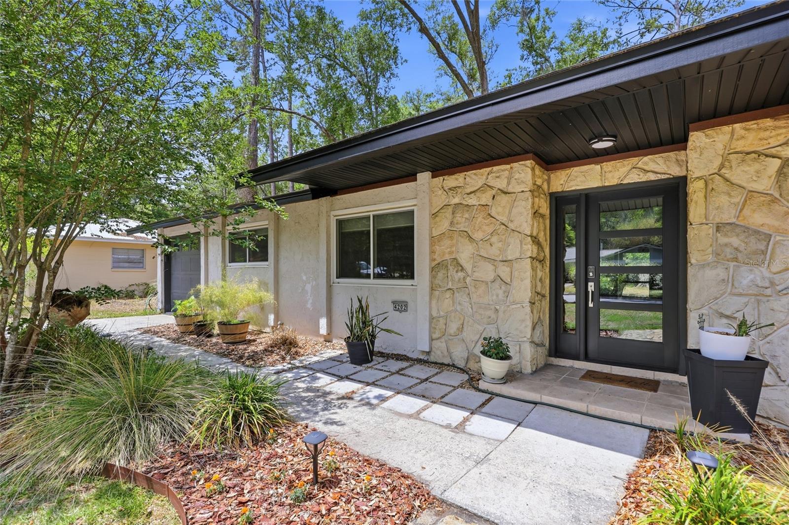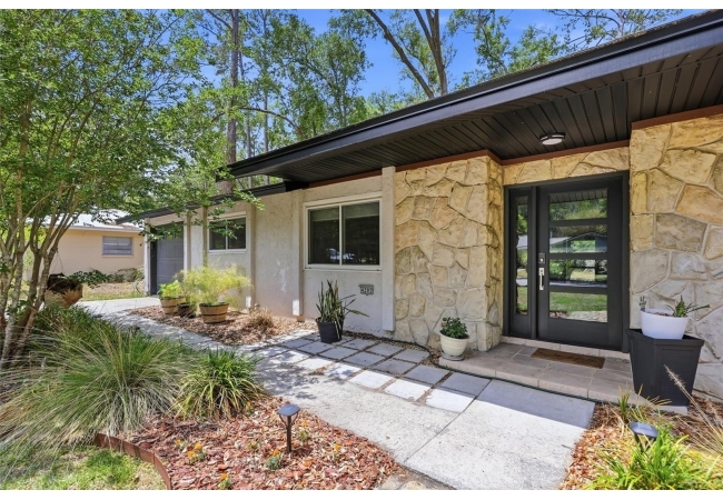 Character and modern updates define this 3-bed, 2-bath home situated on a sprawling 0.34-acre corner lot just 3 miles from the University of Florida! The 1,498 sq ft residence stands out for its durable stucco and stone exterior, a roof installed in 2023, and high-efficiency double-pane windows that refresh the traditional ranch profile. The front lawn and established garden beds frame the picturesque walkway that leads to a beautiful front door offering timeless curb appeal. Once inside, you are immediately greeted by an expansive open-concept great room where rich engineered hardwood floors stretch from the entrance into the common areas and down the hallway. This central hub flows into a modern farmhouse eat-in kitchen that includes an apron-front sink, gas stove with artisan backsplash, oversized breakfast bar, industrial-chic lighting, and a skylight bathing the space in natural light. Beyond the social center of the home, the private hallway leads to the sleeping quarters where unique bespoke bedroom doors add a touch of handcrafted elegance, and the guest bathroom features an updated vanity and tub-shower combination. The primary suite boasts an ensuite with a walk-in shower for personal comfort. Sliding glass doors off the great room open to a spacious screened porch, perfect for enjoying the Florida breeze before stepping out to the large, partially fenced backyard which includes a storage shed and plenty of room for gardening. Practicality is rounded out by a one-car garage that houses the laundry area and efficient natural gas systems. Tucked within the established Palm View Estates, this property places you a block from city transit and a short stroll from the nature trails at Westside Park and the boutique shops of Millhopper. Call today to secure your private tour of this one-of-a-kind Gainesville property!