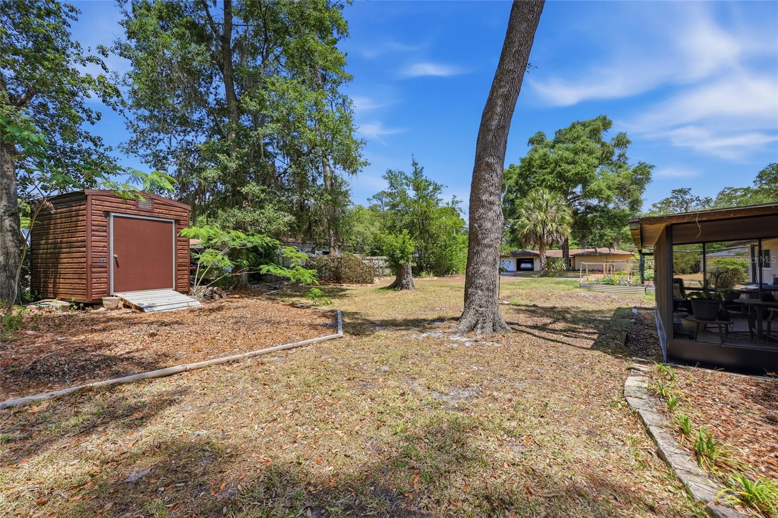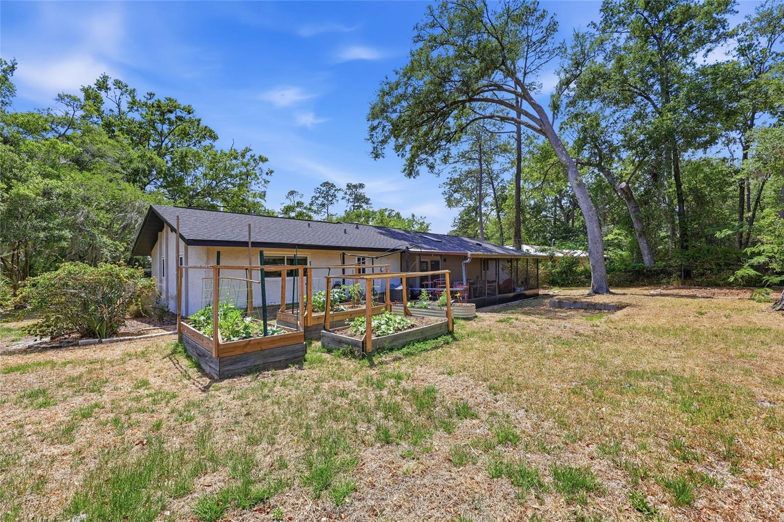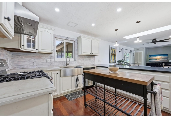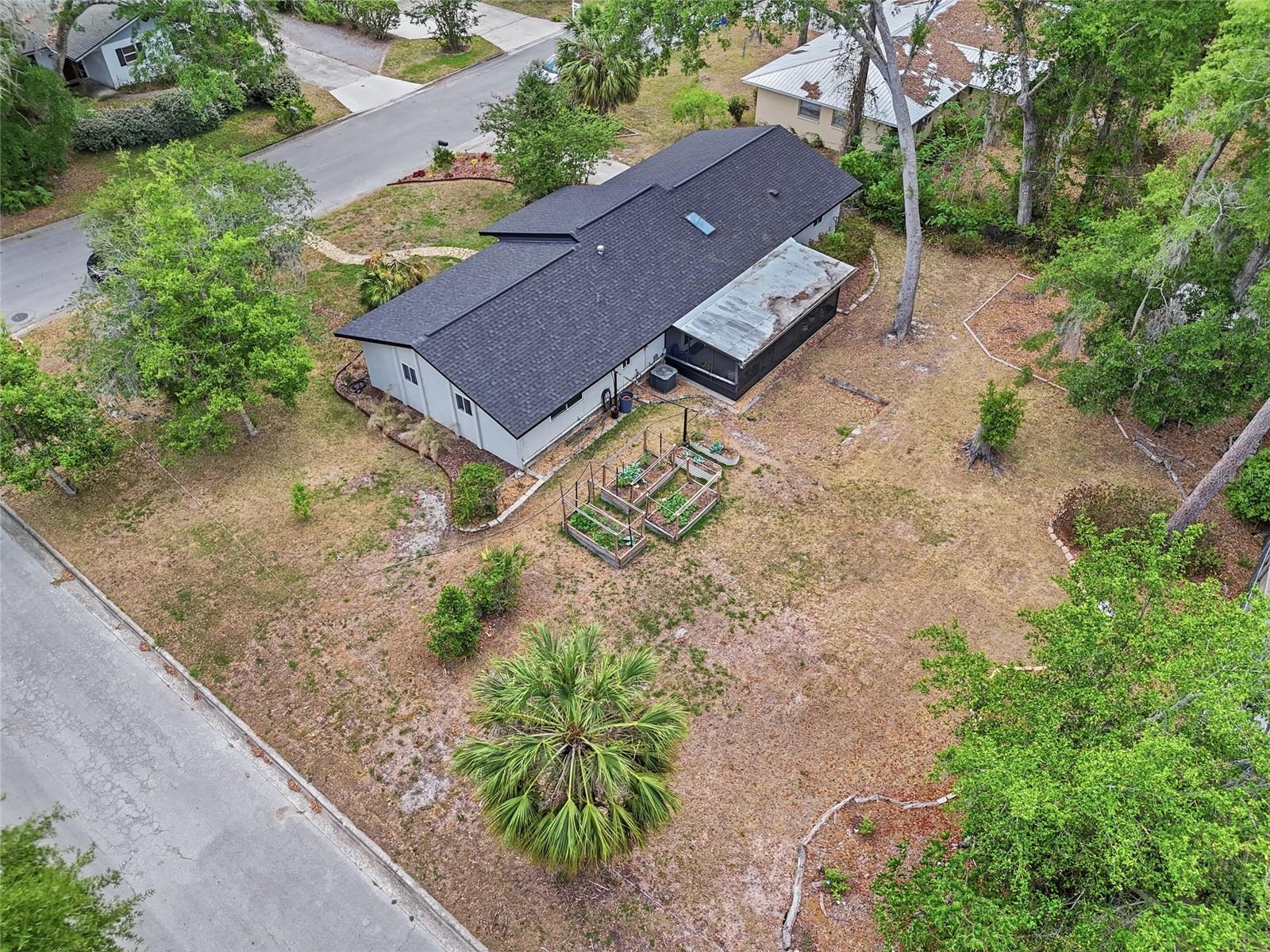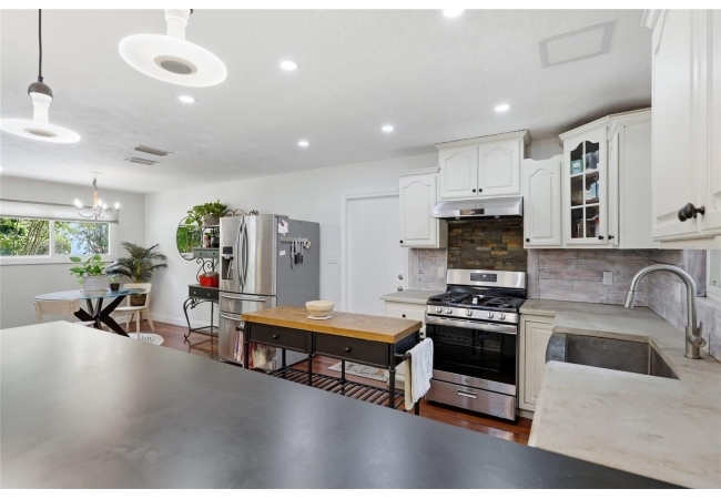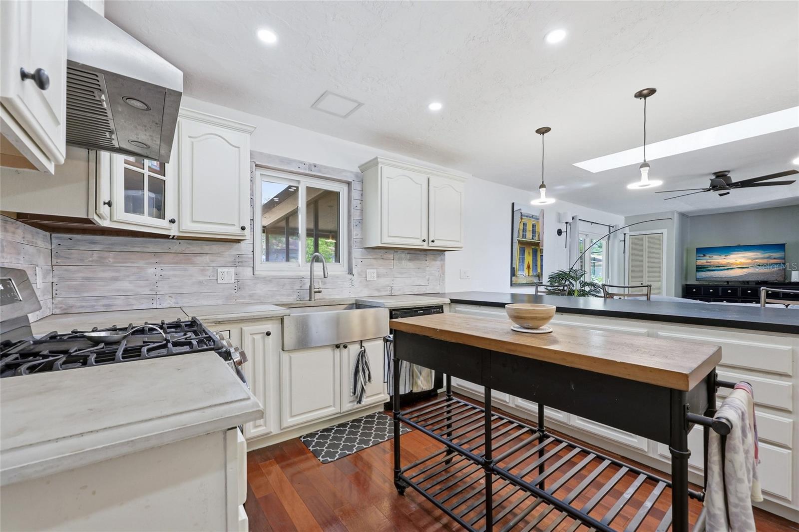 Character and modern updates define this 3-bed, 2-bath home situated on a sprawling 0.34-acre corner lot just 3 miles from the University of Florida! The 1,498 sq ft residence stands out for its durable stucco and stone exterior, a roof installed in 2023, and high-efficiency double-pane windows that refresh the traditional ranch profile. The front lawn and established garden beds frame the picturesque walkway that leads to a beautiful front door offering timeless curb appeal. Once inside, you are immediately greeted by an expansive open-concept great room where rich engineered hardwood floors stretch from the entrance into the common areas and down the hallway. This central hub flows into a modern farmhouse eat-in kitchen that includes an apron-front sink, gas stove with artisan backsplash, oversized breakfast bar, industrial-chic lighting, and a skylight bathing the space in natural light. Beyond the social center of the home, the private hallway leads to the sleeping quarters where unique bespoke bedroom doors add a touch of handcrafted elegance, and the guest bathroom features an updated vanity and tub-shower combination. The primary suite boasts an ensuite with a walk-in shower for personal comfort. Sliding glass doors off the great room open to a spacious screened porch, perfect for enjoying the Florida breeze before stepping out to the large, partially fenced backyard which includes a storage shed and plenty of room for gardening. Practicality is rounded out by a one-car garage that houses the laundry area and efficient natural gas systems. Tucked within the established Palm View Estates, this property places you a block from city transit and a short stroll from the nature trails at Westside Park and the boutique shops of Millhopper. Call today to secure your private tour of this one-of-a-kind Gainesville property!