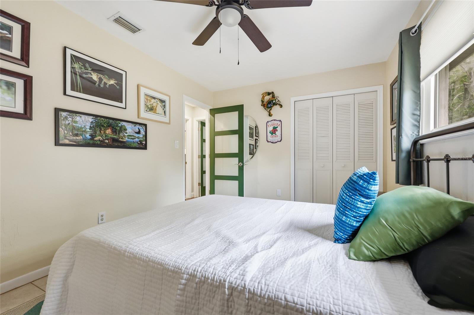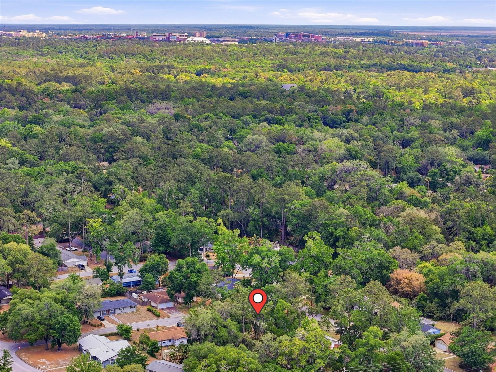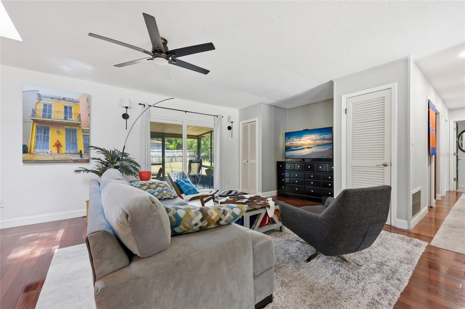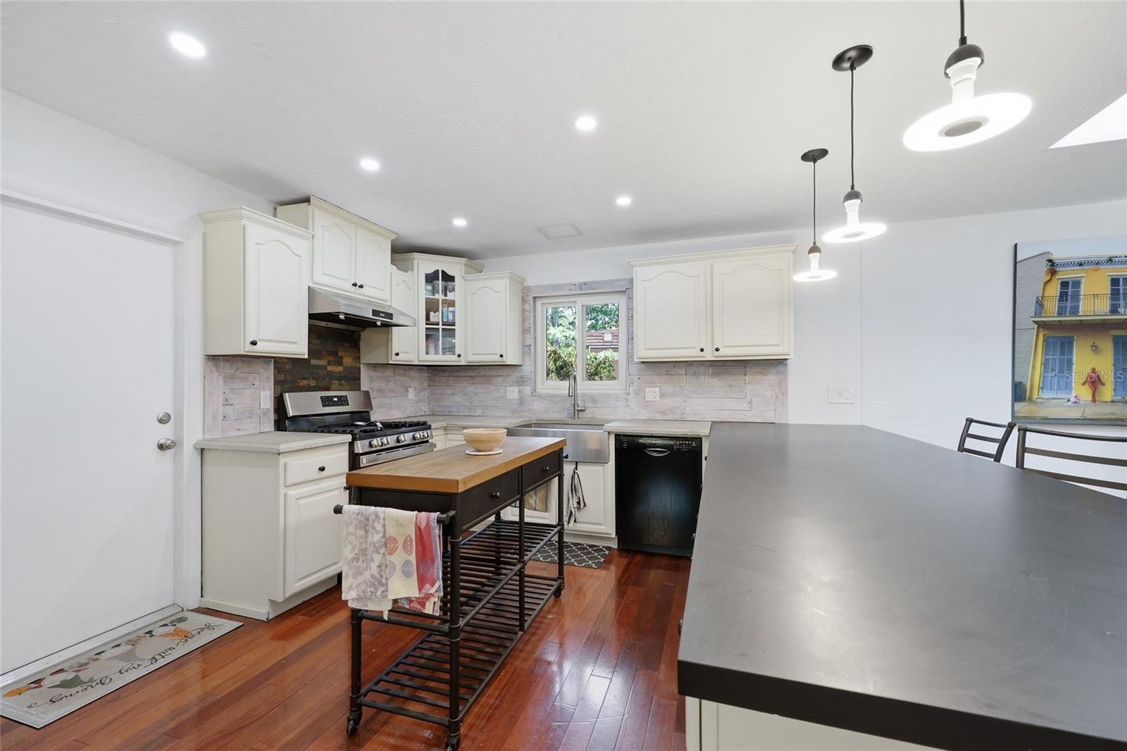 Character and modern updates define this 3-bed, 2-bath home situated on a sprawling 0.34-acre corner lot just 3 miles from the University of Florida! The 1,498 sq ft residence stands out for its durable stucco and stone exterior, a roof installed in 2023, and high-efficiency double-pane windows that refresh the traditional ranch profile. The front lawn and established garden beds frame the picturesque walkway that leads to a beautiful front door offering timeless curb appeal. Once inside, you are immediately greeted by an expansive open-concept great room where rich engineered hardwood floors stretch from the entrance into the common areas and down the hallway. This central hub flows into a modern farmhouse eat-in kitchen that includes an apron-front sink, gas stove with artisan backsplash, oversized breakfast bar, industrial-chic lighting, and a skylight bathing the space in natural light. Beyond the social center of the home, the private hallway leads to the sleeping quarters where unique bespoke bedroom doors add a touch of handcrafted elegance, and the guest bathroom features an updated vanity and tub-shower combination. The primary suite boasts an ensuite with a walk-in shower for personal comfort. Sliding glass doors off the great room open to a spacious screened porch, perfect for enjoying the Florida breeze before stepping out to the large, partially fenced backyard which includes a storage shed and plenty of room for gardening. Practicality is rounded out by a one-car garage that houses the laundry area and efficient natural gas systems. Tucked within the established Palm View Estates, this property places you a block from city transit and a short stroll from the nature trails at Westside Park and the boutique shops of Millhopper. Call today to secure your private tour of this one-of-a-kind Gainesville property!