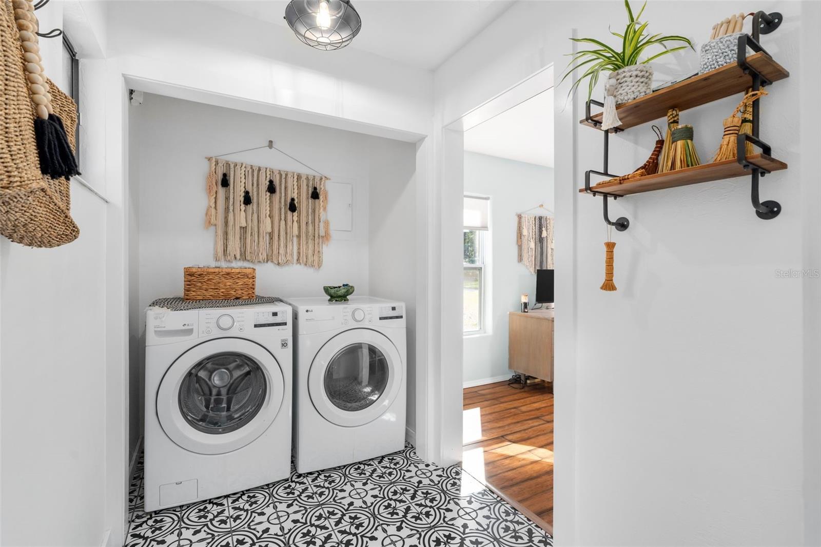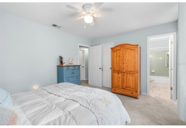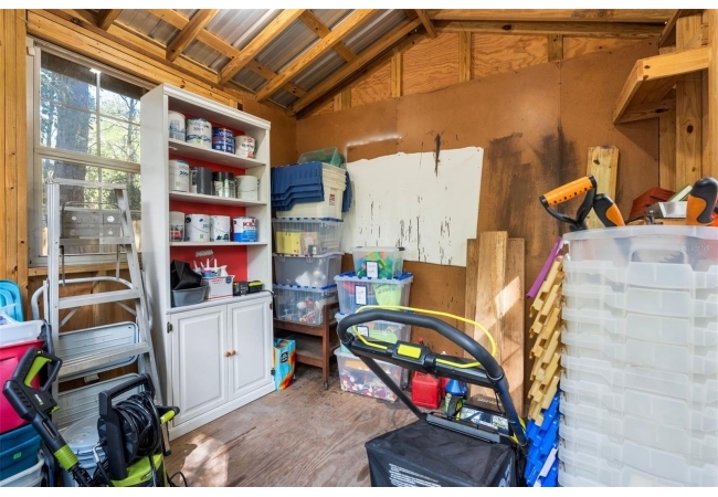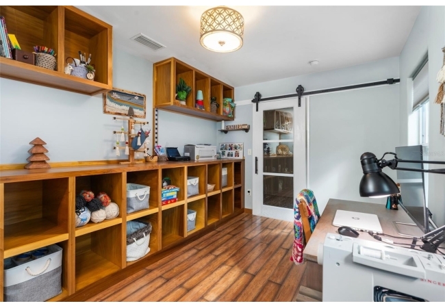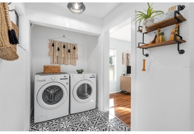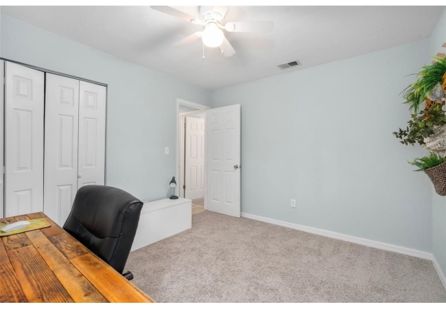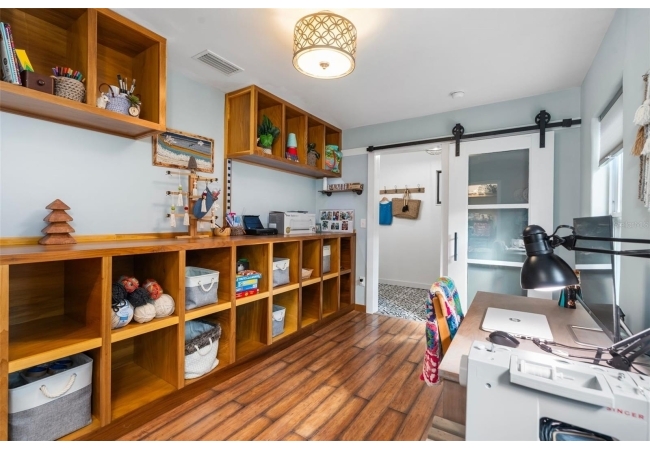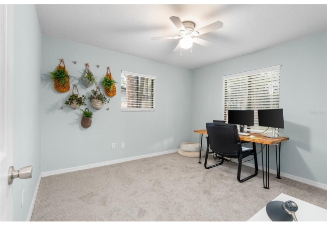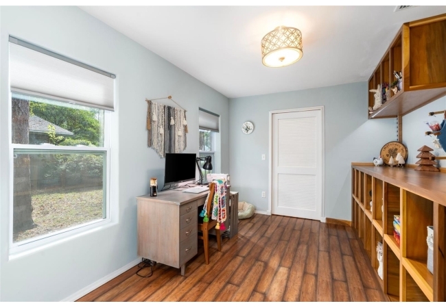 Down the hallway, the primary bedroom offers a peaceful retreat featuring brand-new carpet, a private en-suite bathroom and a large walk-in closet. The second spacious bedroom also includes new carpet and welcomes an abundance of natural light, creating a warm and inviting space. The third bedroom is conveniently located off the charming laundry room (washer and dryer included!) and currently serves as a cozy art studio, but designed with flexibility in mind — easily transforming into a home office, gym, playroom, or any creative retreat. The custom birch wood built-ins add warmth and sophistication while offering smart, functional storage.