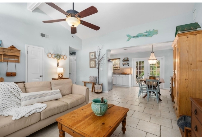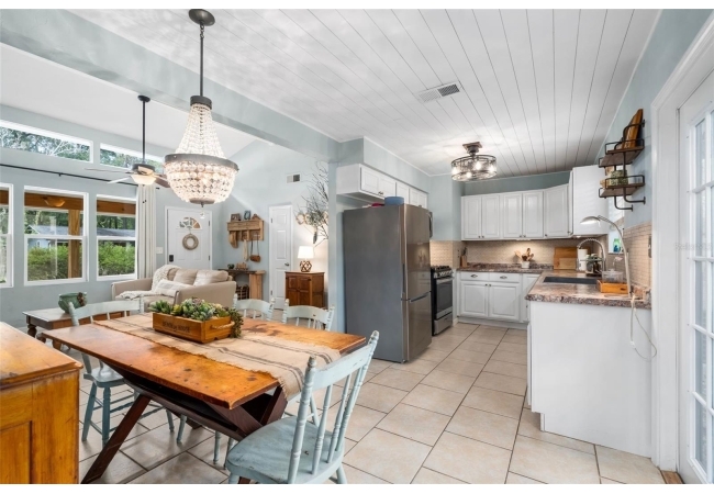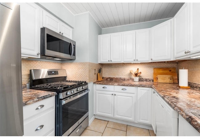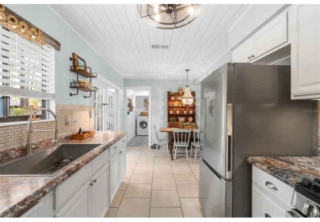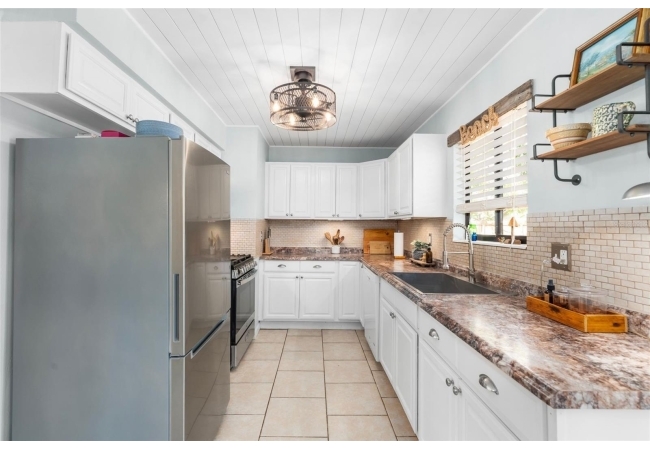 Inside, you’ll find a bright, open layout filled with character and warmth including vaulted, cathedral ceilings in the main living room and a gorgeous wood ceiling feature in the kitchen/dining area. The newly updated kitchen is a true highlight — featuring a beautiful, brand-new GE gas range, brand new built-in Samsung microwave, and brand new, large Vissani stainless steel refrigerator. Additionally, a deep farmhouse-style, stainless steel sink sits perfectly beneath the kitchen window, inviting in natural light and a gentle backyard breeze.