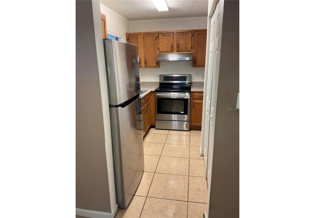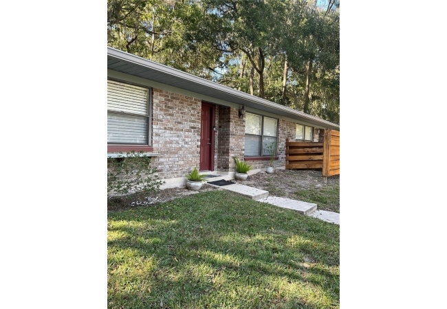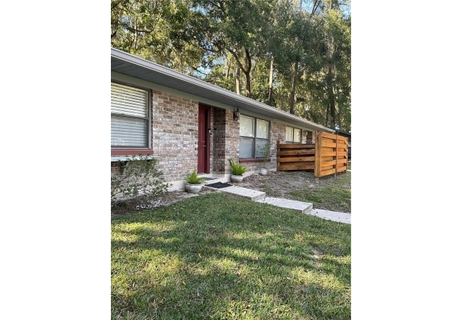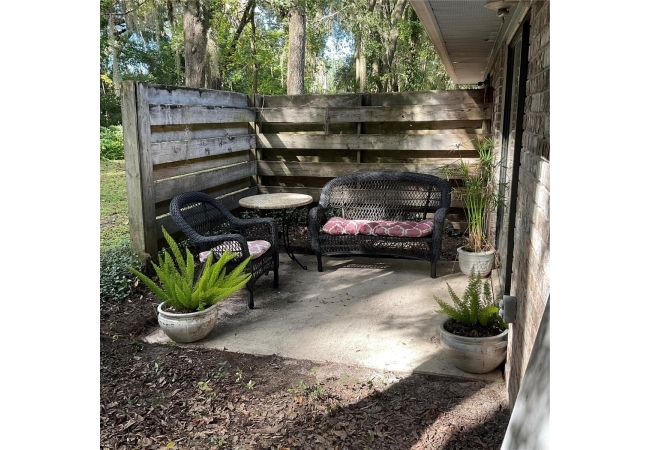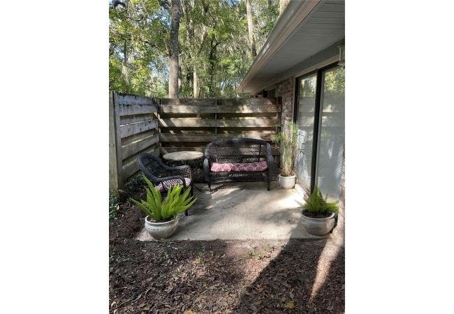 Charming updated 2-Bedroom, 2 Bath end unit nestled in a peaceful setting. This beautifully maintained home offers a perfect blend of comfort, privacy, and modern convenience. Ideal for those who love quiet surroundings while still being close to everything. Step inside to find a bright and inviting living space with neutral tones, tile flooring in the main areas, and plush carpeting in the bedrooms. The kitchen features solid wood cabinetry, stainless steel appliances, and ample counter space. Primary bedroom showcases a frameless glass walk-in shower, modern tile work, LED lighted mirror, a marble vanity with sleek chrome fixtures. Step outside through sliding glass doors to your private fenced patio, perfect for relaxing or entertaining under the shade of mature oaks. Close to Celebration Pointe and Butler Plaza for convenient shopping. Also Close to the University of Florida and Shands Hospital.