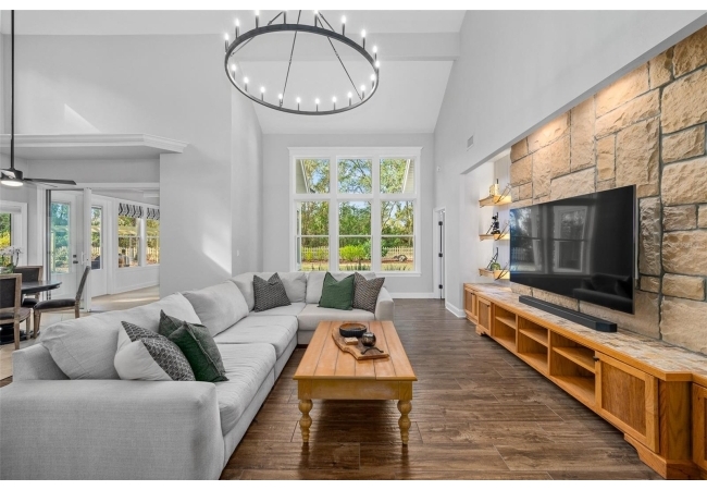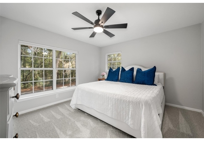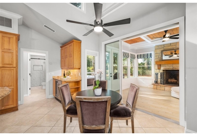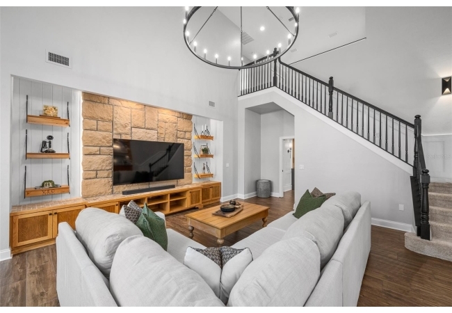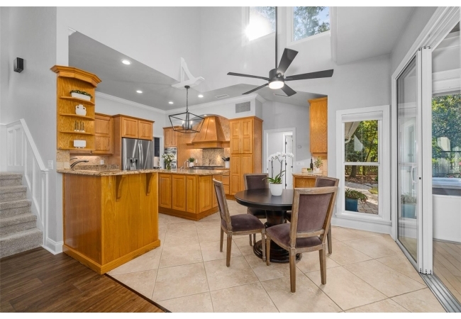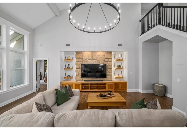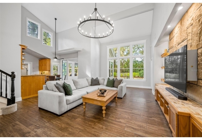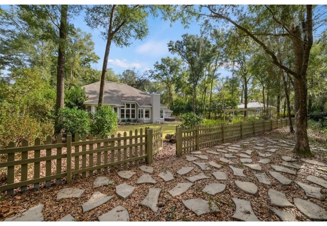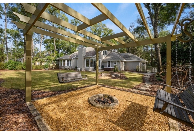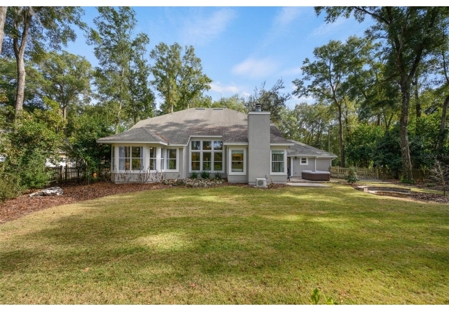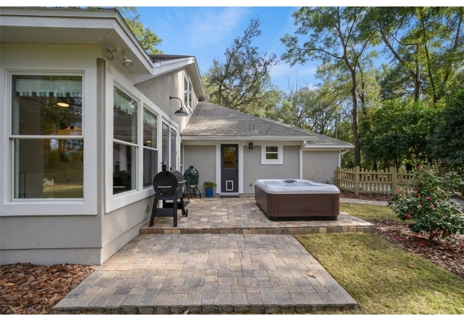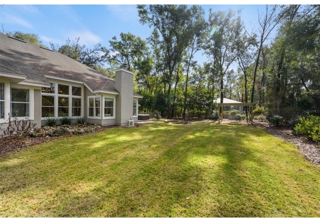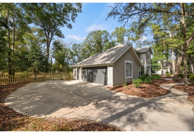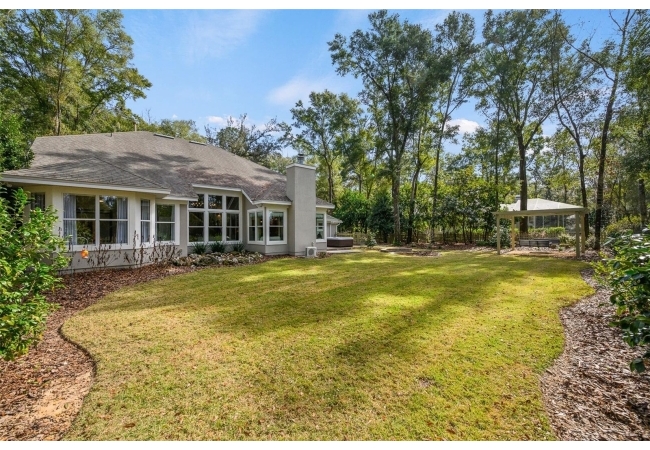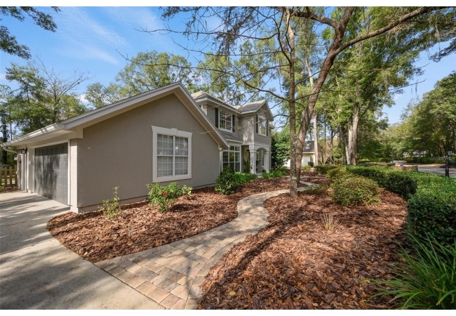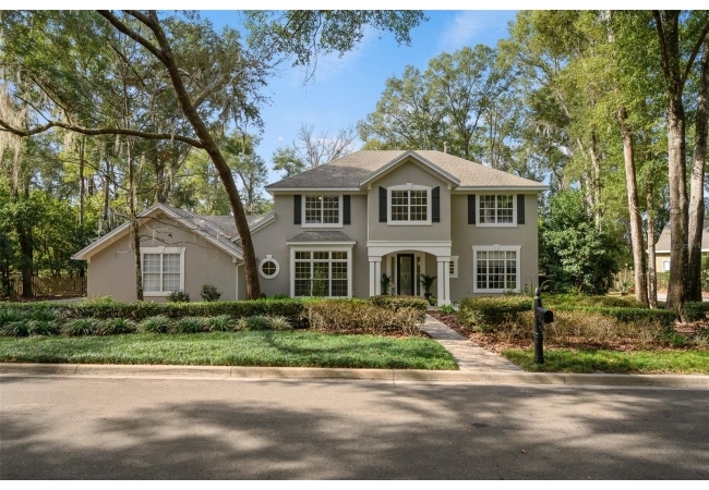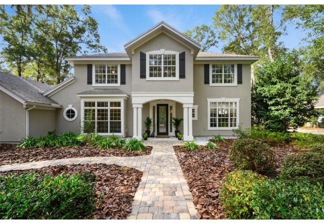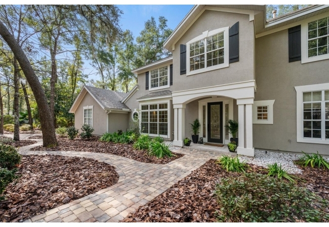 You'll love coming home to this completely renovated two-story luxury home situated on a premium lot in Haile Plantation. Exceptional curb appeal and a brick paver pathway leads to this stately home with a gorgeous leaded-glass front door. Inside, the elegant formal dining room sits to the left, featuring classic wainscoting and a stunning chandelier—perfect for entertaining. Beyond the dining room, the expansive family room impresses with cathedral ceilings, a dramatic lighted stone entertainment wall, and a gorgeous oversized chandelier that anchors the space. The chef’s kitchen is truly the heart of the home, thoughtfully designed with stainless steel appliances including a Wolf six-burner gas cooktop, a wall oven and microwave, granite countertops, custom wood cabinetry, a wine refrigerator, and a wood vent hood. A large island with a prep sink provides additional workspace. The kitchen overlooks the breakfast nook and the sun-filled Florida room, which features a wood-burning fireplace and a coffered ceiling, all overlooking the newly landscaped, expansive backyard. Located between the dining room and kitchen is an incredible butler's pantry with a built-in oven, granite countertop, glass door cabinetry and a large walk-in pantry with custom shelving. Just off the kitchen is a well appointed full bath ideal for pool or outdoor access.The large laundry/mud room is complete with a second refrigerator, a sink, lots of cabinets and a window. The primary suite is conveniently located on the main level and offers a large walk-in closet and a beautifully renovated, spa-like en suite bath with dual vanities, a free standing soaking tub, and an exceptional walk-in shower with floor to ceiling tile and multiple shower heads. Also on the main floor is a spacious guest bedroom with a Murphy bed, a fully renovated hall bathroom with a walk-in shower. Upstairs, you’ll find a generous flex space, two additional bedrooms, and a full bathroom with double sinks and a tub/shower combination. A large storage/bonus room adds versatility, and one of the upstairs bedrooms is plumbed for an additional bathroom. Step outside to a private, low-maintenance, fenced backyard featuring a hot tub, a charming gazebo with swings, and a fire pit—perfect for relaxing or entertaining. The Haile Plantation community offers miles of walking trails, parks, playgrounds, basketball, a Village Center with shops and restaurants and the Hawkstone Country Club. The Hawkstone Country Club (membership required) offers dining, golf, tennis, pickleball, a gym and two pools.