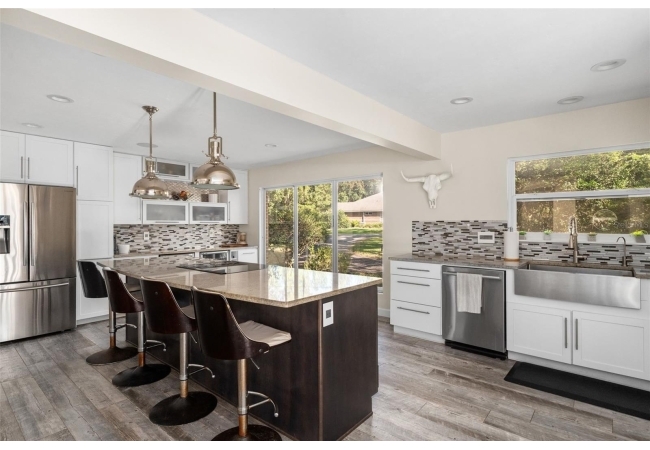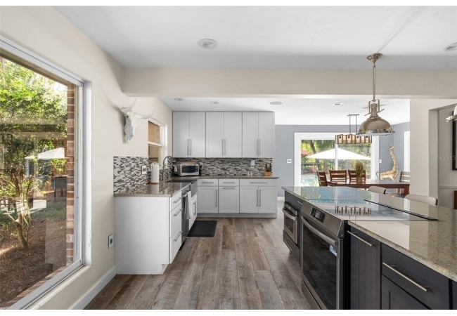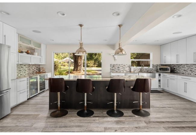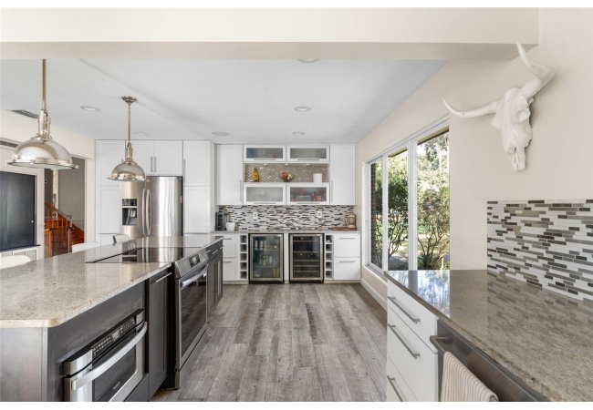 Inside, the main level showcases a gut-renovated chef’s kitchen featuring floor-to-ceiling cabinetry, granite countertops, stainless steel appliances, a wine bar, and a center island that opens into the grand living room — ideal for entertaining on any scale.