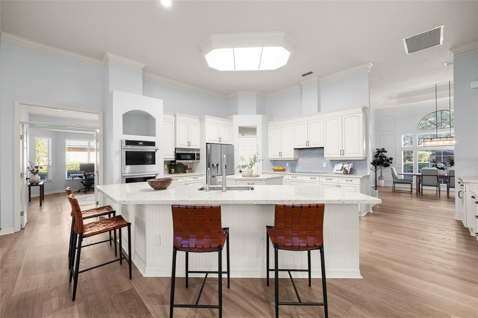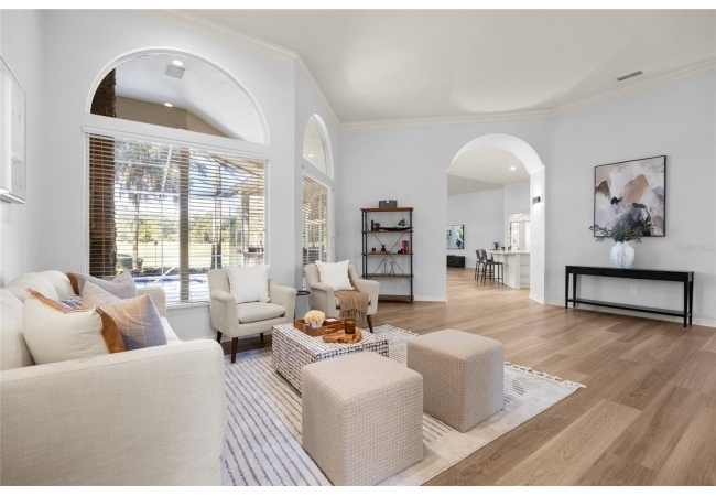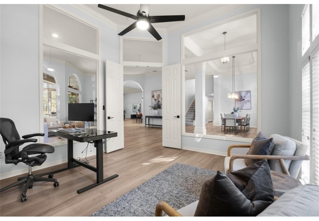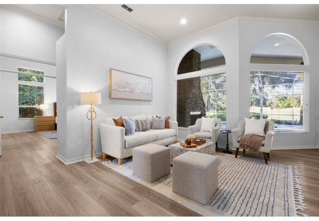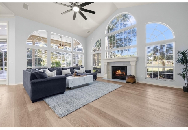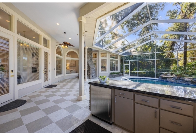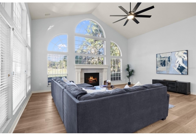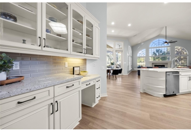 Welcome home to your beautifully updated Haile Plantation India Station estate, set on one of the most desirable golf course lots in Hawkstone Country Club, with sweeping views of the signature 10th hole. This stately home offers over 4,900 square feet of thoughtfully designed living space, blending refined finishes with comfort and functionality. As you arrive, a circular driveway framed by lush landscaping creates a gracious first impression, while the oversized 3 car garage with a built in workshop adds both convenience and storage. Step inside to soaring ceilings, abundant natural light, and brand new luxury vinyl plank flooring that flows throughout the main level. Off the entry, you'll find a grand home office with French doors, a formal dining room, and a secondary living area, perfect for entertaining or creating a quiet retreat. The home features a 4 way split floor plan, ensuring privacy and space for everyone. The heart of the home is the updated kitchen, where new quartz counters, a designer backsplash, and all new stainless steel appliances make a bold, modern statement. The kitchen opens to the family room and casual dining area, all of which are flooded with natural light and framed by stunning panoramic views of the golf course. Whether you're starting your morning with a cup of coffee or winding down in the evening, the view from this space is simply unmatched. All 4.5 bathrooms have been recently renovated with a cohesive, stylish design that feels timeless yet current. Frameless glass shower enclosures, beautiful tilework, and sleek quartz countertops create a polished, spa like feel throughout. Step outside to your private outdoor oasis, featuring a resort style pool with waterfall, a granite summer kitchen, a cozy outdoor fireplace, and expansive covered patio space, all with sweeping views of the fairway. With 4 main bedrooms and 4.5 baths, the home offers incredible flexibility. Two of the spacious bedrooms are separated by a flex room perfect for an ideal bonus living space, study retreat, or playroom. The upstairs bonus room has been reimagined as a true multi purpose space with endless possibilities, perfectly complemented by the updated full bath and new wet bar with refrigerator. Whether you envision a game room, private guest suite, fitness studio, hobby room, or teen retreat, this space is ready to accommodate your lifestyle. The spacious primary suite is tucked away on the main floor and offers tranquil golf course views, a luxurious updated en suite bath with quartz counters and enlarged zero entry shower, stand alone soaking tub, separated vanities, toilet closet and dual walk in closets. Beyond the home, residents enjoy all the perks of Haile Plantation, one of Gainesville’s most sought after communities. Stroll or bike along miles of shaded walking trails that wind through lush surroundings, or head to the charming Haile Village Center for coffee, dining, boutiques, and community events including the Saturday morning farmers market. With easy access to UF Health Shands, HCA Florida North Florida Hospital, Butler Plaza, Celebration Pointe, and I 75, the location offers unmatched convenience while preserving a peaceful, neighborhood feel.