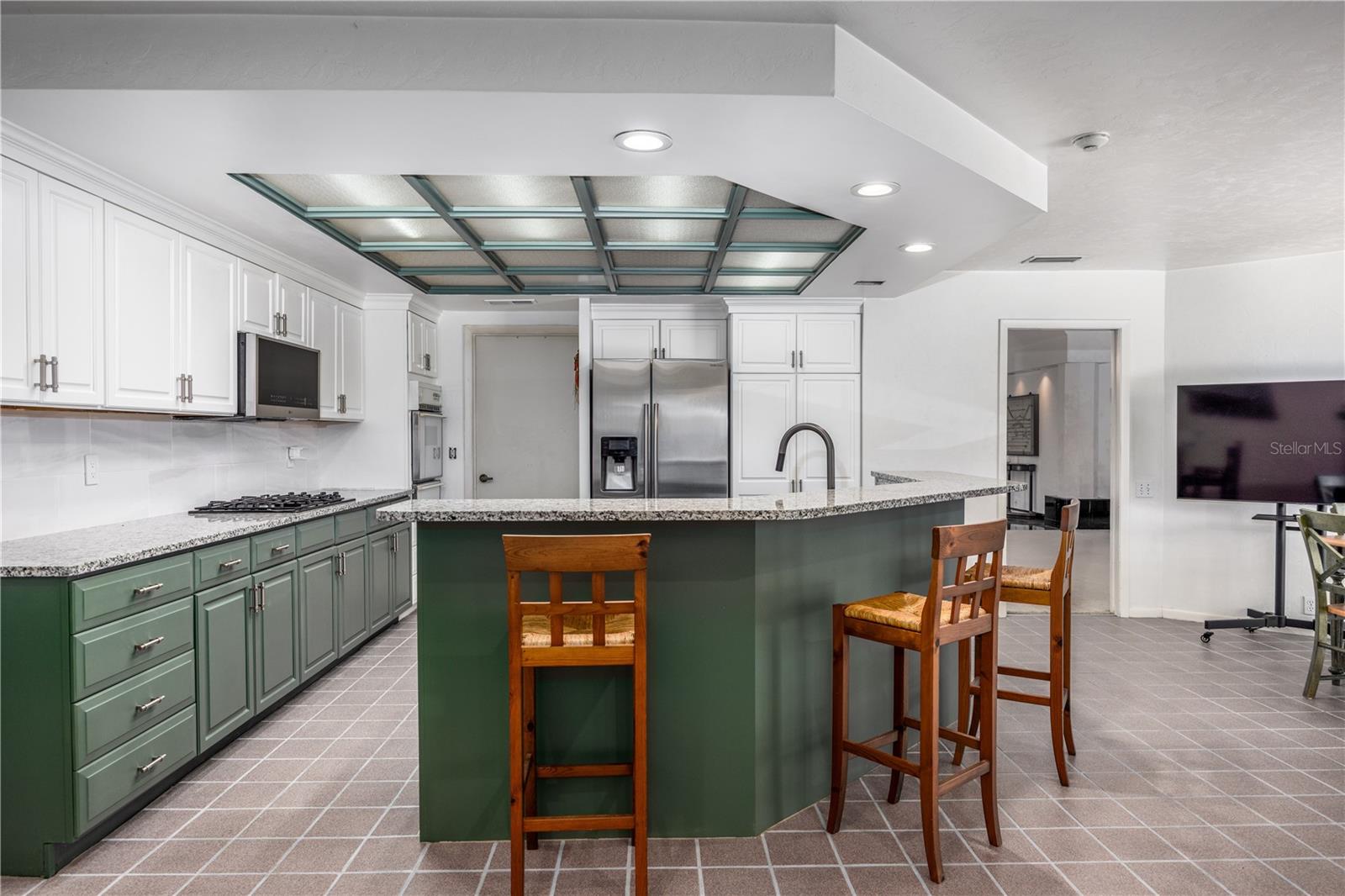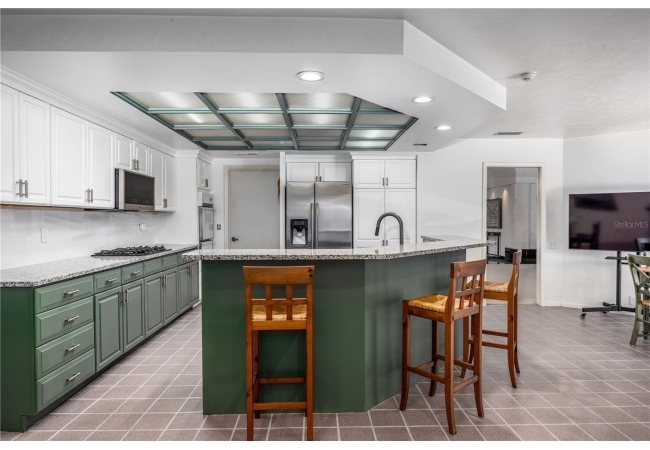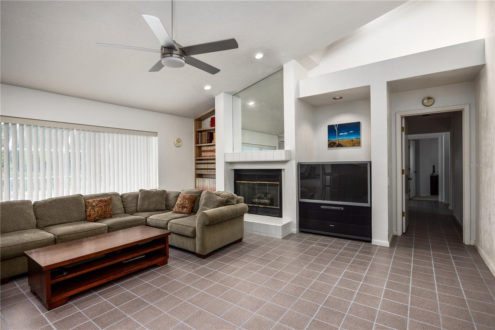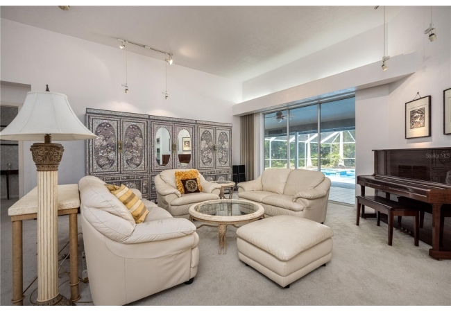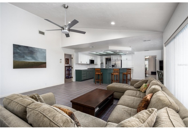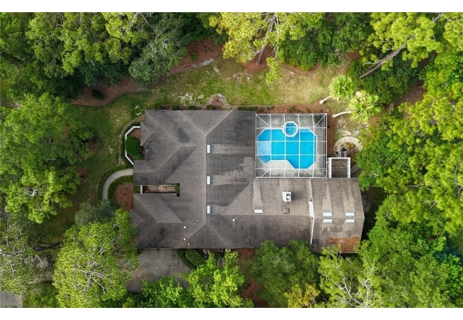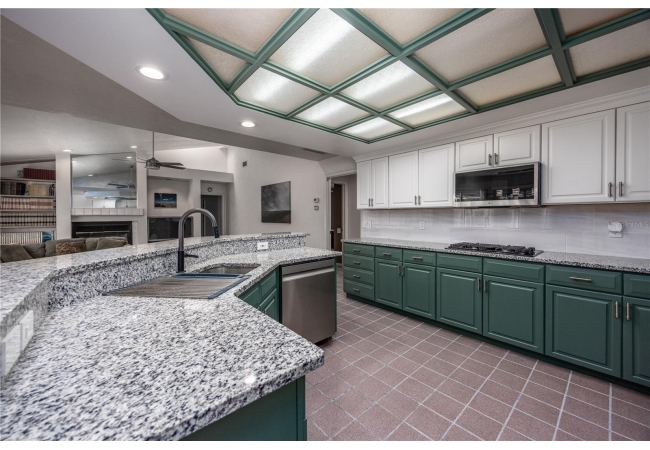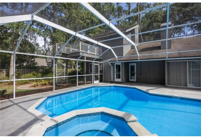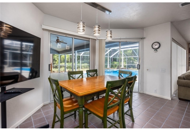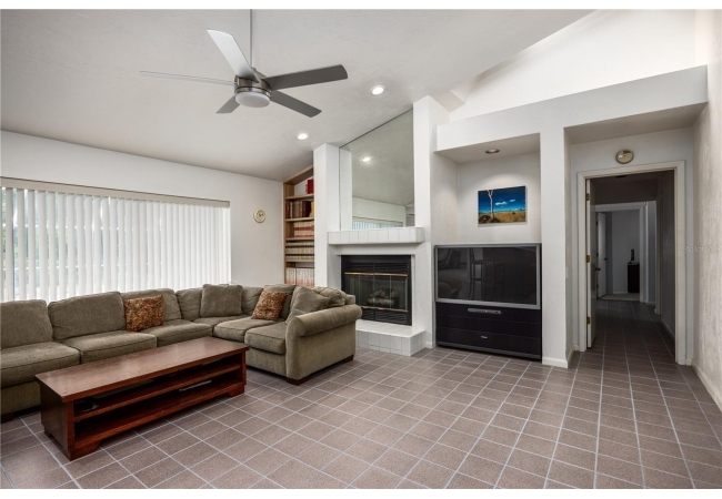 Enjoy high ceilings, abundant natural light, and views of the screened pool, a large family room with fireplace, a modern kitchen with island bar, breakfast nook, and modern appliances.