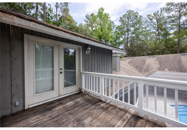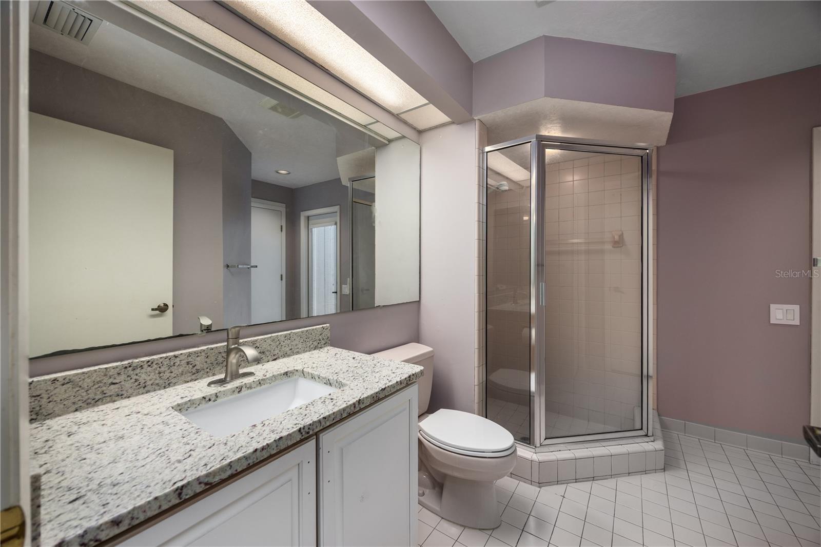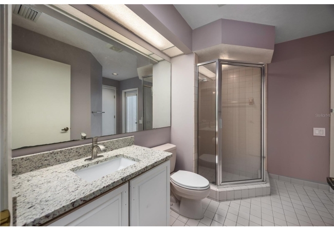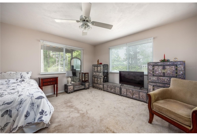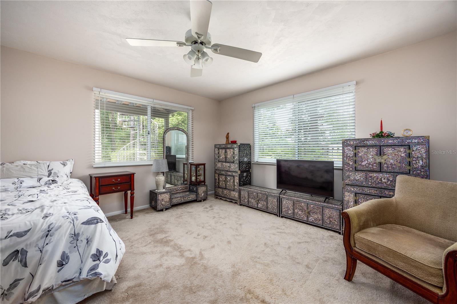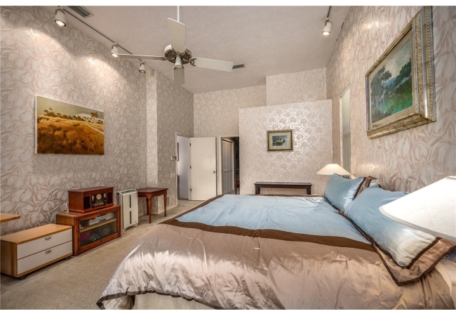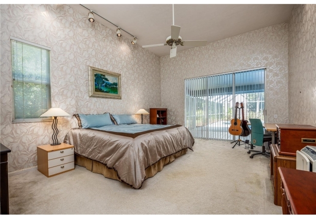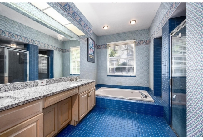 The primary suite overlooks the pool and features a luxurious en-suite bath with double vanities, walk-in shower, jetted tub, and walk-in closet.
