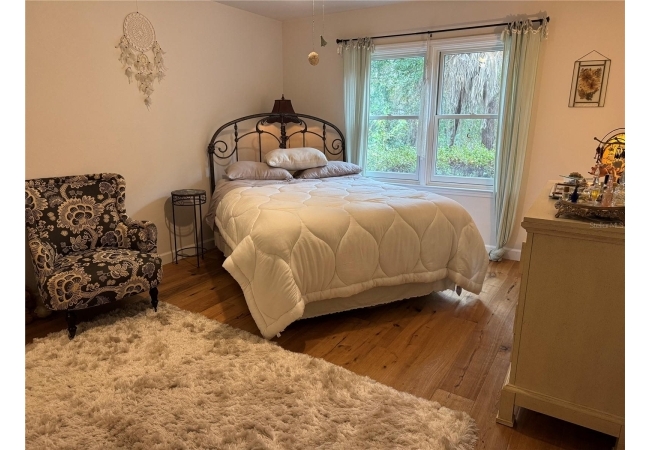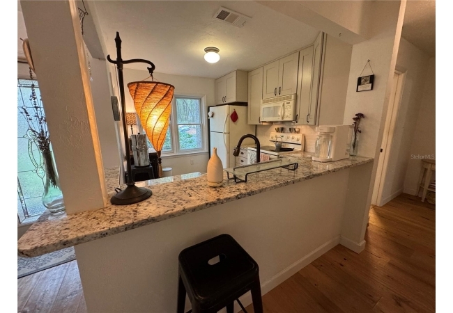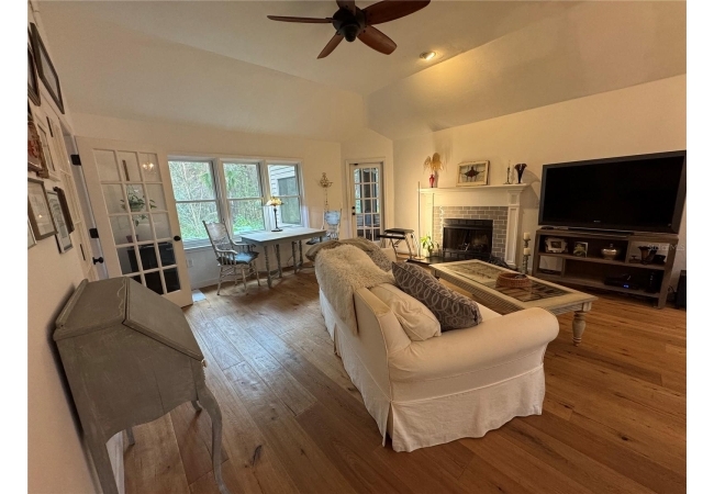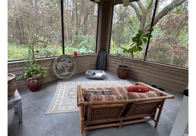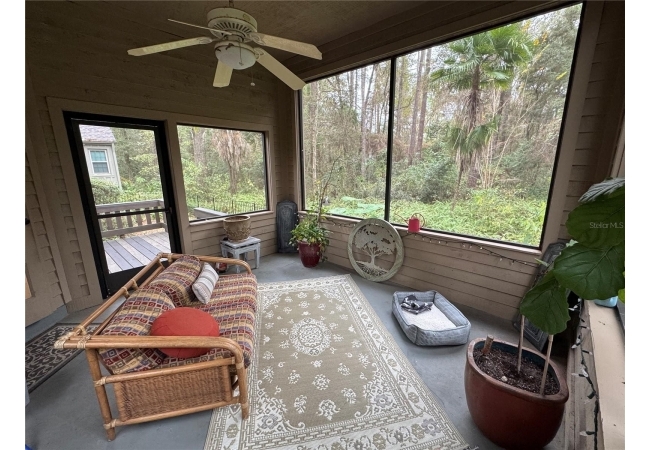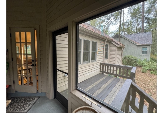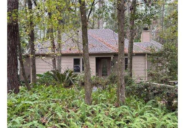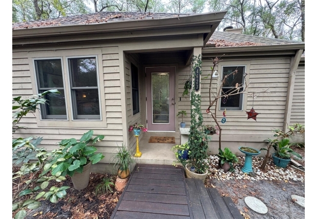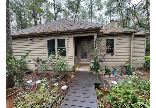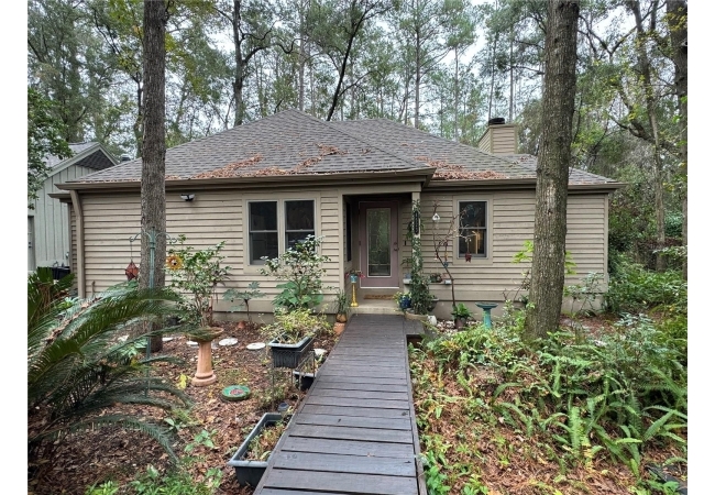 This home is nestled into the desirable Haile Plantation Founders Hill neighborhood on a beautifully wooded lot. This delightful 2 bedroom, 2 bath single family home offers privacy and tranquility. The foyer leads to an open and spacious living area with a cozy wood burning fireplace and open dining area. The kitchen has a small eat-in area and features granite countertops with a farmhouse sink. Hardwood flooring throughout the home. NO CARPET! The primary suite boasts a large walk-in closet. New roof was installed in 2022. Newer double insulated windows installed for enhanced energy efficiency. Screened porch opens to the wood deck overlooking the fenced backyard- perfect for outdoor entertaining or relaxation in the peaceful, shaded setting. Located one mile away from the heart of Haile Village with its many restaurants, shops, popular weekly farmers market, and Hawkstone Country Club. Less than 6 miles from the University of Florida, UF Health Shands, and the VA Hospital. This home combines the sought-after Haile Plantation lifestyle with modern updates and an unbeatable location!