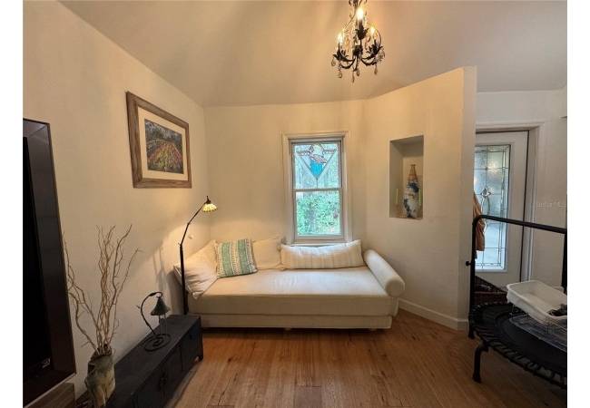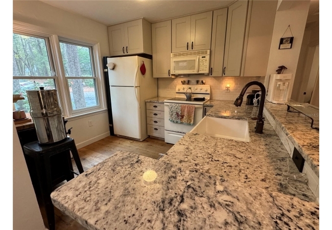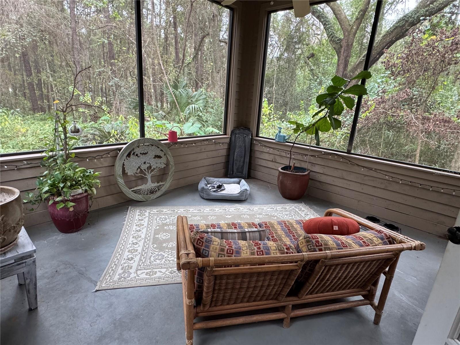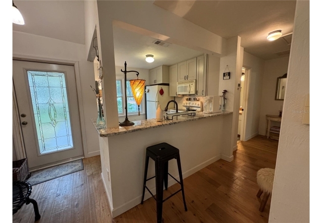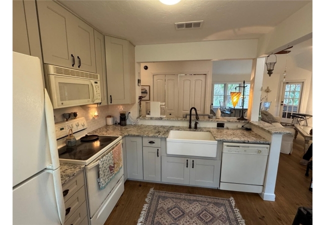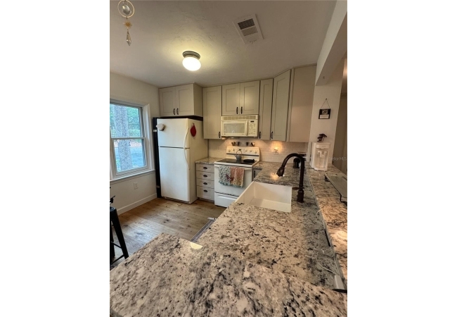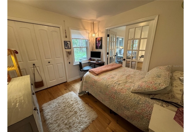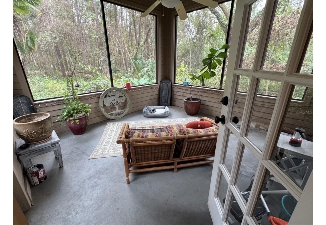 This home is nestled into the desirable Haile Plantation Founders Hill neighborhood on a beautifully wooded lot. This delightful 2 bedroom, 2 bath single family home offers privacy and tranquility. The foyer leads to an open and spacious living area with a cozy wood burning fireplace and open dining area. The kitchen has a small eat-in area and features granite countertops with a farmhouse sink. Hardwood flooring throughout the home. NO CARPET! The primary suite boasts a large walk-in closet. New roof was installed in 2022. Newer double insulated windows installed for enhanced energy efficiency. Screened porch opens to the wood deck overlooking the fenced backyard- perfect for outdoor entertaining or relaxation in the peaceful, shaded setting. Located one mile away from the heart of Haile Village with its many restaurants, shops, popular weekly farmers market, and Hawkstone Country Club. Less than 6 miles from the University of Florida, UF Health Shands, and the VA Hospital. This home combines the sought-after Haile Plantation lifestyle with modern updates and an unbeatable location!