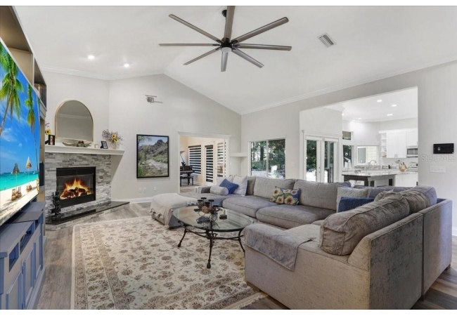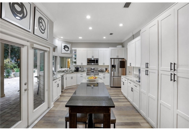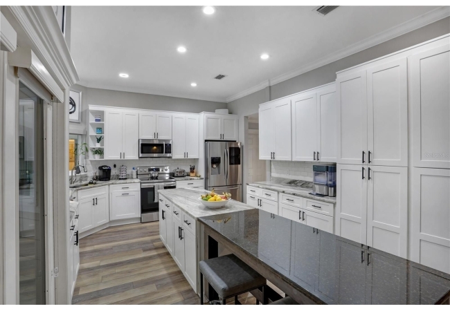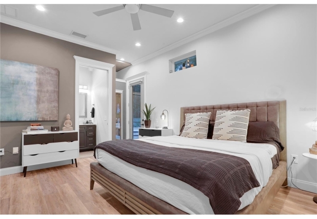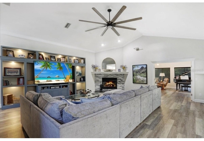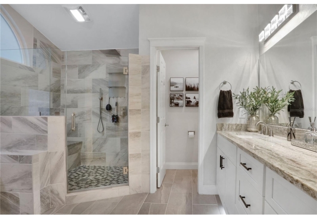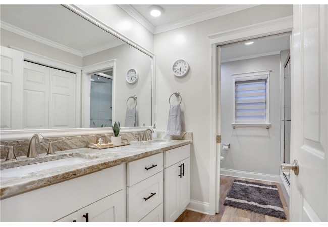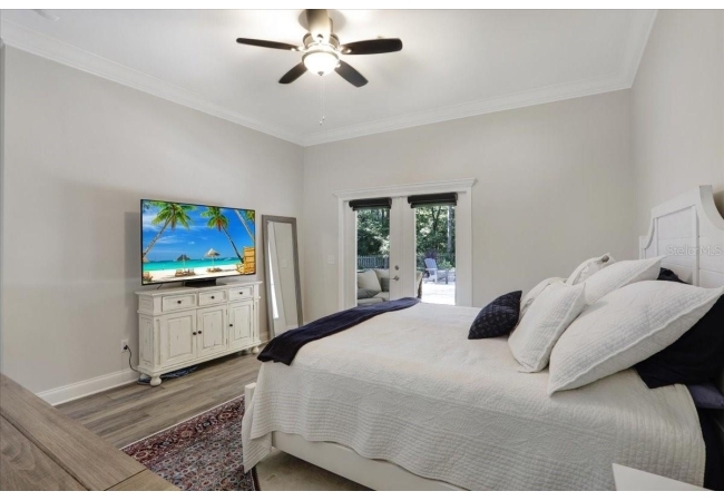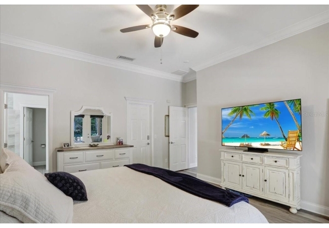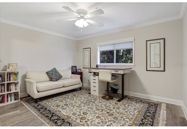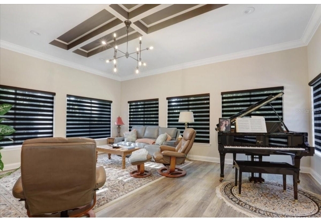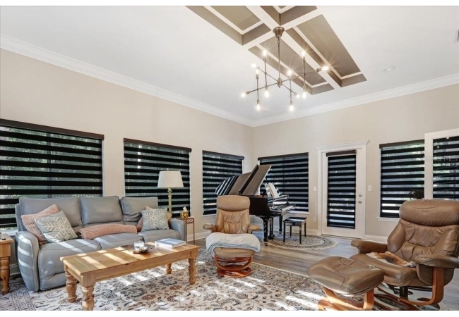 The spacious master suite is a true retreat, featuring a walk-in shower, soaking tub, dual-sink vanity, and custom-designed closet. On the opposite wing of the home, you’ll find three additional bedrooms and a full bath, creating ideal separation and flow. A light-filled Florida room overlooks the serene backyard, adding charm and additional living space.