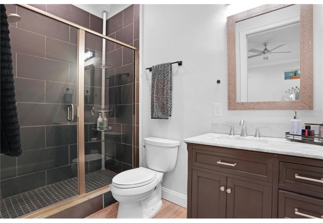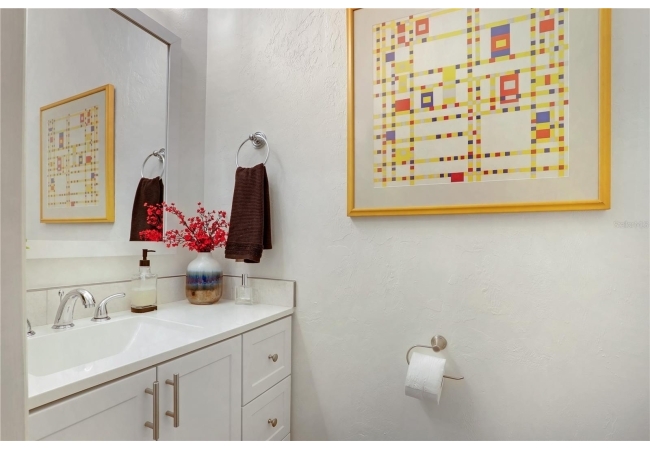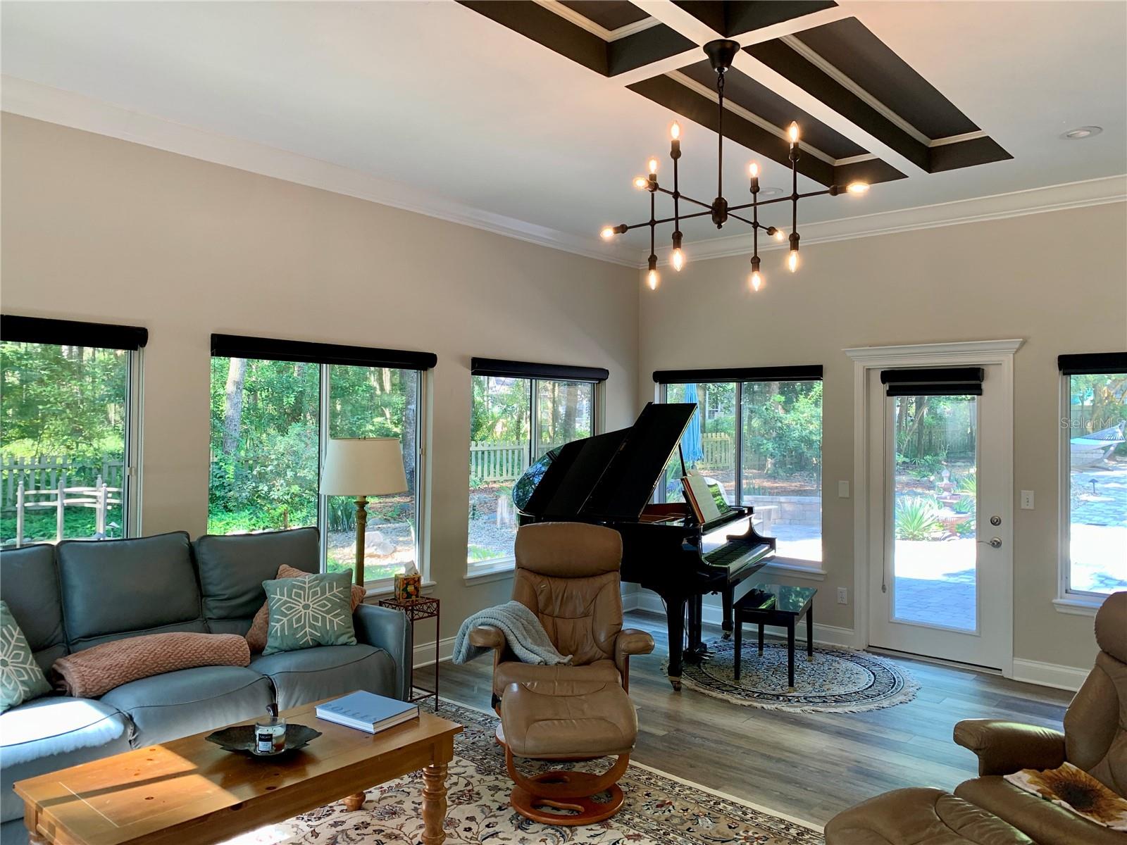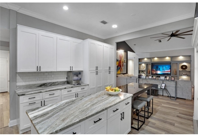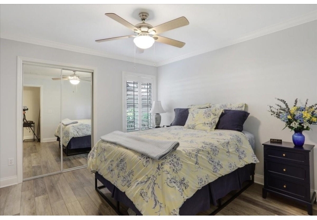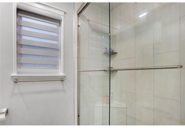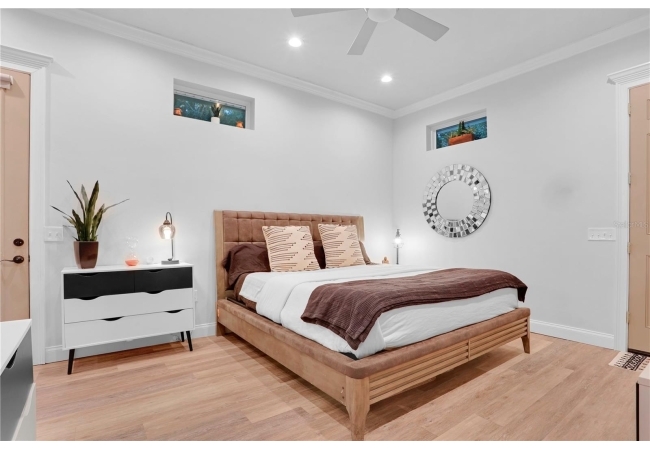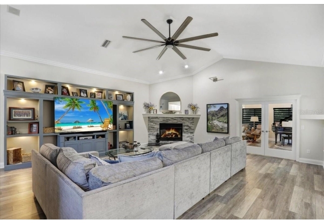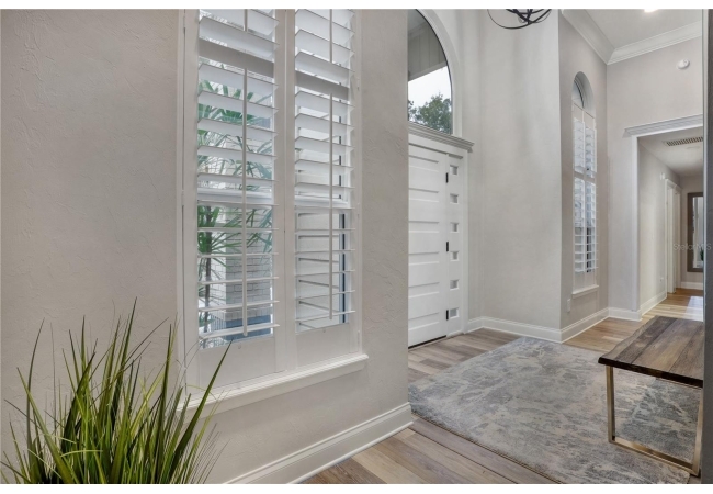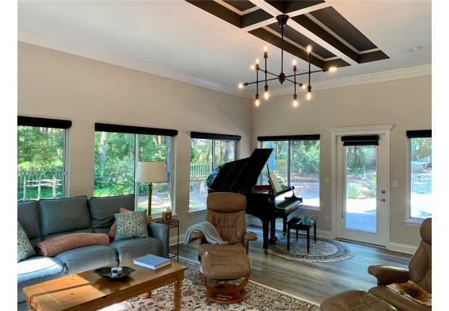 The spacious master suite is a true retreat, featuring a walk-in shower, soaking tub, dual-sink vanity, and custom-designed closet. On the opposite wing of the home, you’ll find three additional bedrooms and a full bath, creating ideal separation and flow. A light-filled Florida room overlooks the serene backyard, adding charm and additional living space.