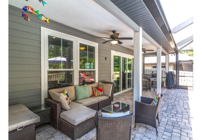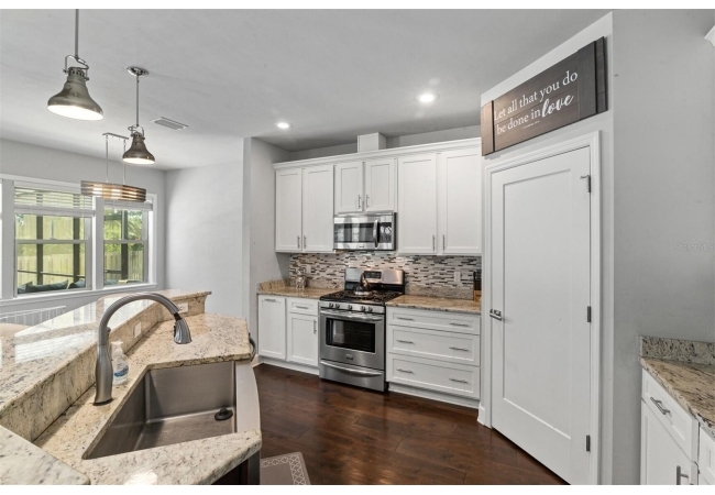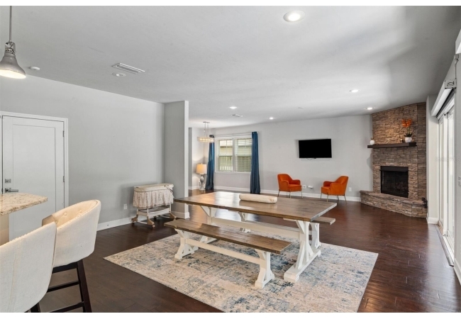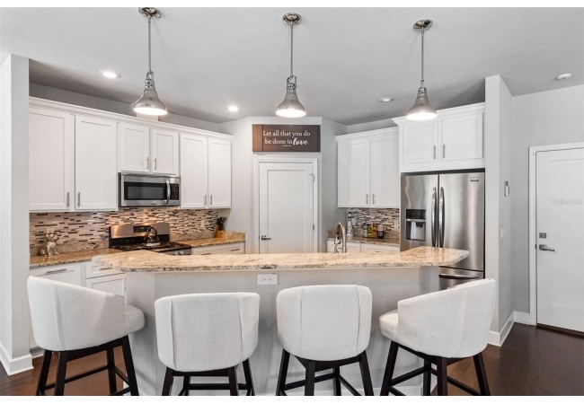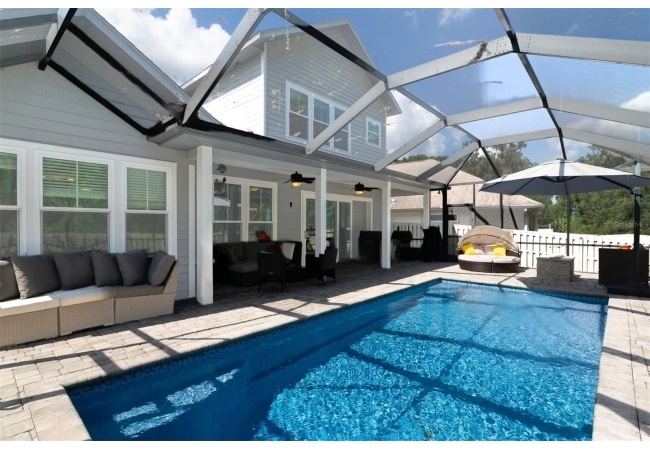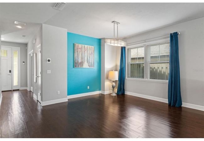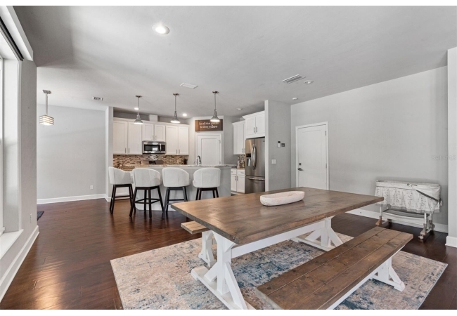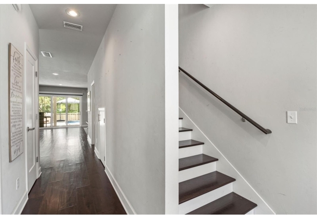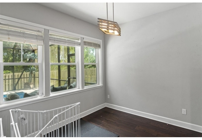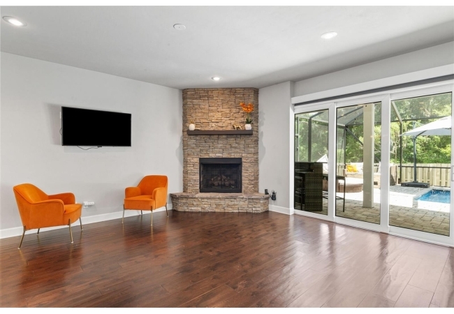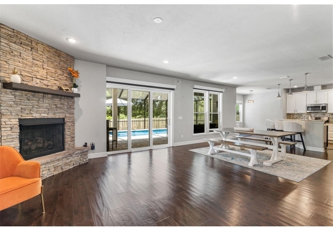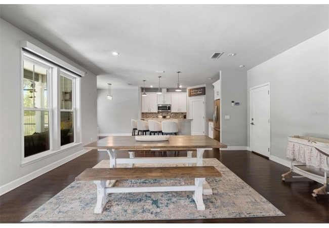 This home offers the best of both worlds: an open-concept living and dining area, along with clearly defined spaces to gather, dine, and entertain. The main floor is filled with natural light, featuring triple sliding glass doors that open to the screened-in pool area—perfect for seamless indoor-outdoor living. Additionally, the first-floor room is a versatile space that can be used as an office or flex room.