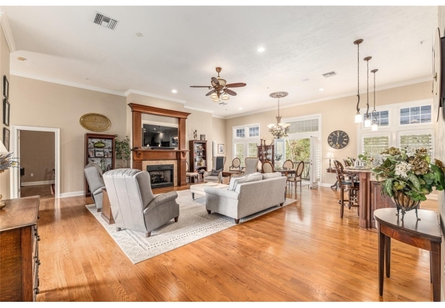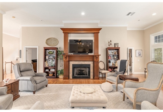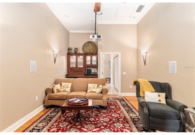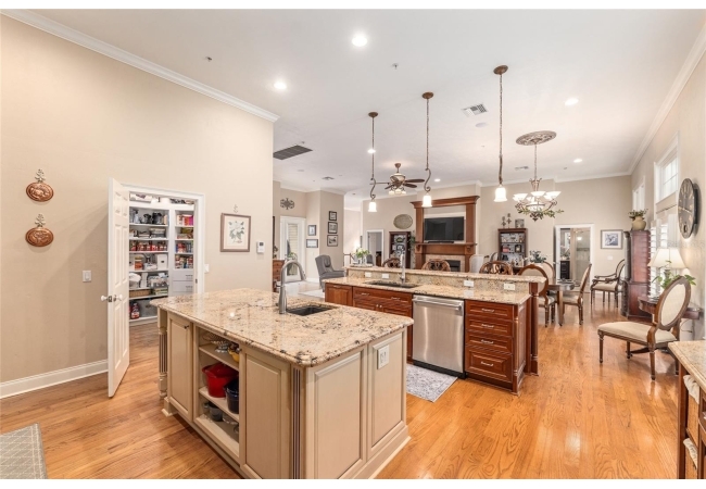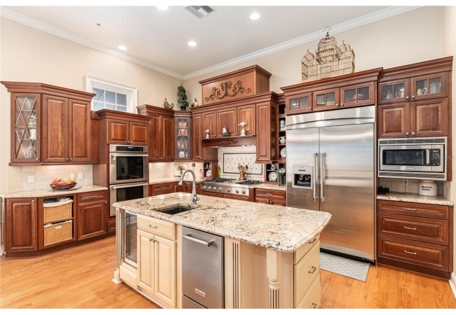 The third floor features luxurious finishes throughout, including wood floors, crown molding, and 15-foot ceilings. The showstopping kitchen boasts cherry cabinets, granite counters, two islands, and a Thermador appliance package. The living room/dining room combination includes a gas fireplace. This level also features a full bathroom and a theater room complete with a wet bar and refrigerator.