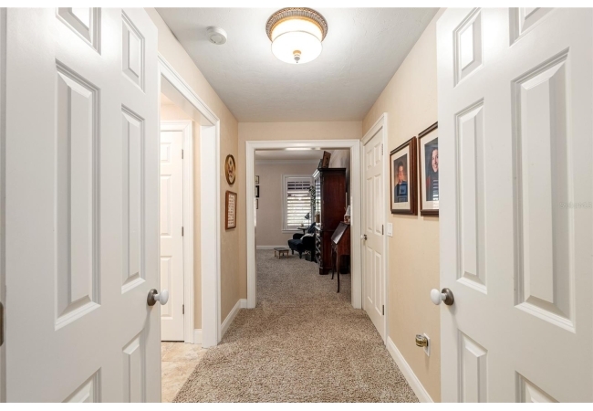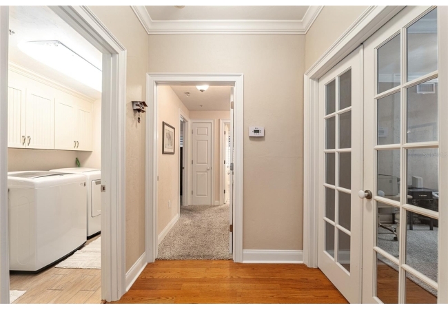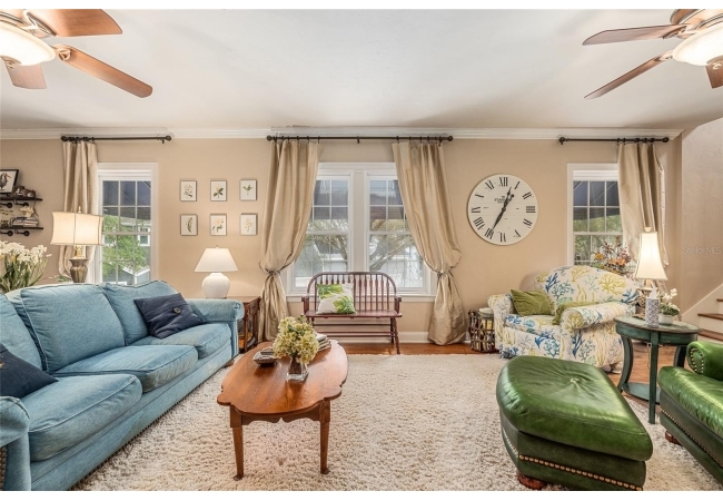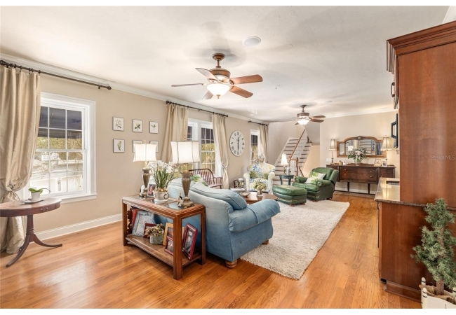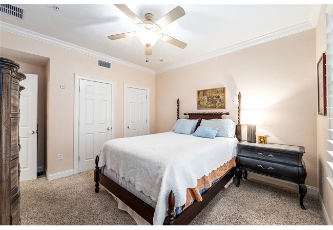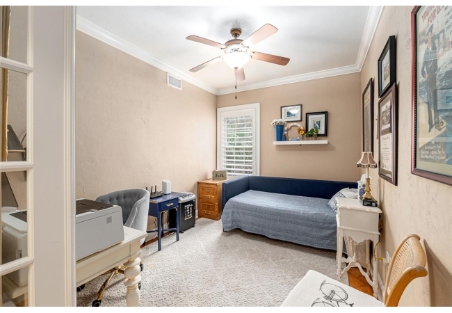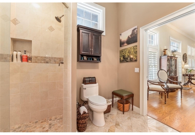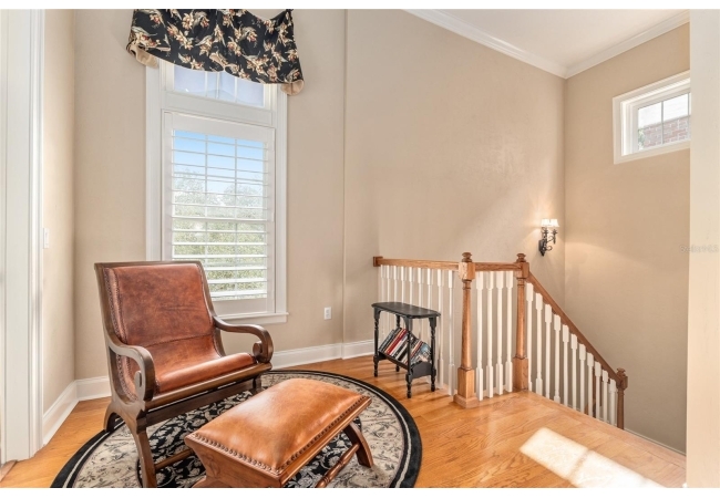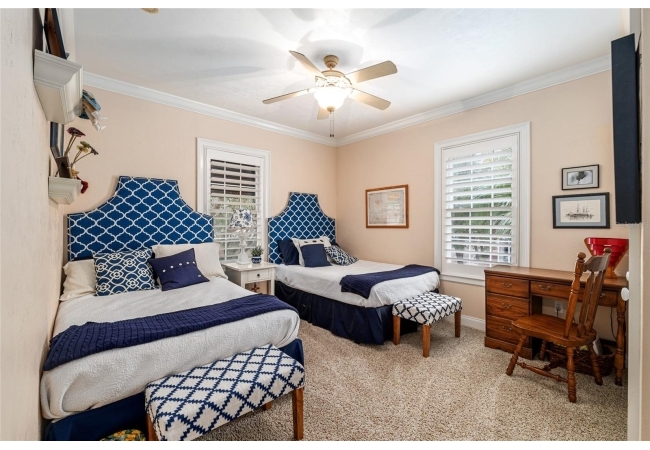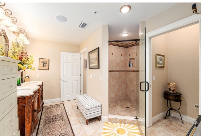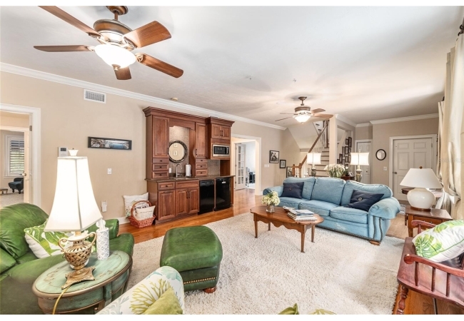 The second floor is a quiet oasis with three full bedrooms, a study, and a gathering area. The large primary bedroom features a spacious walk-in closet and a bathroom with marble floors, a large bathtub, and a walk-in shower. The large gathering space has built-ins, a microwave, and a second wet bar area. Abundant windows provide private views of the tree-lined Village street.
