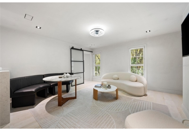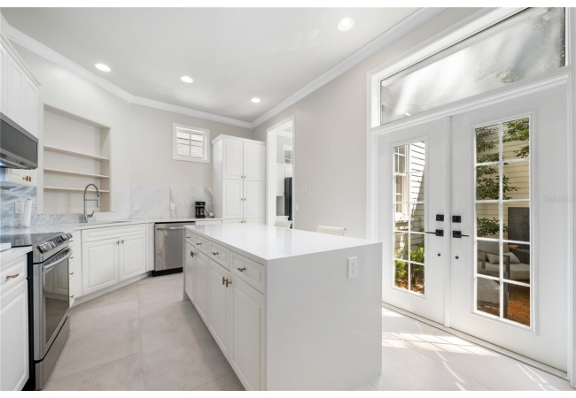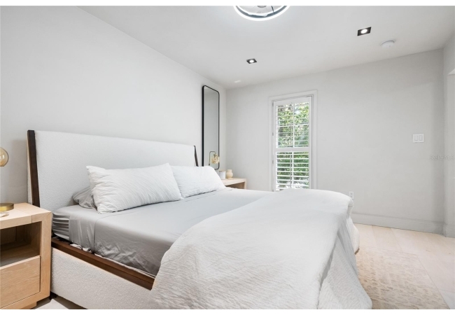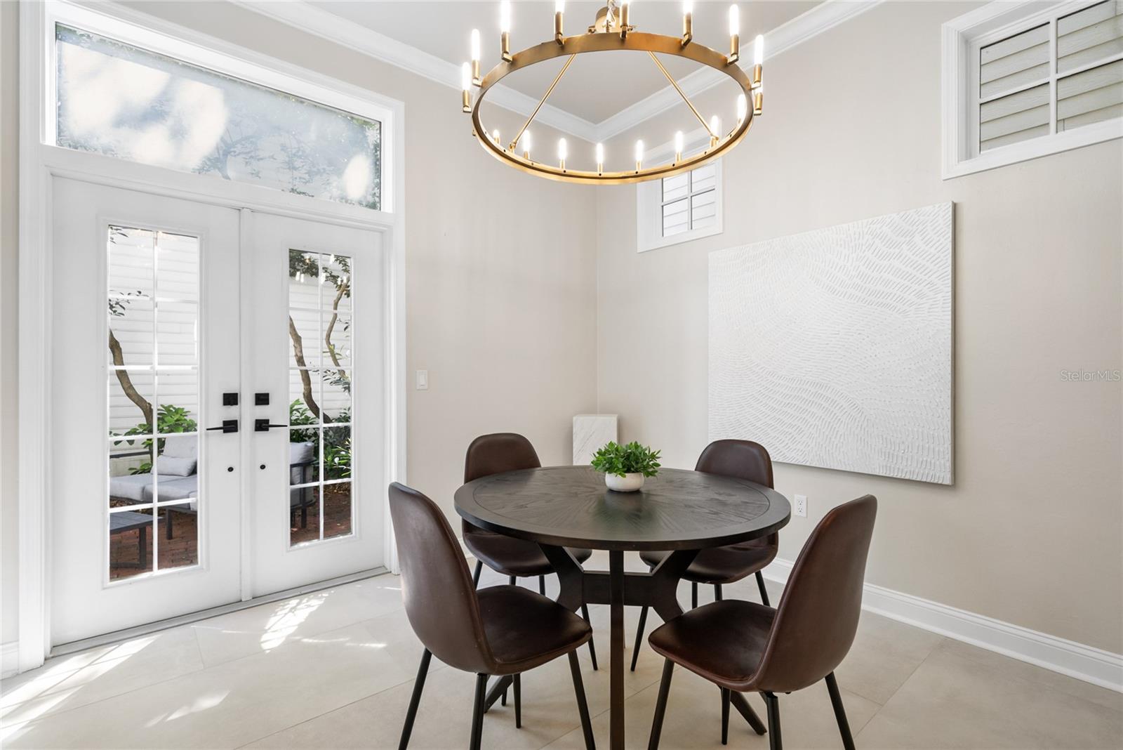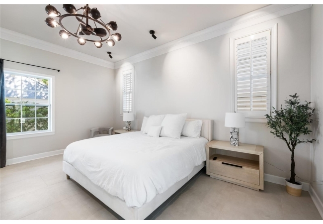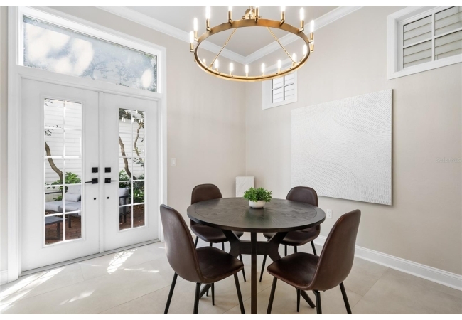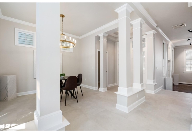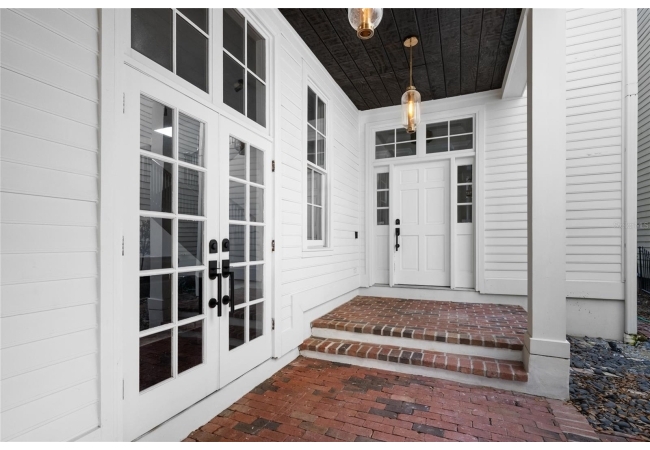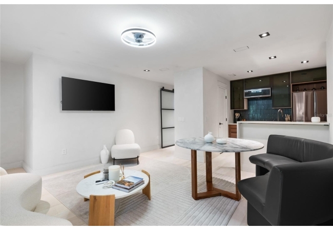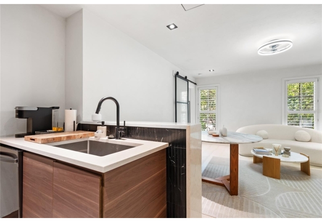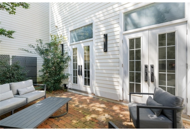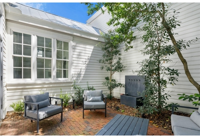 Inside the main home, enjoy soaring 10- and 12-foot ceilings, all-new flooring, bathrooms, appliances, and custom finishes throughout. A striking iron and glass front door opens into a private front courtyard. The spacious layout provides serene courtyard views from both the kitchen and formal dining room, complemented by elegant French doors and professional outdoor lighting.