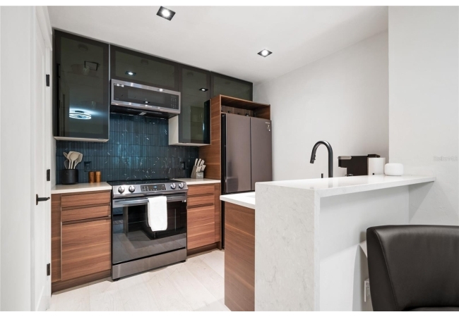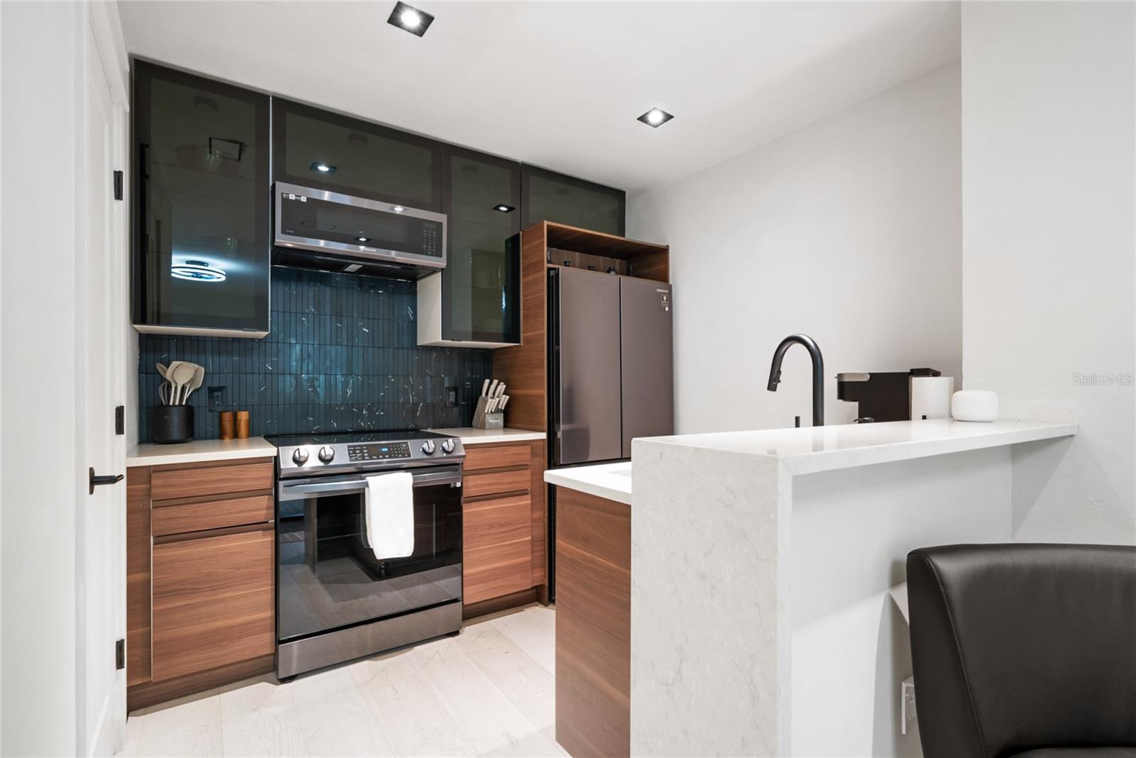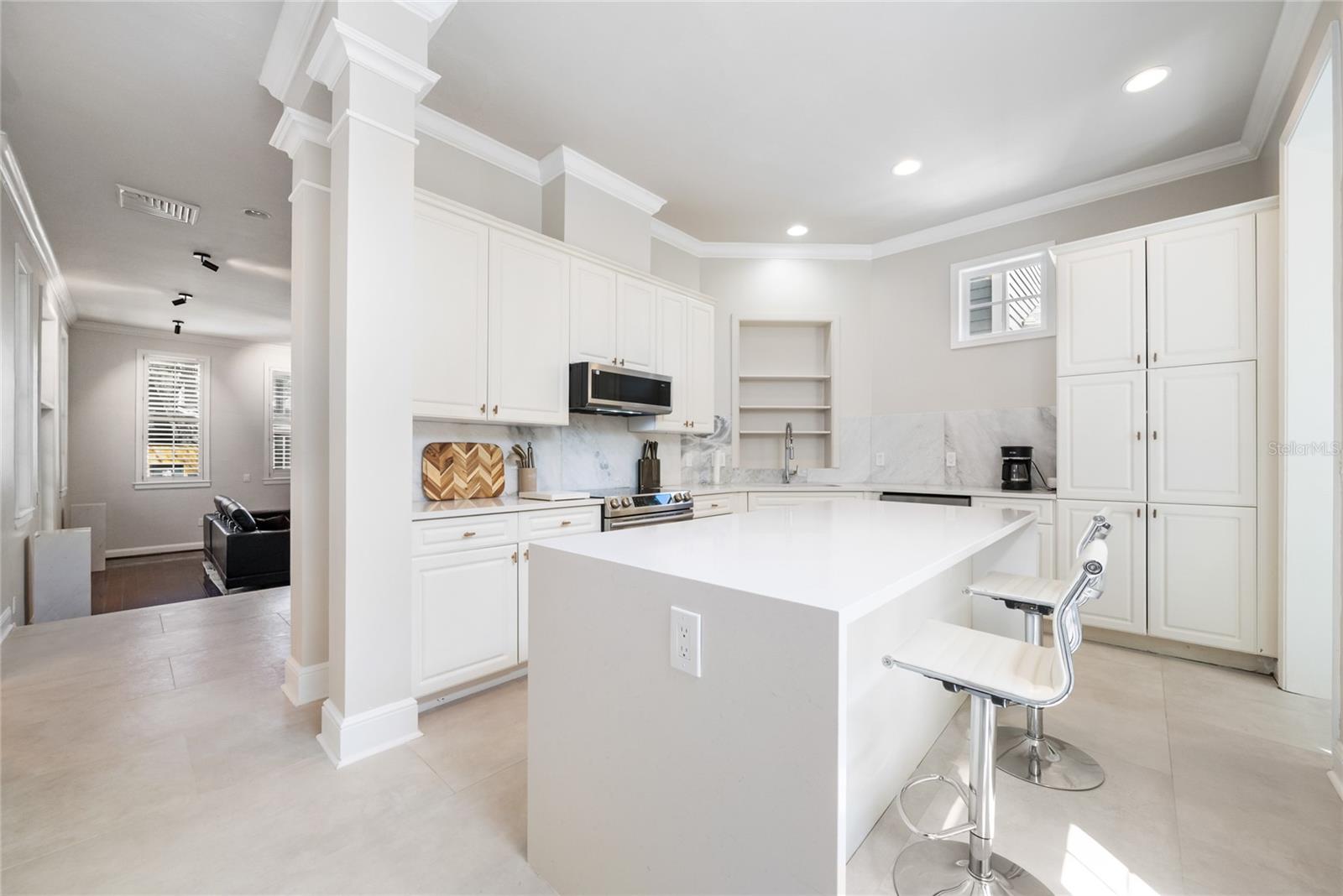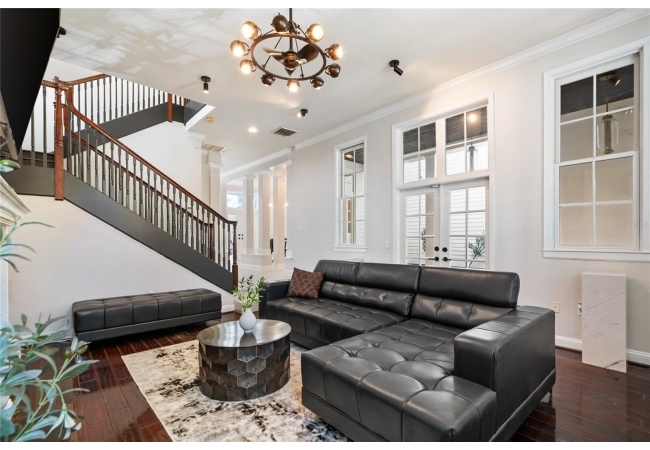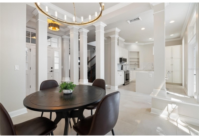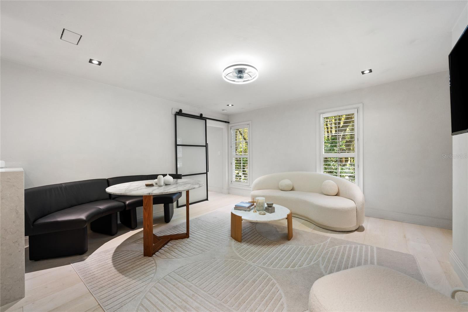 Inside the main home, enjoy soaring 10- and 12-foot ceilings, all-new flooring, bathrooms, appliances, and custom finishes throughout. A striking iron and glass front door opens into a private front courtyard. The spacious layout provides serene courtyard views from both the kitchen and formal dining room, complemented by elegant French doors and professional outdoor lighting.