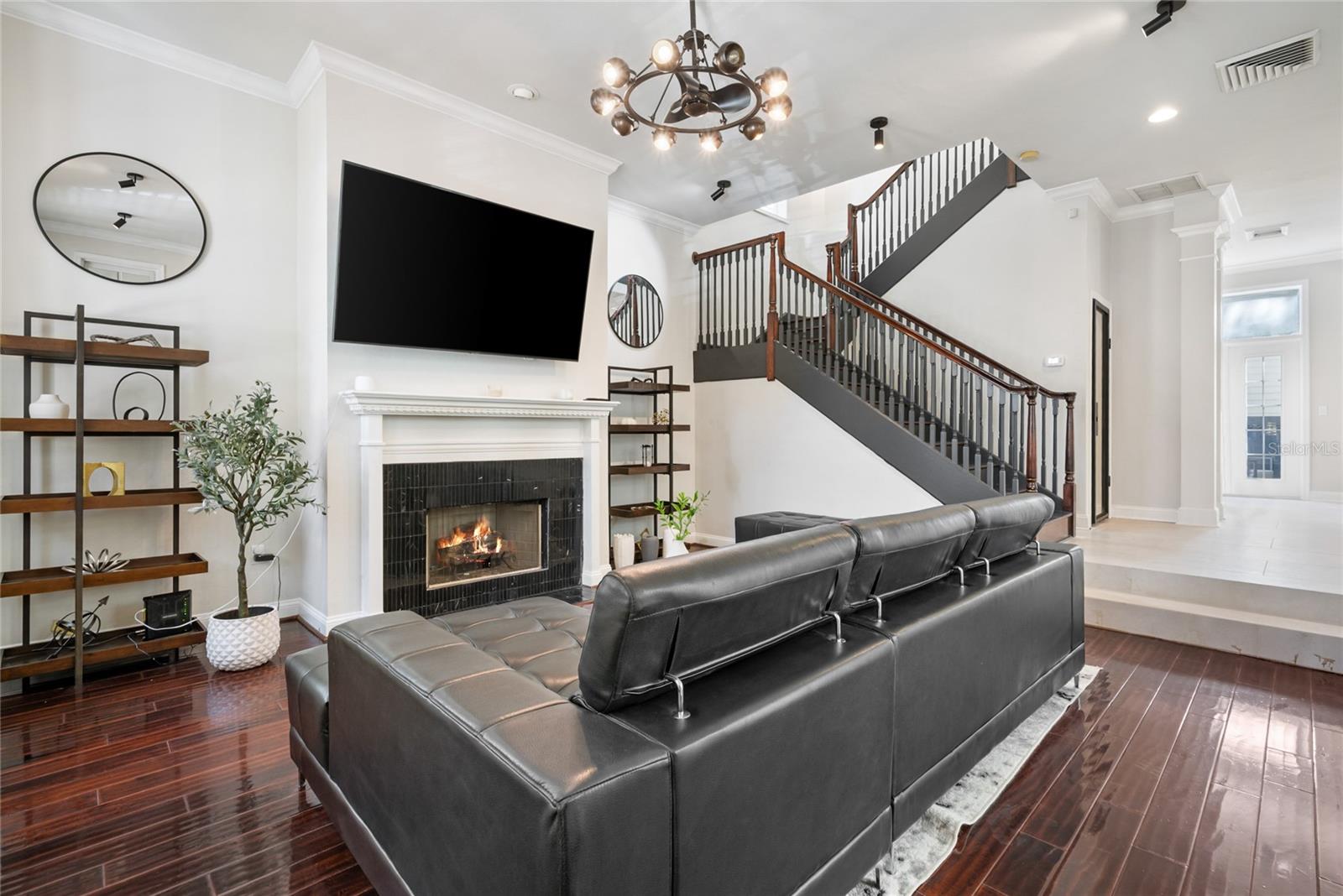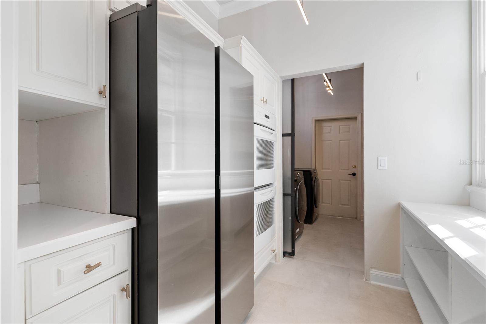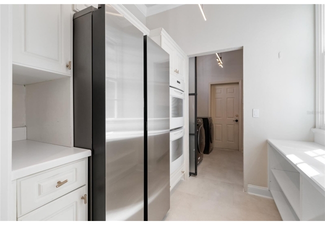 The kitchen is a true highlight, featuring three ovens, an expansive island, and a large butler’s pantry. The open family room includes a gas fireplace, and a convenient mudroom leads to an oversized two-car garage.