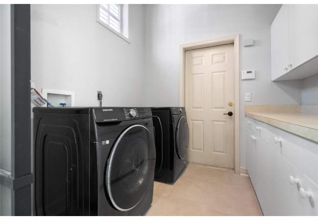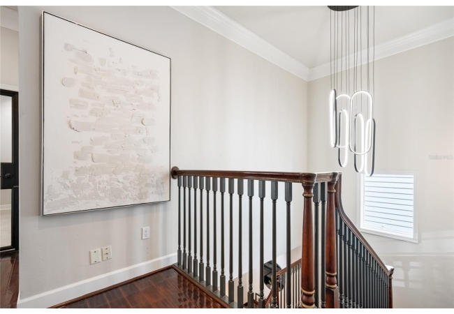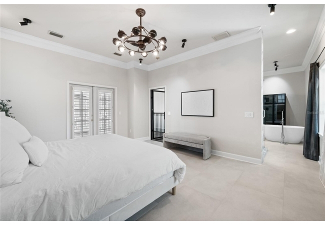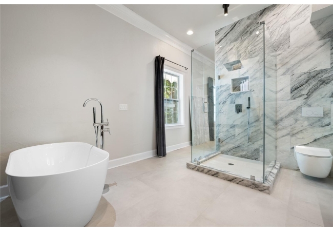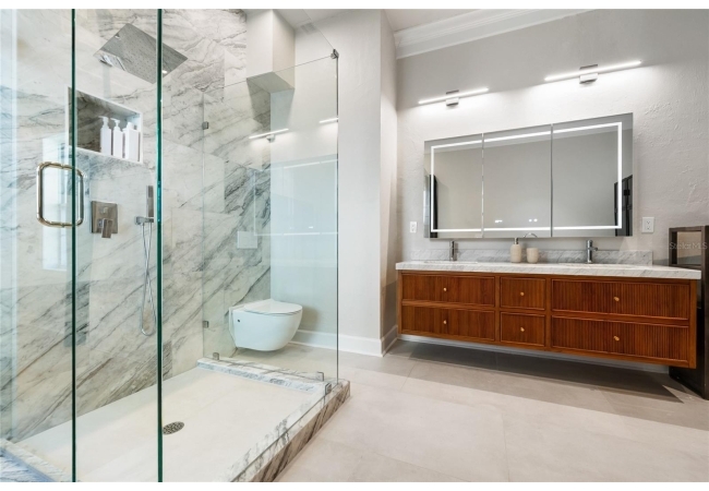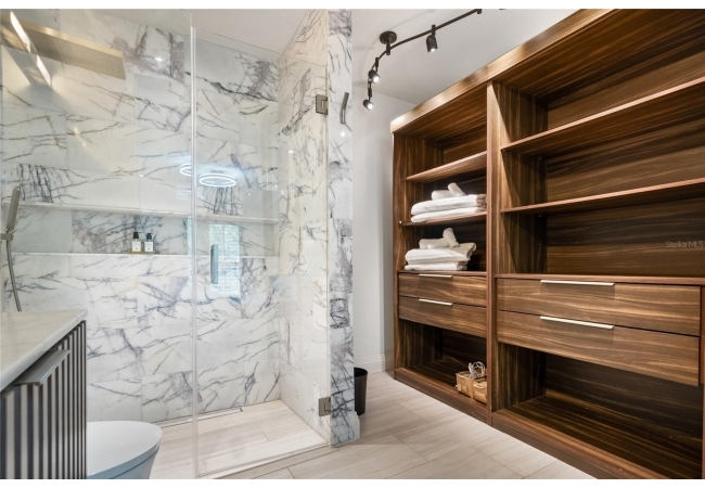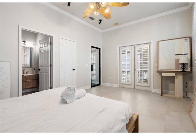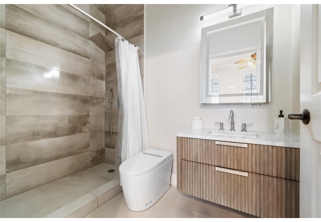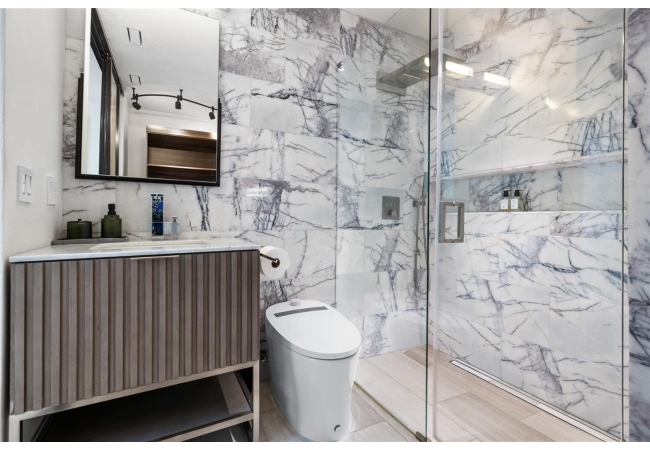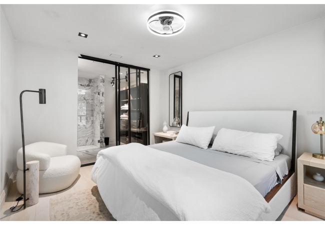 Upstairs, the primary suite opens to a private balcony overlooking a tranquil fountain and includes a luxurious en-suite bathroom with a glass walk-in shower and marble accent wall. A second bedroom also features its own en-suite bath and balcony access.