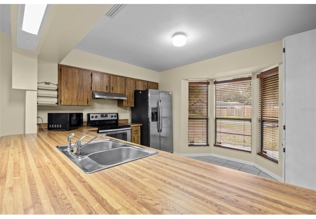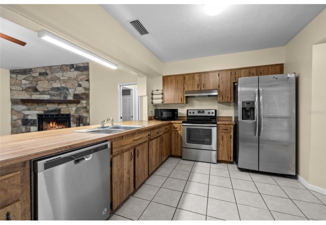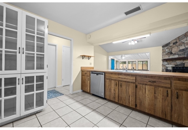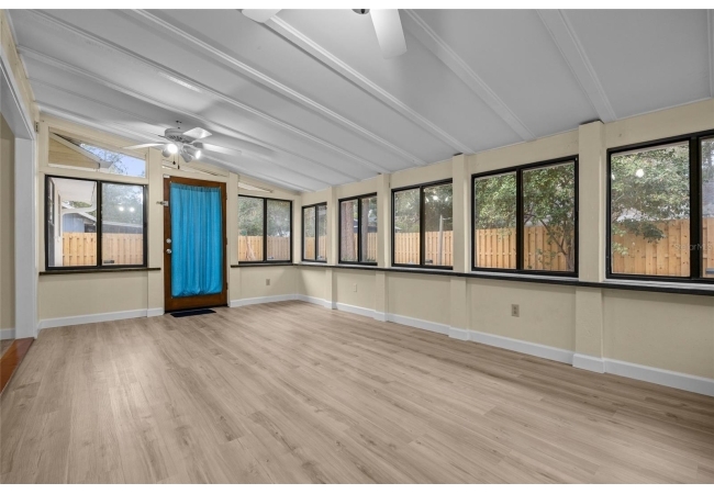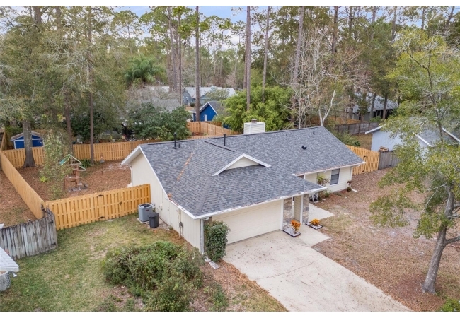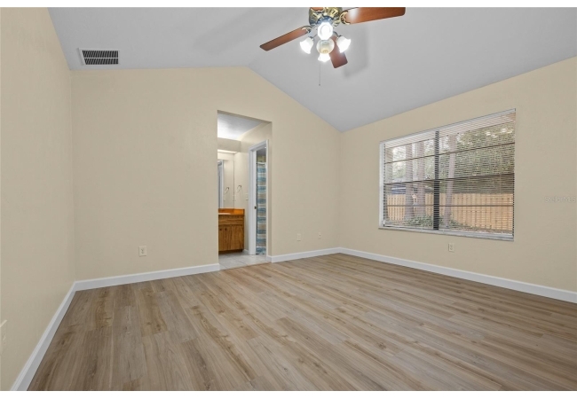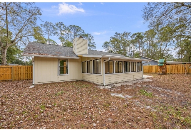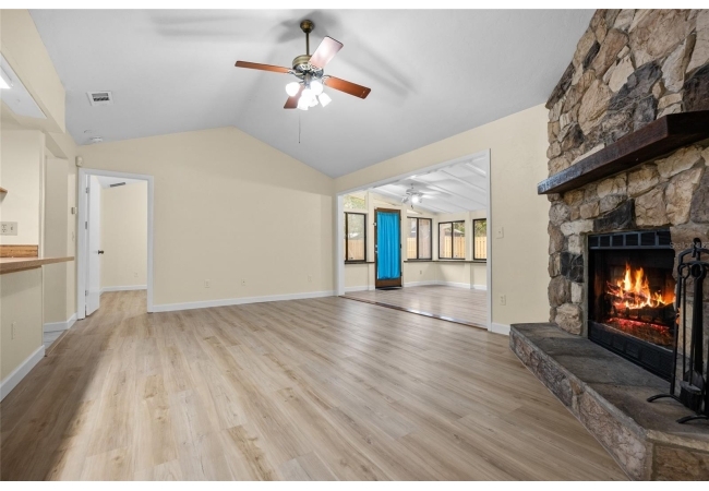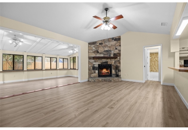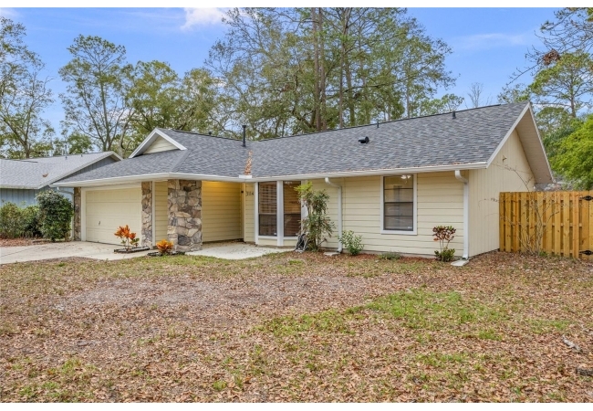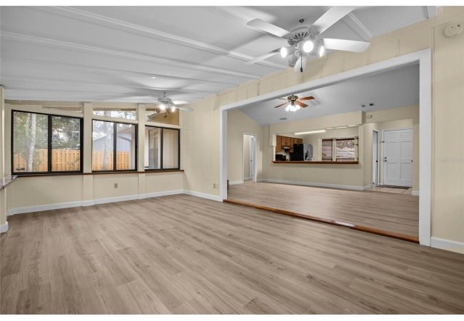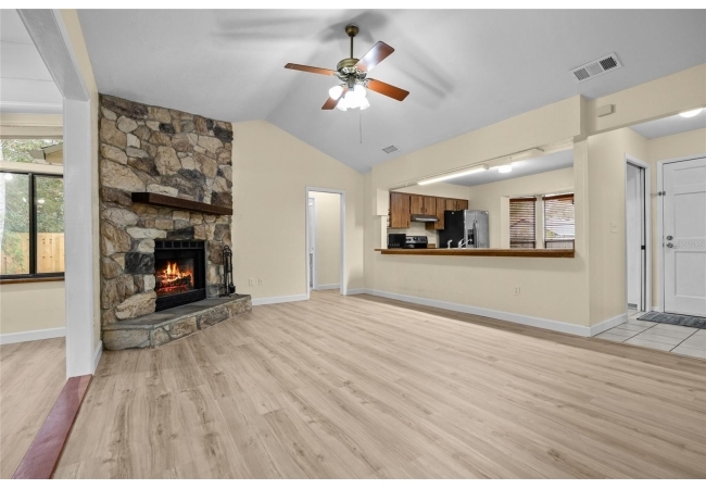 One or more photos were virtually staged (fire shown in fireplace). Step into a home where modern comfort meets effortless style in this beautifully updated NW Gainesville gem! This 3-bed, 2-bath residence features brand-new luxury vinyl plank flooring and fresh interior paint throughout. As you enter, you are greeted by an expansive great room with soaring vaulted ceiling and stunning wood-burning fireplace. Beyond the great room lies a sun-drenched Florida room with double-paned windows on three sides, offering peaceful views of the large backyard secured by new privacy fencing. Overlooking the heart of the home is the bright, open kitchen boasting a large breakfast bar, ample counter space, custom built-in pantry, stainless steel appliances, and charming breakfast nook with bay window. The primary suite serves as a private sanctuary, complete with its own vaulted ceiling, walk-in closet, and ensuite bath with walk-in shower. Two additional guest bedrooms and a full guest bath are tucked away on the opposite side of the home for maximum privacy. Outside, the spacious backyard provides a secure haven for outdoor living and entertaining. Nestled in a quiet, established neighborhood, this home offers the perfect balance of tranquility and convenience, located just minutes from top-rated schools, local parks, and vibrant NW Gainesville dining and shopping. With its modern updates and prime location, this one won't last long—schedule your tour today!