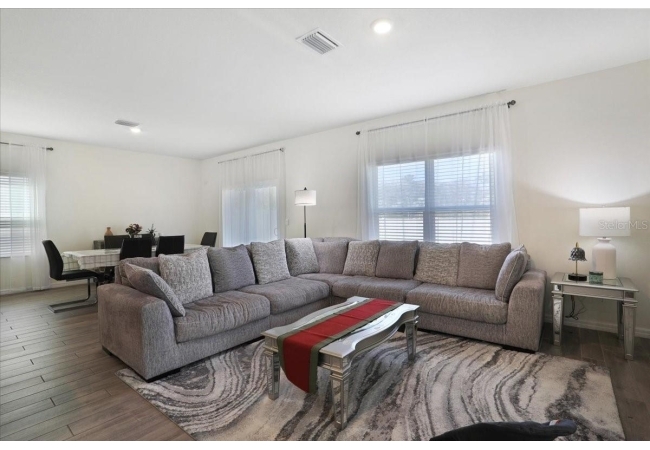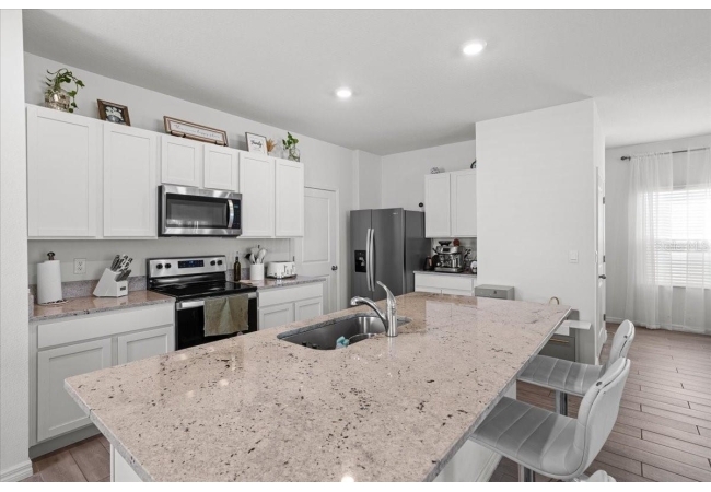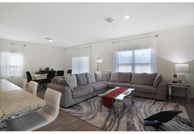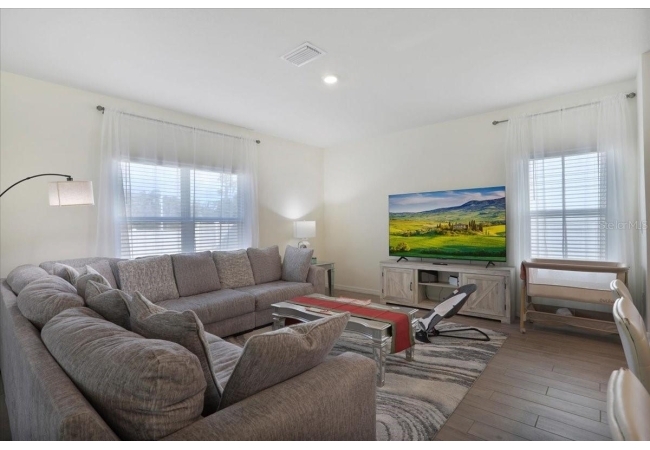 Inside, the four-bedroom, two-and-a-half-bath layout is carefully planned to support both connection and privacy. The ground floor is dedicated to open, welcoming living spaces — perfect for daily life and entertaining — while all bedrooms are located upstairs, creating a clear separation between active and restful areas. The open-plan living space is finished in a soft, neutral color palette that immediately feels airy and inviting, enhanced by abundant windows that fill the home with natural light throughout the day.