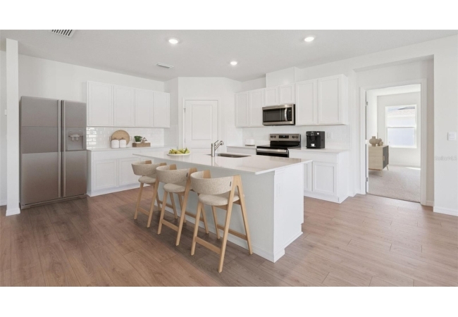 One or more photo(s) has been virtually staged. Under Construction. Step inside the Denham. The thoughtful design of this 4-bedroom and 3-bathroom home features an open-concept design perfect for all families. As you enter the heart of the home, the kitchen overlooks the great room and dining area that leads you outside to the covered lanai. Perfect for entertaining, the kitchen has a central island with quartz countertops, a walk-in pantry, and stainless-steel appliances. The primary bedroom is located near the dining room and has a walk-in closet and ensuite bathroom with a double vanity and quartz countertops. The other three bedrooms each have walk-in closets and have easy access to the second bathroom. The fourth bedroom has an ensuite bathroom and is next to the designated laundry room with ample counterspace and a utility sink. The Denham is complete with a state-of-the-art smart home system. Pictures, photographs, colors, features, and sizes are for illustration purposes only and will vary from the homes as built. Home and community information including pricing, included features, terms, availability and amenities are subject to change and prior sale at any time without notice or obligation. CRC057592.