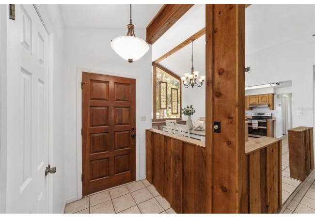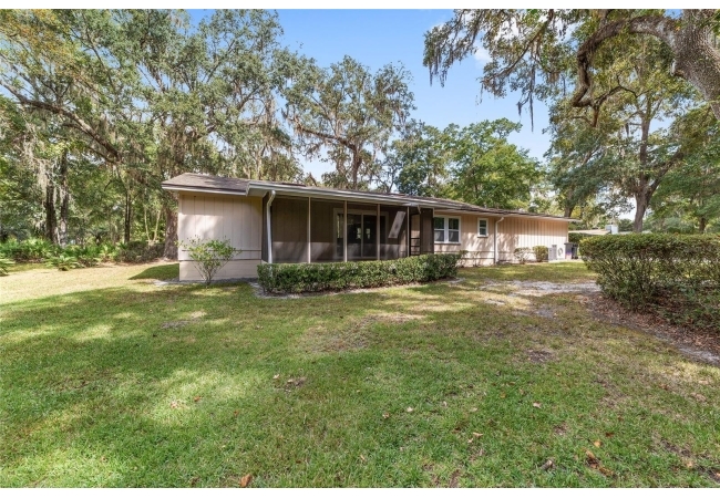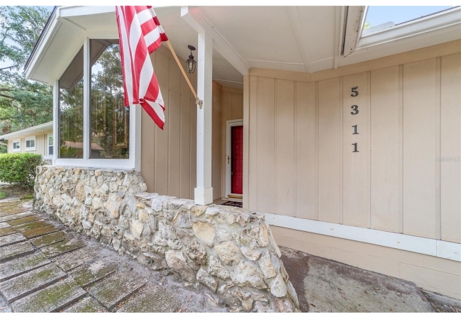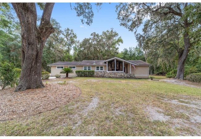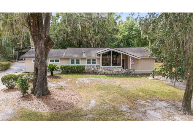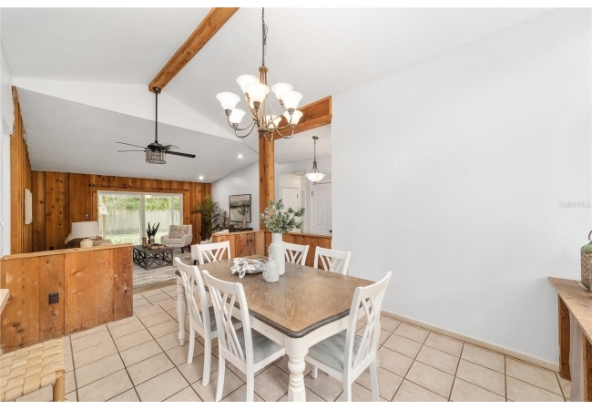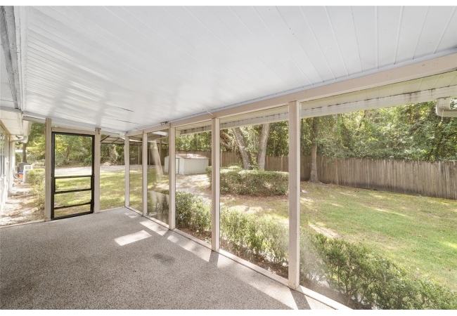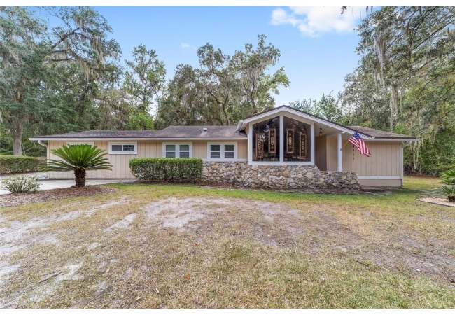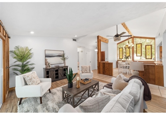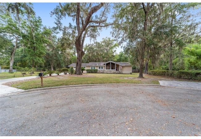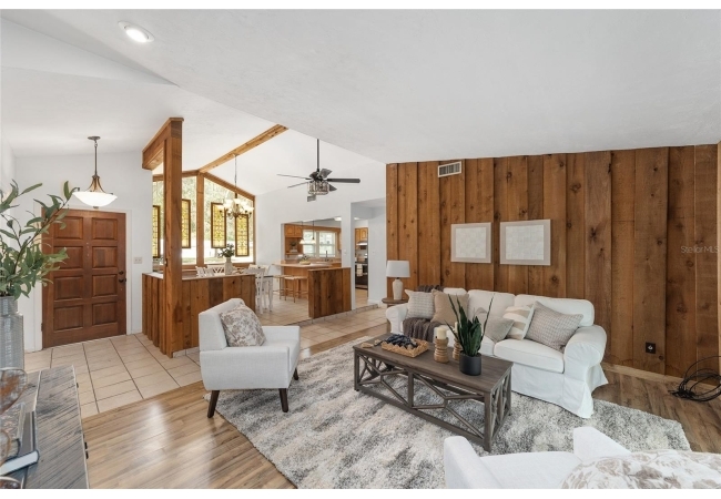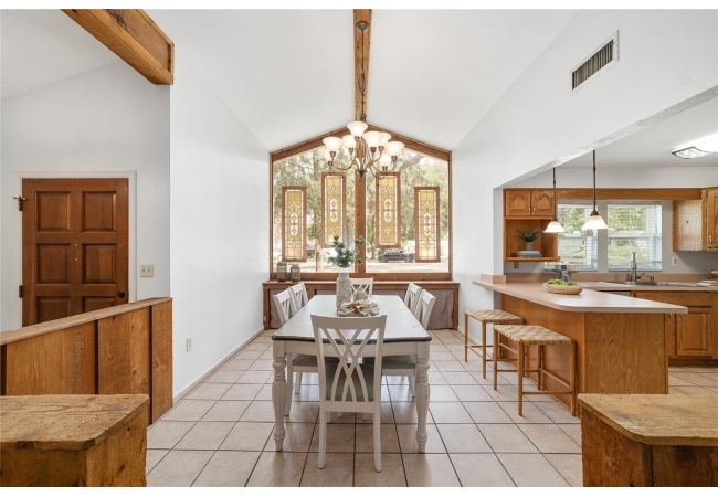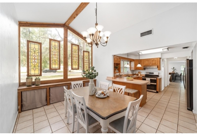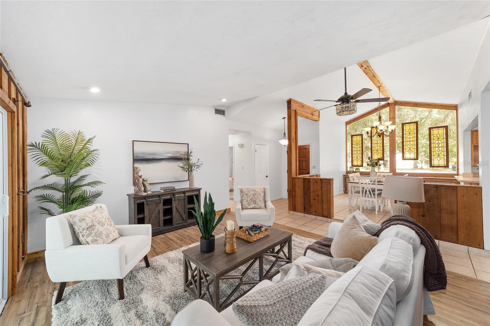 Tucked away on a private cul-de-sac, this expansive single-story residence makes an impression before the door even opens. The generous setback from the street, paired with mature shade trees, creates a peaceful first impression—an atmosphere of calm that extends throughout the property. Inside, character and craftsmanship unfold immediately. Timeless wood shiplap cladding accents the walls in warmth, while rustic exposed beams continue the story overhead, leading the eye upward toward the striking vaulted ceiling in the dining room. This space is a true showpiece: a dramatic wall of glass punctuated with elegant stained-glass windows that cast shifting light across the interior, creating a moment of artistry, style, and timeless drama. The kitchen is designed with simplicity and function in mind, allowing the architectural features of the home to shine while providing a highly usable workspace. Just beyond, the primary suite offers a private retreat where wide-plank flooring and cool-toned walls meet an abundance of natural light to form a calm, restorative setting. An attached ensuite completes the haven with convenience and comfort. Secondary bedrooms continue the same bright, airy feel, with generous proportions and ample closet storage. The living room carries forward the home’s rustic-luxury sentiment, anchored by beautifully crafted wood-beamed accent walls, with sunlight pouring in to highlight the room's inviting atmosphere. This area flows naturally through the kitchen into an open entertainment lounge, ideal for gatherings, creative pursuits, or quiet moments alike. Direct access to the outdoors enhances the experience, where through the living room, a screened sun porch provides a vantage point over the level backyard. With its generous lawn, mature trees, and sense of seclusion, this outdoor space offers endless potential for both quiet reflection and lively entertaining. Every element of this home works together to create an environment that feels expansive, inviting, and timeless. The combination of rustic craftsmanship, thoughtful proportions, and artistic touches sets it apart as a property that celebrates character and livability in equal measure.