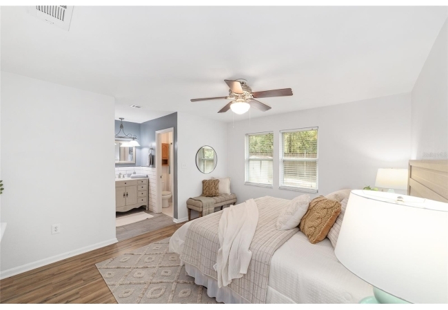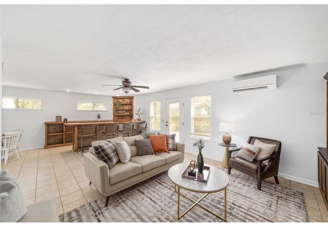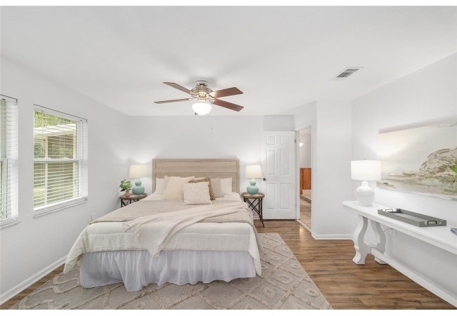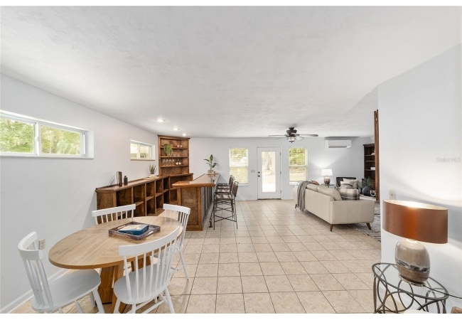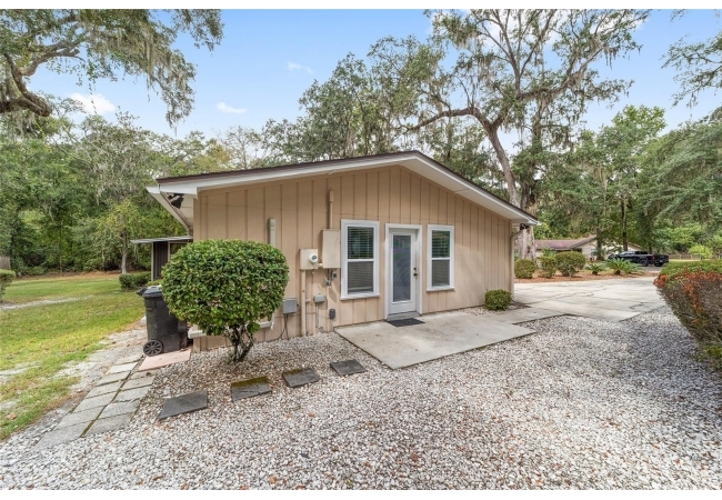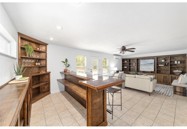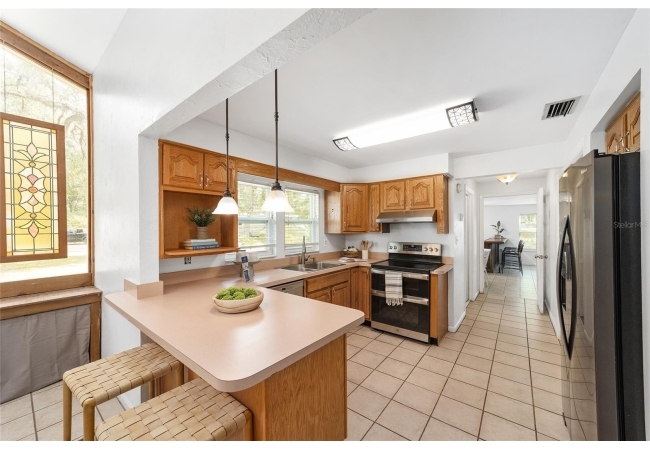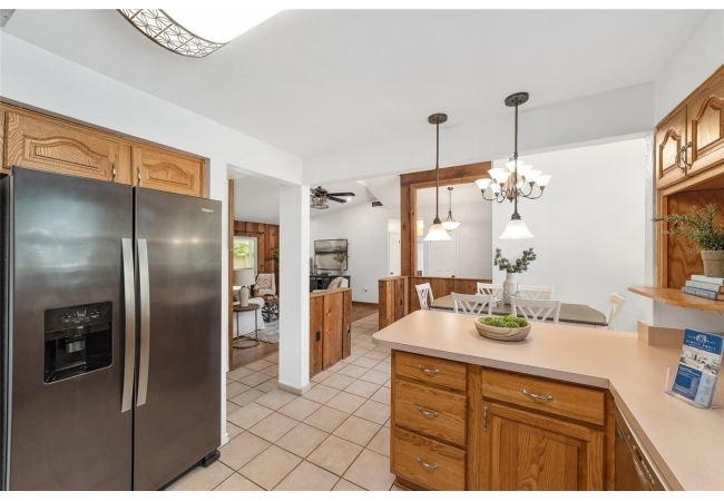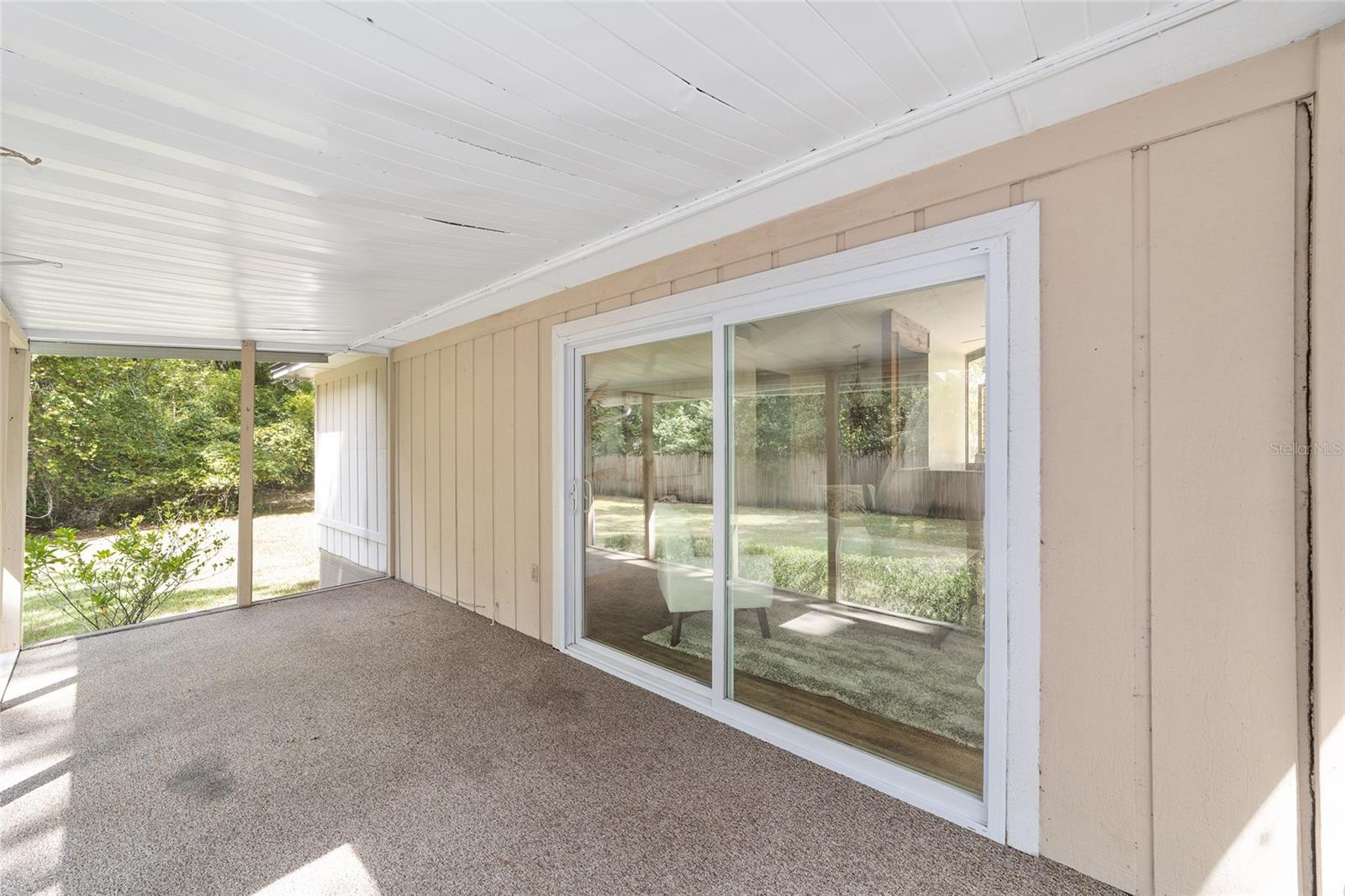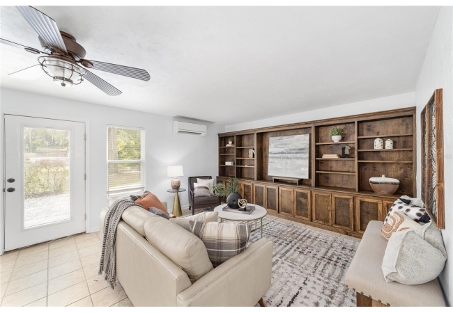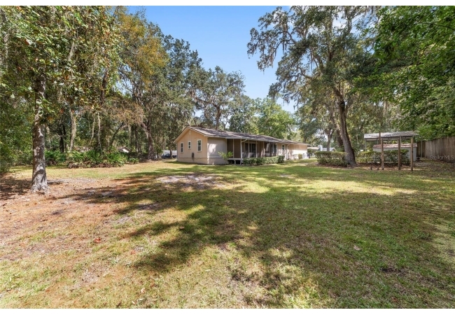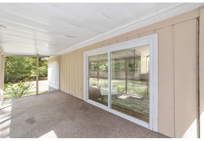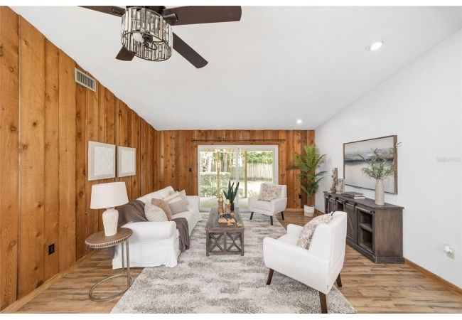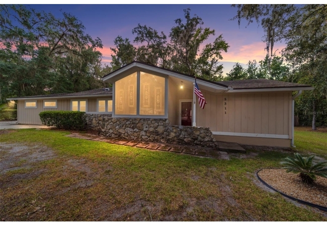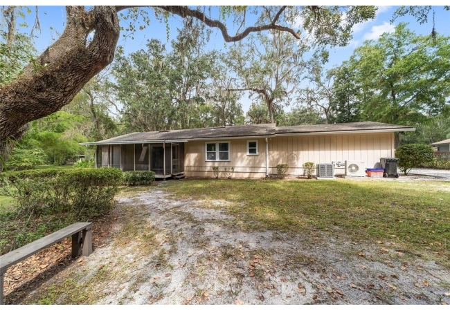 Tucked away on a private cul-de-sac, this expansive single-story residence makes an impression before the door even opens. The generous setback from the street, paired with mature shade trees, creates a peaceful first impression—an atmosphere of calm that extends throughout the property. Inside, character and craftsmanship unfold immediately. Timeless wood shiplap cladding accents the walls in warmth, while rustic exposed beams continue the story overhead, leading the eye upward toward the striking vaulted ceiling in the dining room. This space is a true showpiece: a dramatic wall of glass punctuated with elegant stained-glass windows that cast shifting light across the interior, creating a moment of artistry, style, and timeless drama. The kitchen is designed with simplicity and function in mind, allowing the architectural features of the home to shine while providing a highly usable workspace. Just beyond, the primary suite offers a private retreat where wide-plank flooring and cool-toned walls meet an abundance of natural light to form a calm, restorative setting. An attached ensuite completes the haven with convenience and comfort. Secondary bedrooms continue the same bright, airy feel, with generous proportions and ample closet storage. The living room carries forward the home’s rustic-luxury sentiment, anchored by beautifully crafted wood-beamed accent walls, with sunlight pouring in to highlight the room's inviting atmosphere. This area flows naturally through the kitchen into an open entertainment lounge, ideal for gatherings, creative pursuits, or quiet moments alike. Direct access to the outdoors enhances the experience, where through the living room, a screened sun porch provides a vantage point over the level backyard. With its generous lawn, mature trees, and sense of seclusion, this outdoor space offers endless potential for both quiet reflection and lively entertaining. Every element of this home works together to create an environment that feels expansive, inviting, and timeless. The combination of rustic craftsmanship, thoughtful proportions, and artistic touches sets it apart as a property that celebrates character and livability in equal measure.